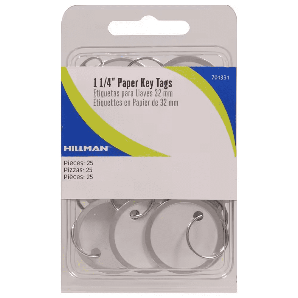 “Keep your keys classified and cohesive with this 25-pack of Hillman paper key tags with wire rings. The dual-sided paper tags grant the opportunity to categorize key collections and personalize each key to your preference and specification. Attractive silver-wire rings make attachment simple and give a coordinated look to an assortment of keys. The compact size means these Hillman paper key tags with wire rings fit into your key locker.”