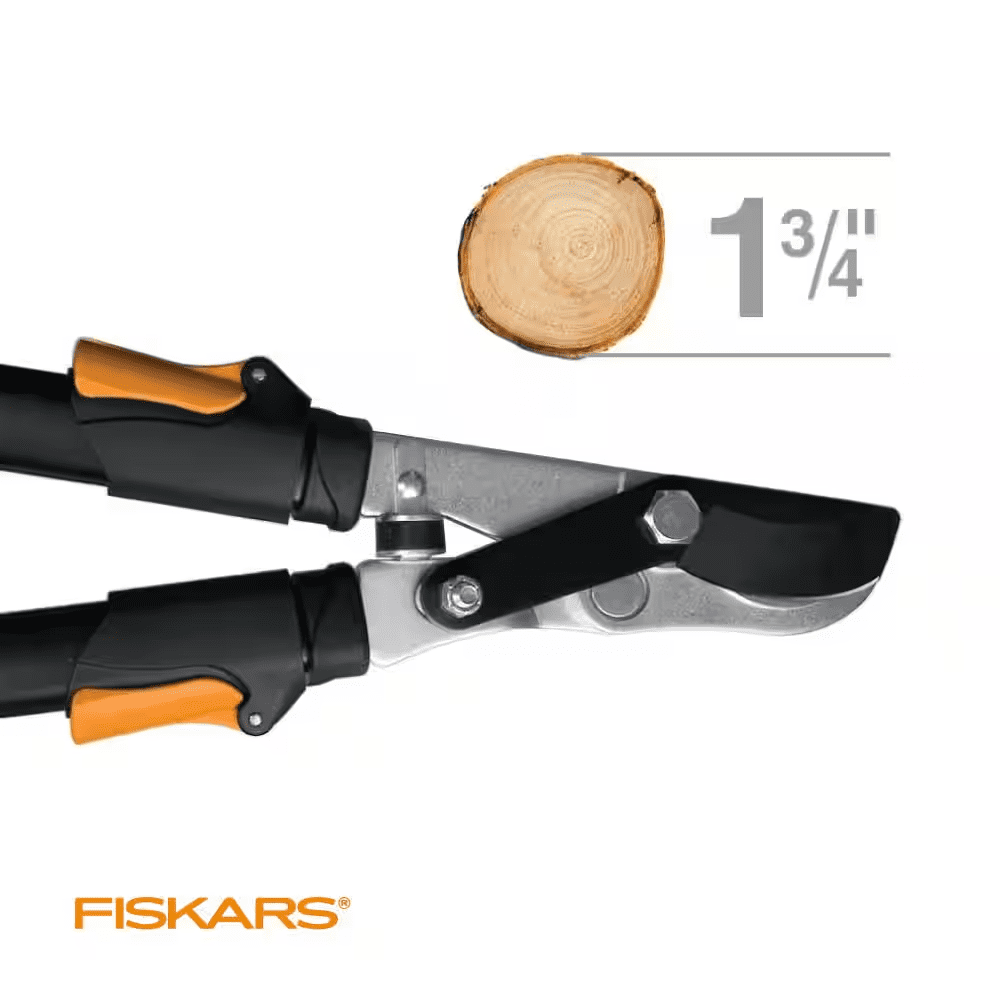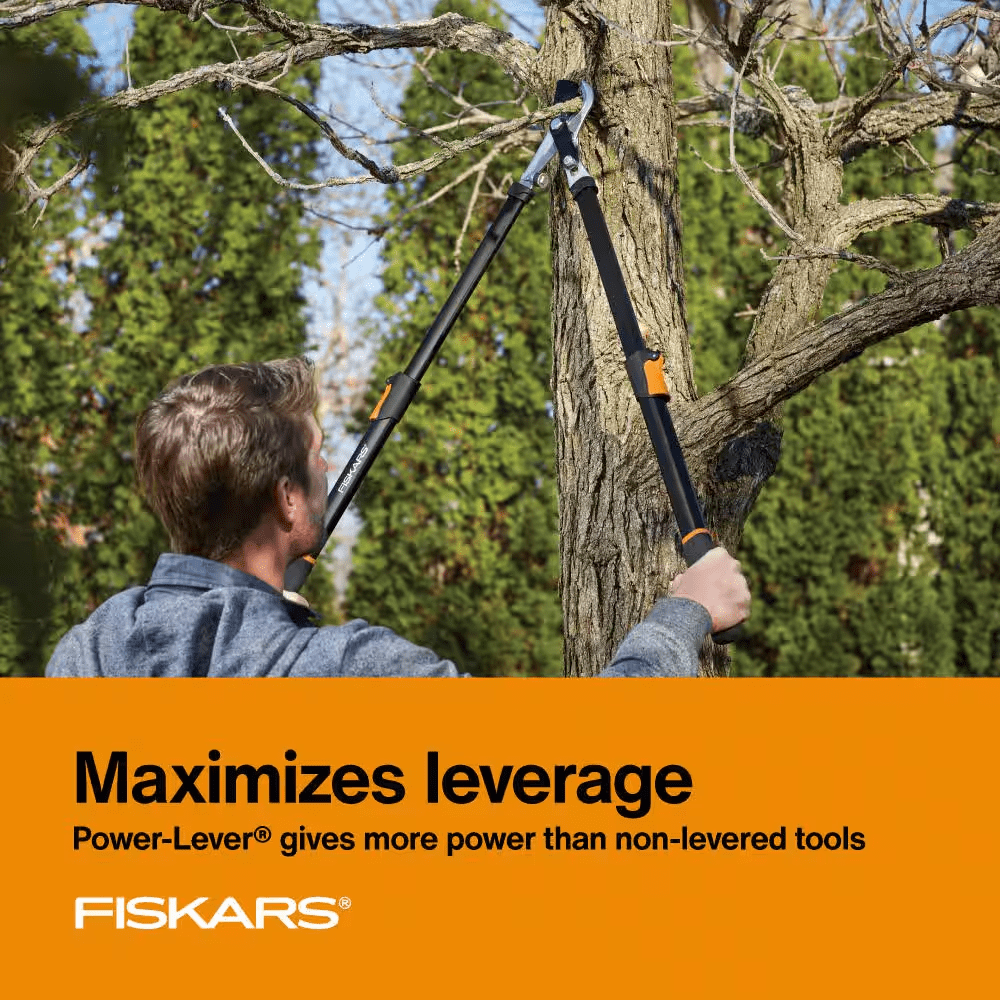 When you need to get the job done, trust Fiskars Power-Lever Extendable Lopper to help you reach high, thick branches comfortably and easily. The compound lever technology multiplies your leverage, giving you more cutting power than traditional single-pivot loppers. With a fully hardened, precision-ground steel blade that stays sharp, you can easily cut through branches up to 1-¾ in. thick. The low-friction blade coating ensures that every cut is smooth and prevents gumming from sap and debris. The extendable handles are made of strong yet lightweight steel and have a secure locking mechanism for added safety. The SoftGripTM touchpoints provide a secure and comfortable grip, reducing strain when reaching to cut high branches or pruning from awkward angles. The handle length can be adjusted from 25 – 37 in. .The blade is of the bypass-style, and provides a clean and healthy cut. Get the job done quickly and efficiently with the help of Fiskars Power-Lever Extendable Lopper.