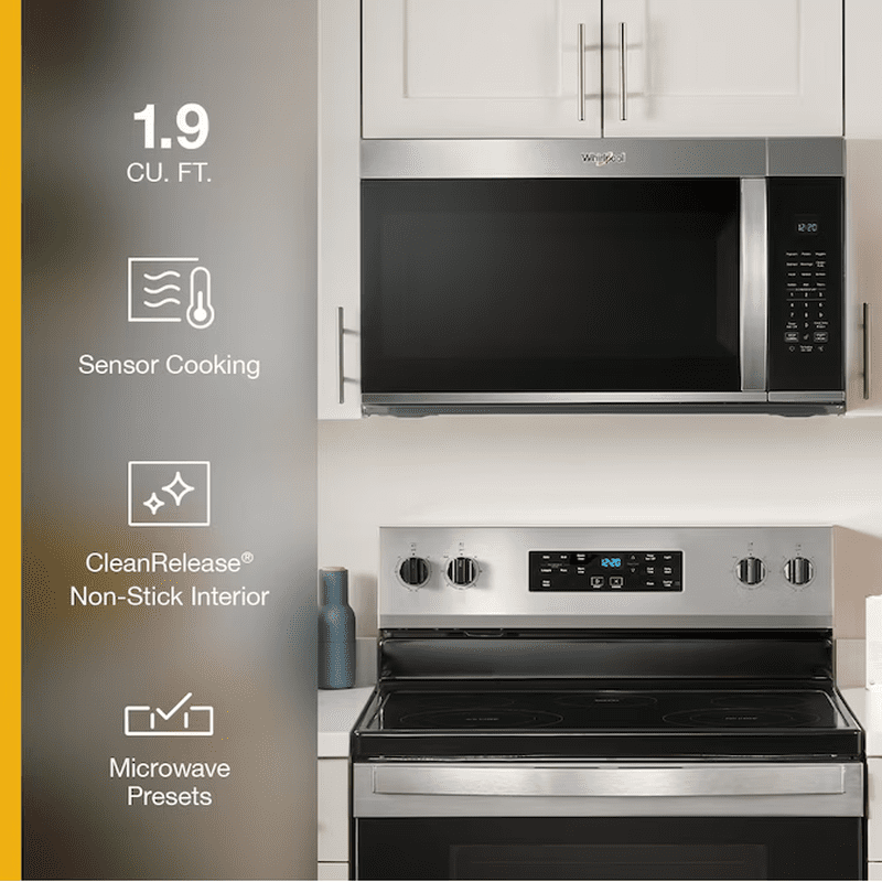 This 30 in W 1.9 cu. ft Whirlpool® over the range microwave keeps you ready for whatever the day brings.
