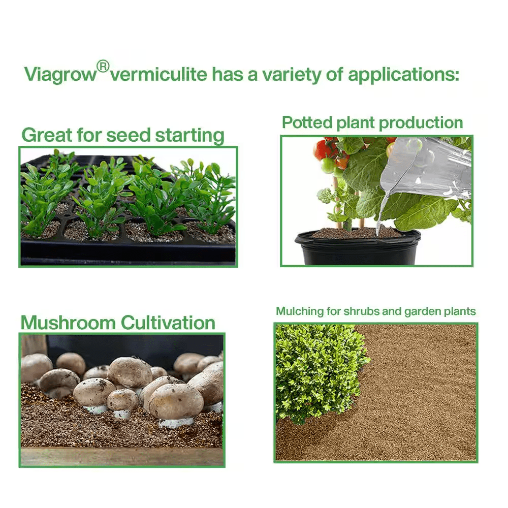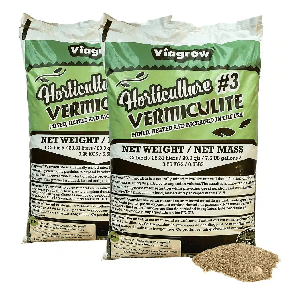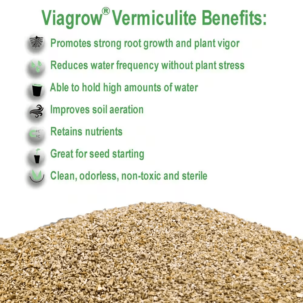 Viagrow Vermiculite is a natural soil amendment that promotes moisture retention and aeration in potting mixes and delivers vital elements to the plant roots resulting in better root development, growth rates and yields. Viagrow vermiculite can be mixed with Peat moss, mushroom compost, cactus soil, organic soil, bark, perlite, compost, coconut coir, worm casting, potting soil and just about any soil or soilless media. Viagrow Vermiculite #3 naturally attracts and holds positively charged ions, like potassium, magnesium, calcium, and ammonium, releasing these vital elements to the plant roots. It even contains potassium and magnesium, which are then available as a supplemental slow-release supply of essential nutrients. Vermiculite is great for container gardens, square foot gardening, raised bed gardens, green house mixes and hydroponic drip systems. Viagrow vermiculite #3 has been developed with Successful Growing in Mind with a negative charge, it provides an excellent cation-exchange capacity which promotes healthy bacteria in your growing media and attracts and holds positively charged ions, improves water retention, wettability, has pH stability in soilless mixtures and Exhibits greater particle strength. For a great soilless mix combine 30% Viagrow vermiculite VER4 with 30% Viagrow perlite VPER4 and 40% Viagrow coconut coir VCCB5.