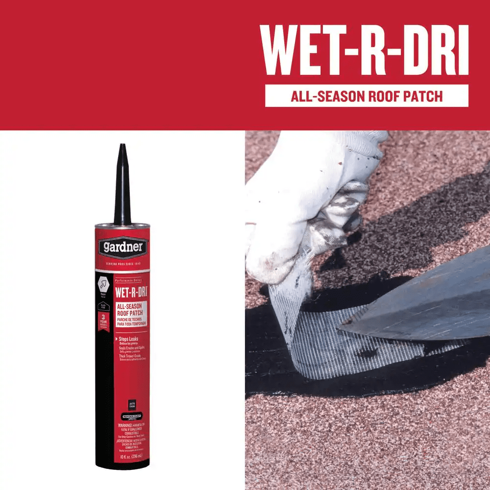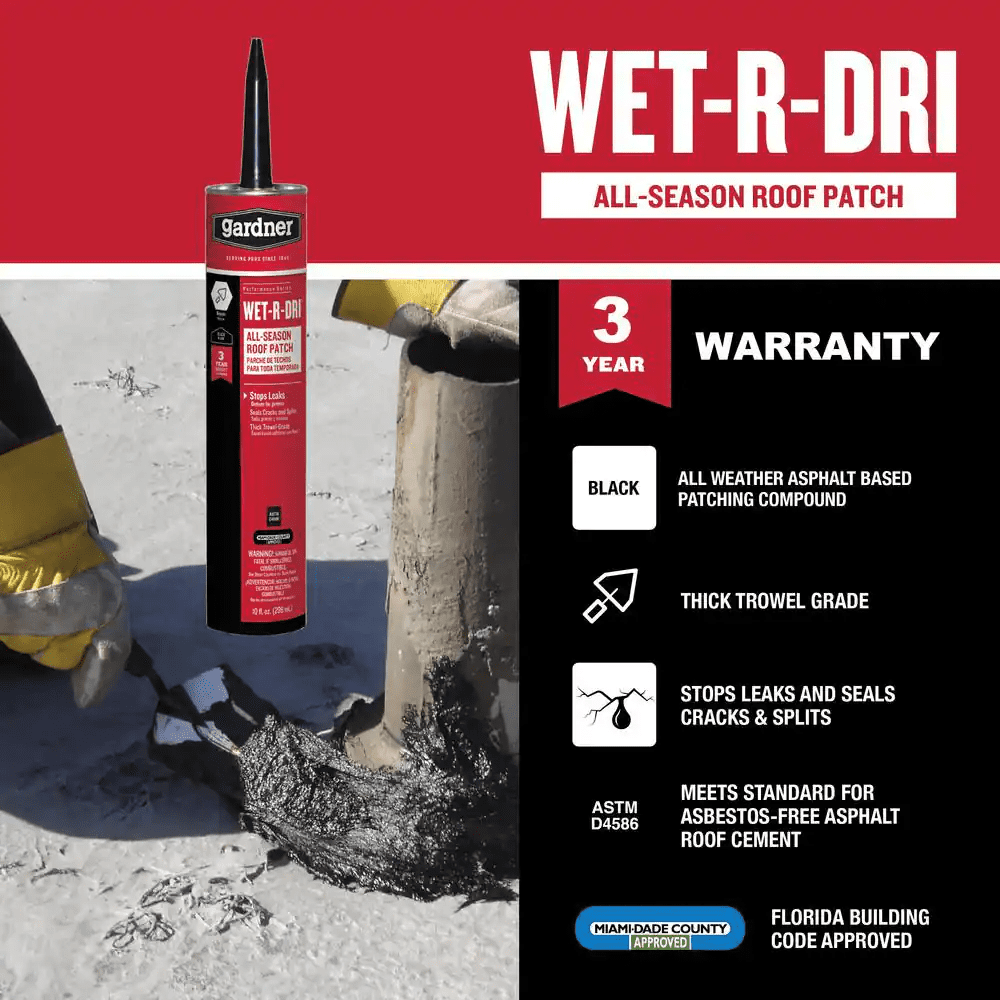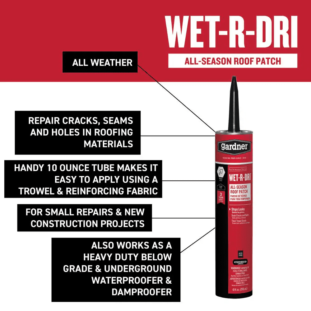 Stop leaks in your roof and repair holes, cracks, seams and more with Gardner-Gibson Wet-R-Dri All-Season Roof Cement. This roof patch seals damaged areas and provides a long-lasting layer of waterproof protection. It’s also effective in setting flashings or roofing material edges as well as dampproofing and waterproofing below-grade or underground surfaces. Use it around skylights, vents, exhaust pipes, chimneys, valleys and more. It’s easy to apply with a trowel or putty knife. Work the material to an even consistency over and into the area to be repaired. For best results, reinforce with a strip of Universal Patching Fabric. Follow all directions on label for application. Packaged in a 10-ounce tube.Gardner-Gibson is a full line manufacturer of roof, driveway and waterproofing coatings, caulks, spackles and wallpaper adhesives. We’ve been providing the pros with industry leading packaged coatings since 1945. Committed to innovation, we’ve developed more patents than any competitor in the industry and we continue to focus on minimizing our impact to the environment while developing new products to serve our customer’s needs.