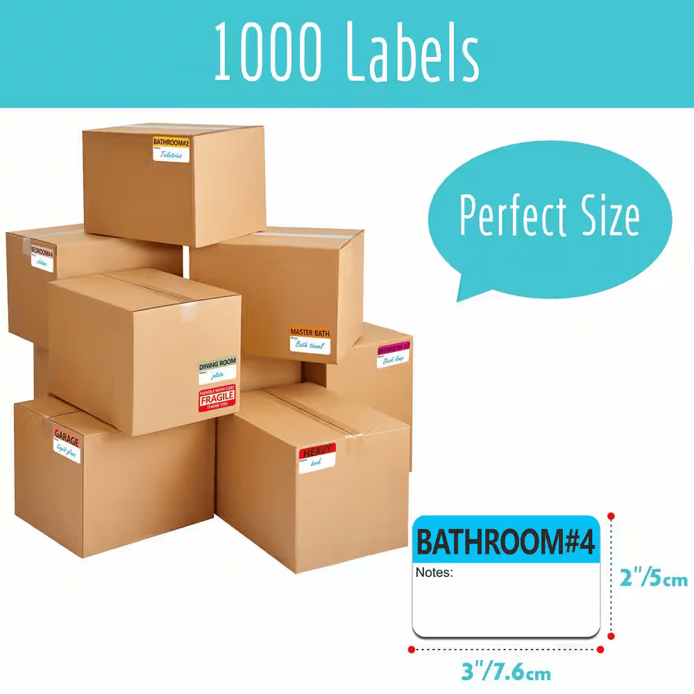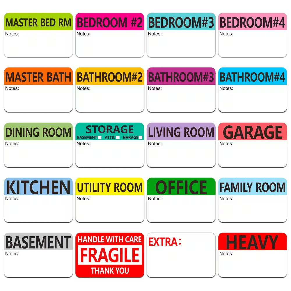 Introducing our comprehensive and versatile labeling solution designed specifically for home movers. This value pack boasts 1000 colorful labels, neatly arranged on 50 sheets, each measuring 2″ x 3″ for optimal visibility and handling. With 20 unique designs tailored for 11 room types, including bedrooms, bathrooms, dining room, and more, plus special labels for fragile, extra, and heavy items, it caters to a multitude of labeling needs. Crafted with premium quality, the labels feature high-light solid decals printed with eco-friendly vegetable oil-based ink and backed by a permanent adhesive that ensures durability and clarity throughout the moving process.The practical design incorporates larger black fonts on bright backgrounds for instant recognition, facilitating efficient sorting and unpacking. Room-specific color-coding and writable spaces that allow for customization with markers or pens further enhance usability. These self-adhesive stickers adhere securely to various surfaces, such as corrugated boxes and plastic cases, but should be avoided on smooth surfaces like mirrors or furniture due to their strong adhesive.In summary, this labeling system is an indispensable tool for anyone undertaking a home move, offering a time-saving and energy-efficient solution to organize and identify belongings with ease.