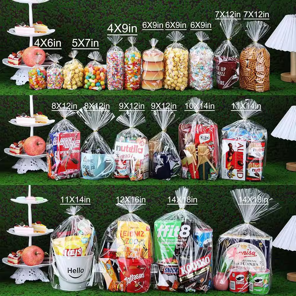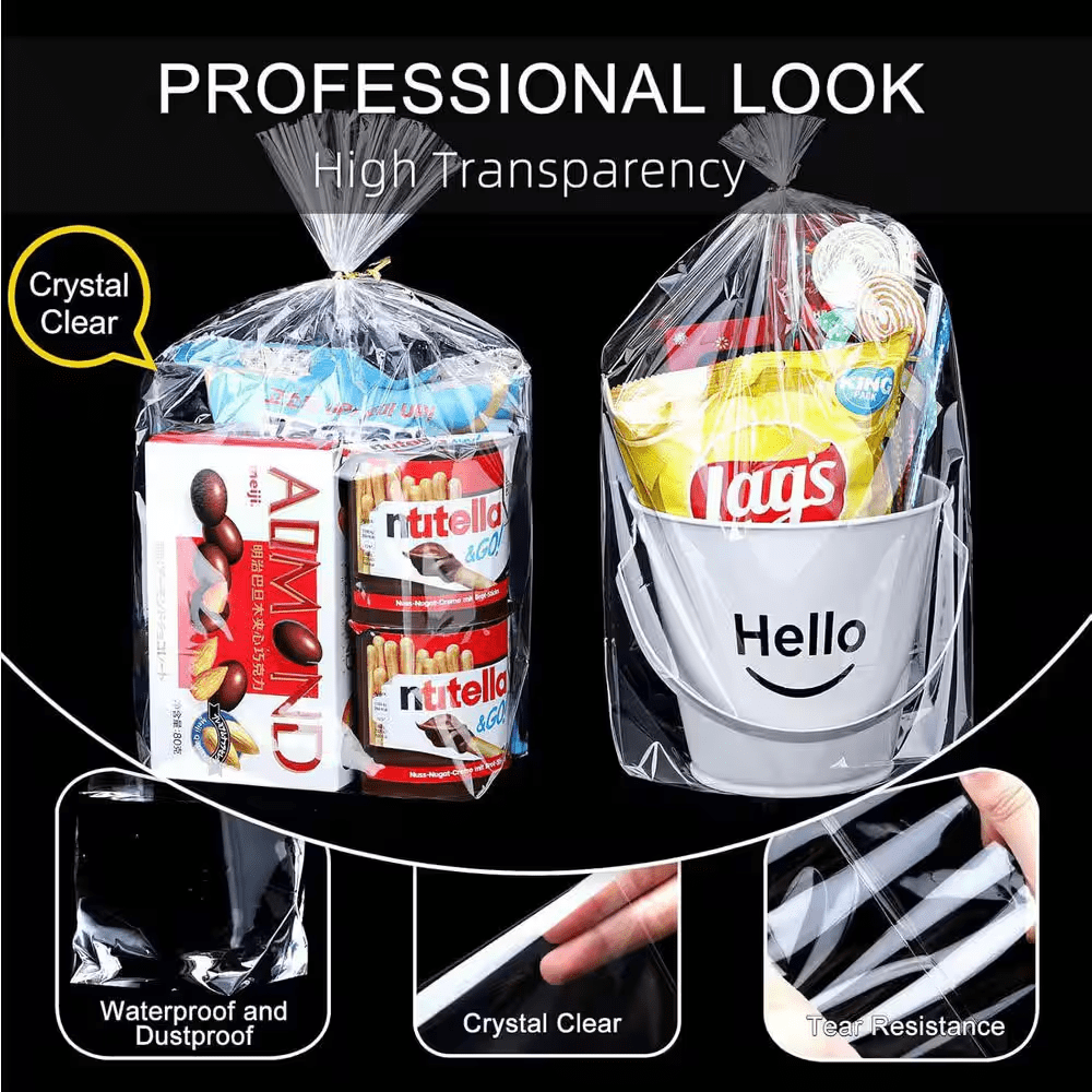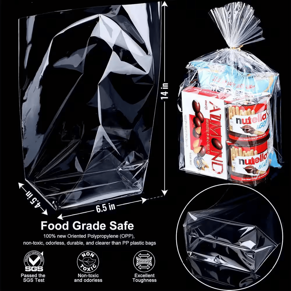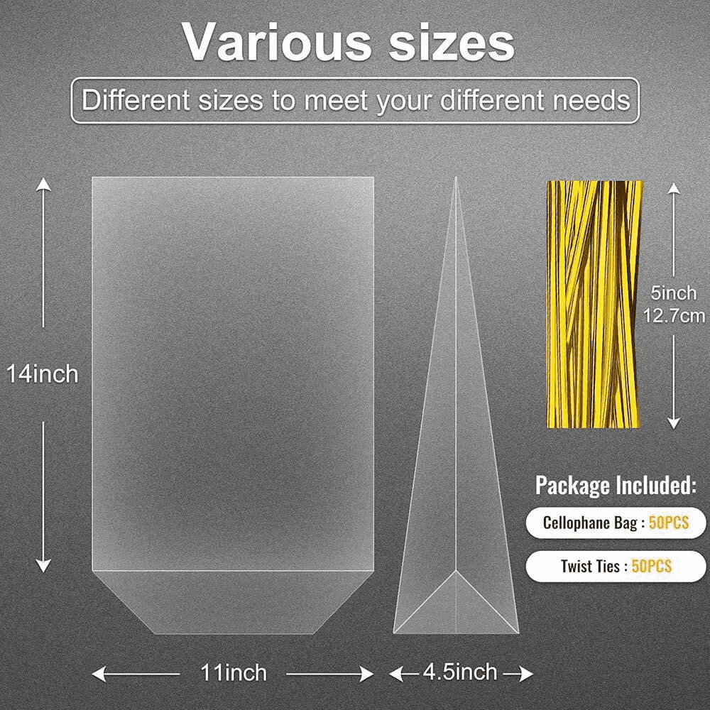 Elevate your gift presentations with these 11X14 clear cellophane bags that feature a convenient bottom gusset for effortless upright standing and an elegant gold twist tie. Crafted from 100% new Oriented Polypropylene, these bags are food-grade safe, odorless, and boast superior vapor-blocking properties to keep your treats fresh. With their crystal-clear and thickened design, these durable bags provide a professional and attractive look, perfect for showcasing party favors, baked goods, and gifts at any special occasion.