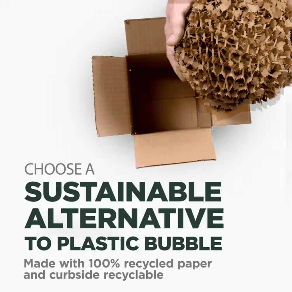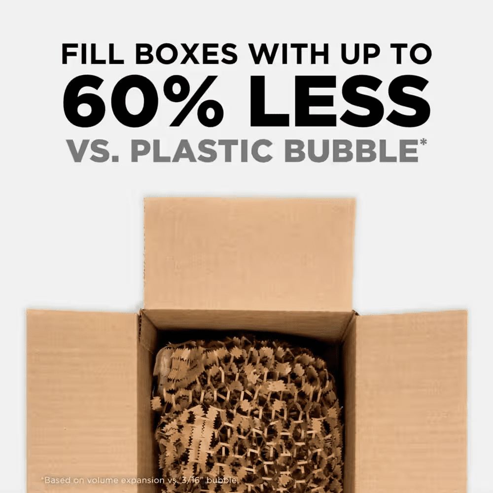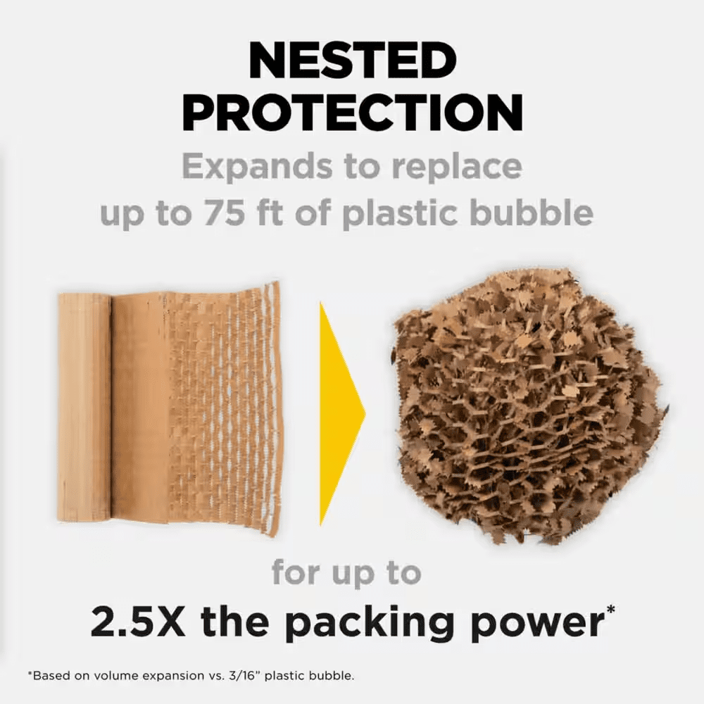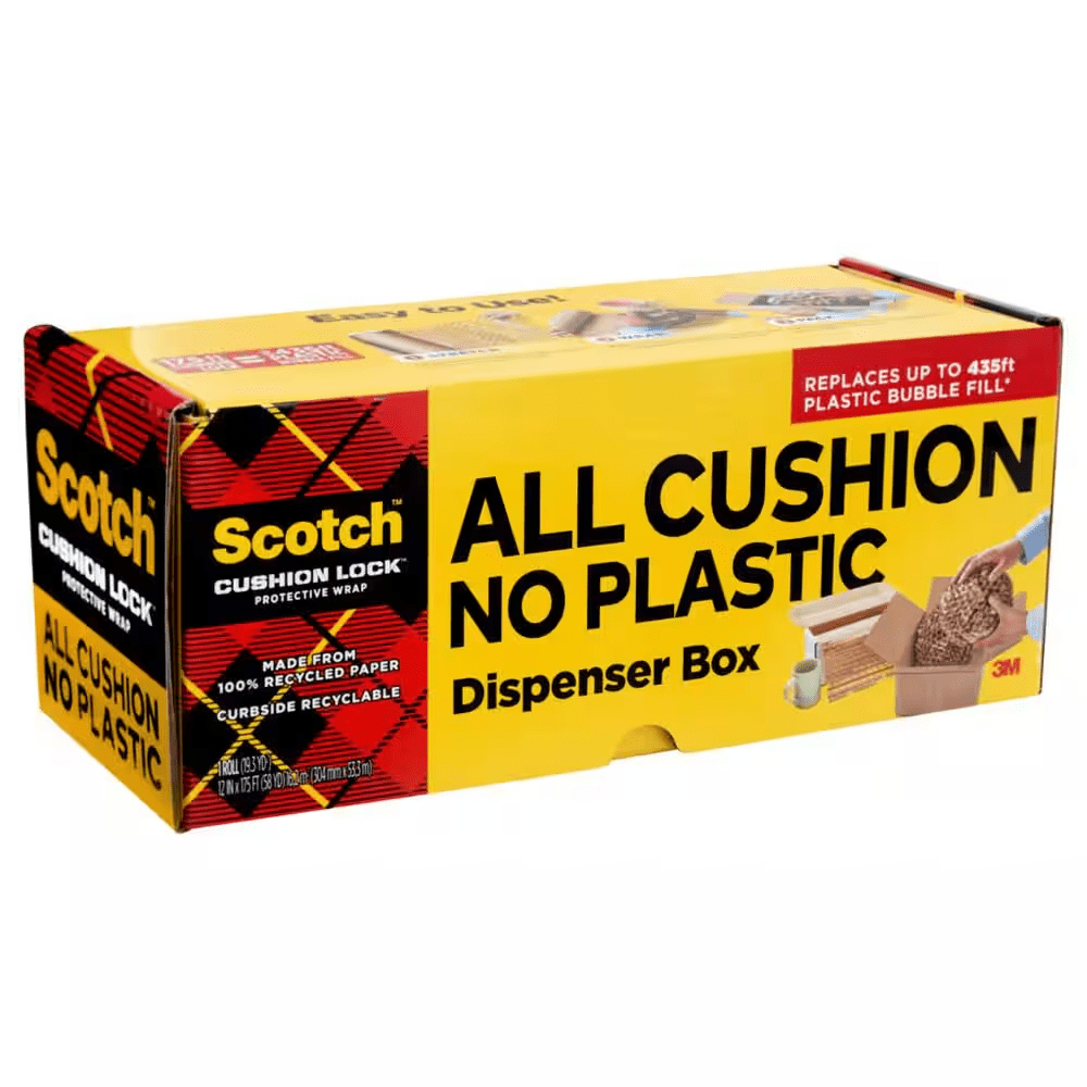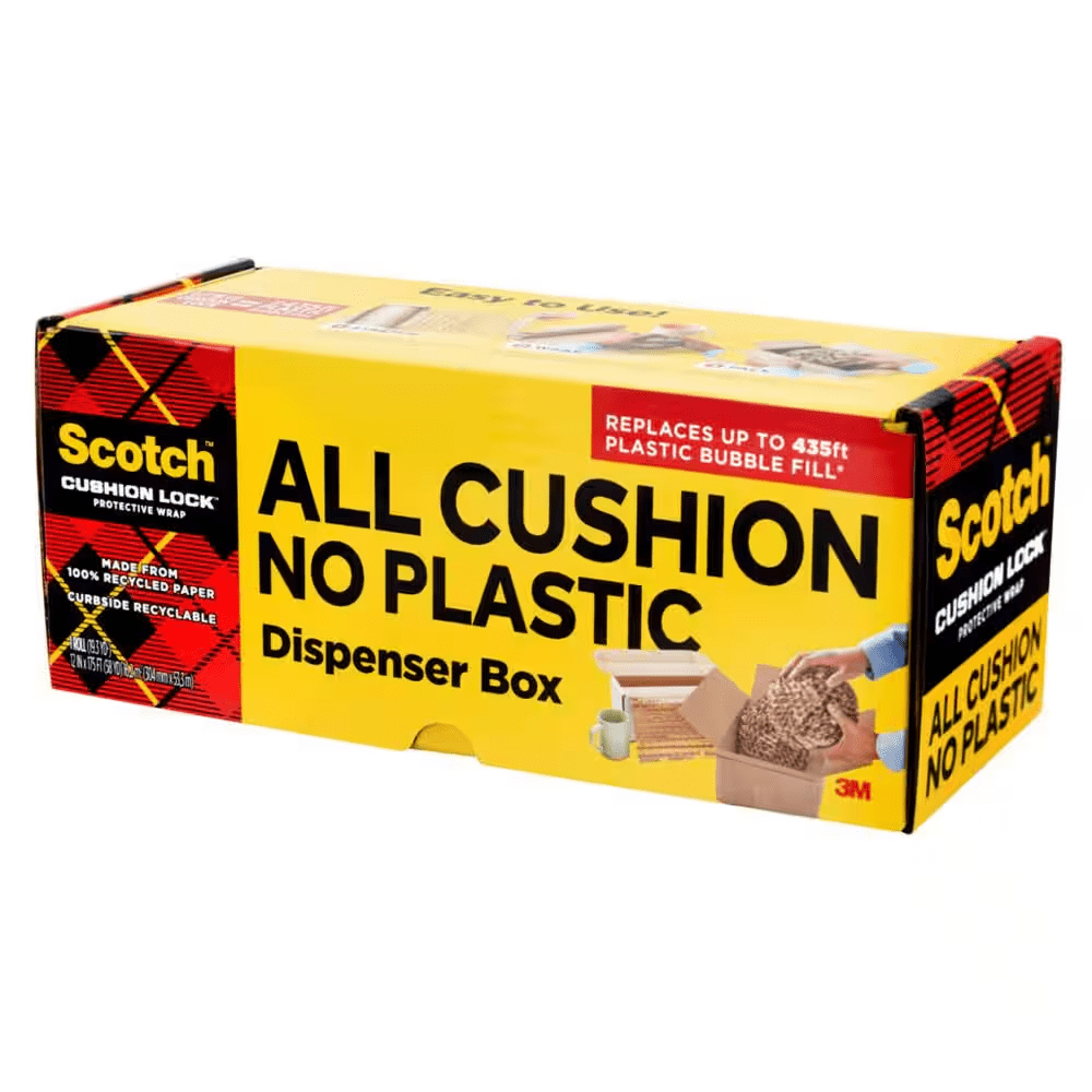 Now you can package your items with the confidence of protection, without the guilt of plastic. Scotch Cushion Lock is an expanding paper wrap made with 100% recycled paper that delivers proven protection, using up to 60% less vs. plastic bubble to fill a box. How. One 175 ft. roll expands to do the work of 435 ft. of plastic bubble – just stretch, wrap in 360°, and pack in nested protection. With its proprietary self-locking design, you don’t need tape to secure or scissors to cut. Once delivered, just recycle with ease, to fill a cubic foot box vs. standard 3/16 in. plastic bubble.