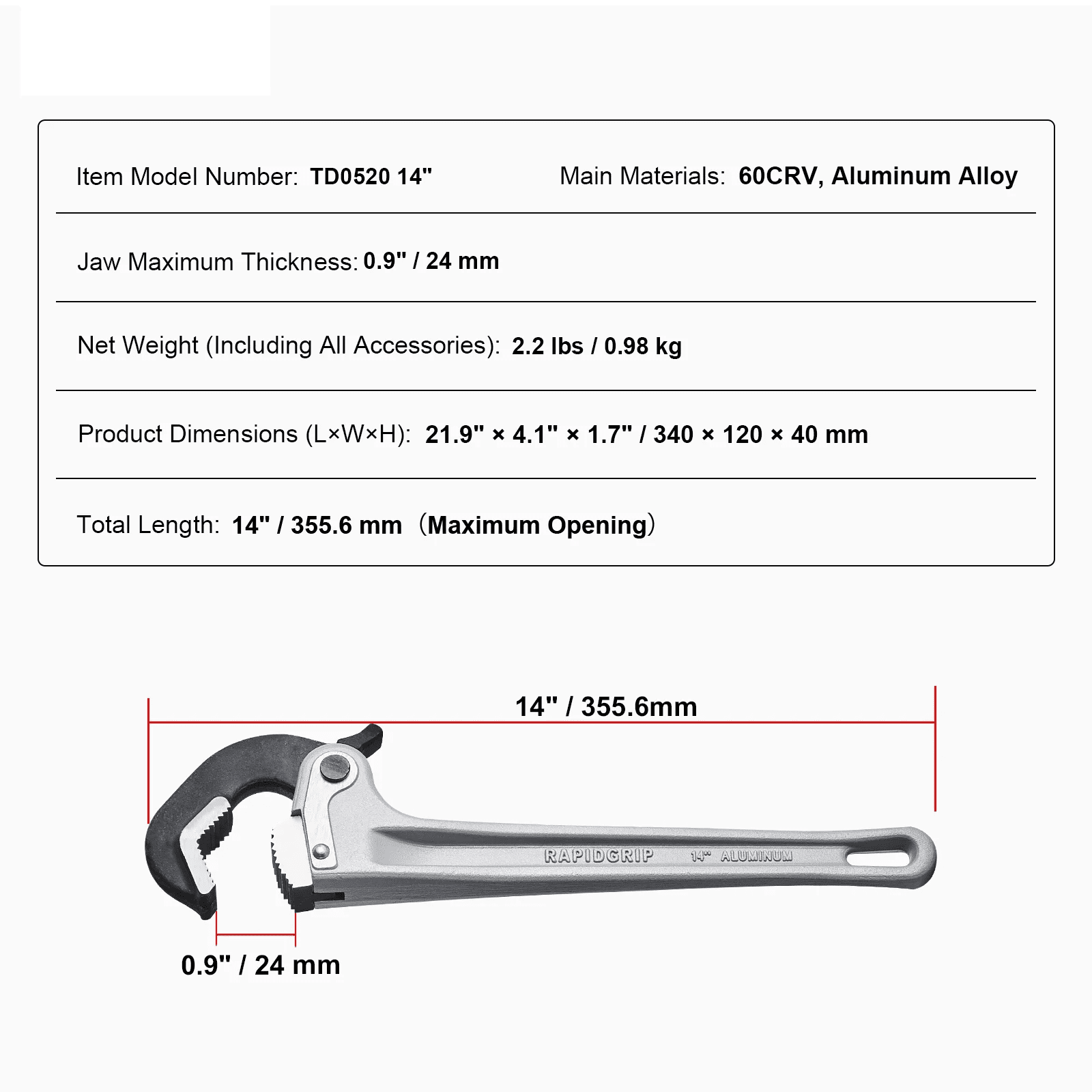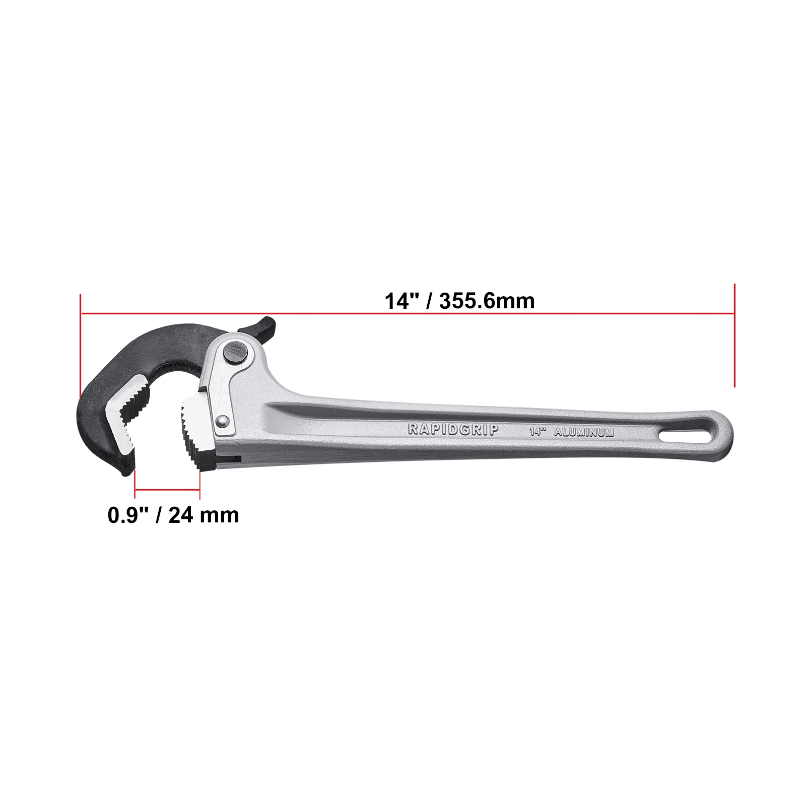 - With a 14″ size, our plumbing wrench can grip pipes up to 1.9″ / 48 mm in diameter. Suitable for various tasks in mechanical manufacturing, automotive repair, construction, and plumbing.