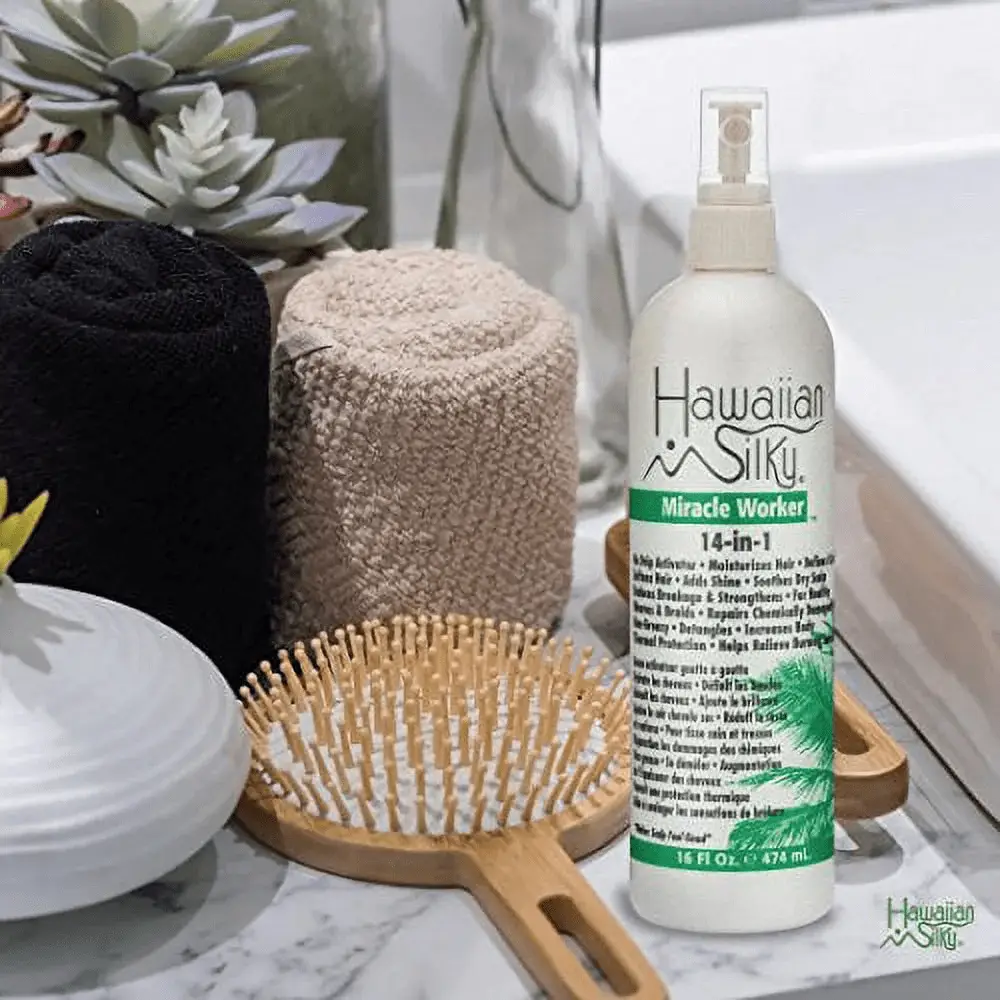 Hawaiian Silky Miracle Worker 14 in 1 spray is an excellent product for protecting and maintaining your adult hairstyle. This versatile product can be used as a curl activator and moisturizer on natural curls and perm waved hair and a leave-in conditioner for relaxed, natural and braided hair. This non-greasy, non-staining formula helps to soften and detangle hair while soothing the scalp and healing abrasions leaving a vibrant sheen.