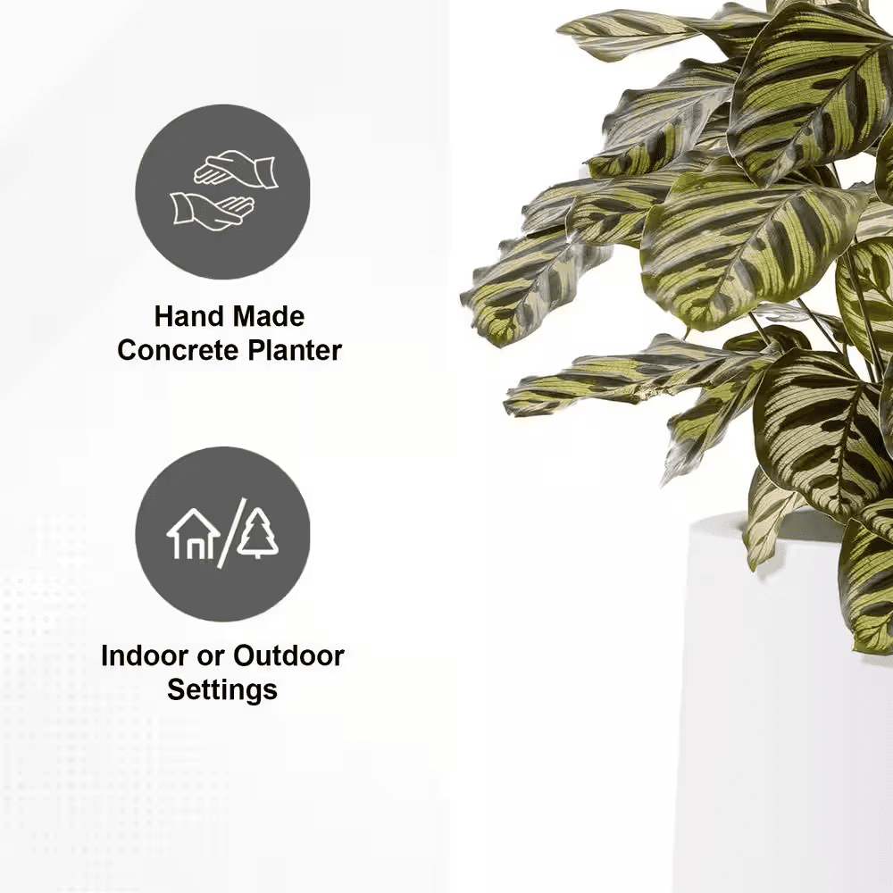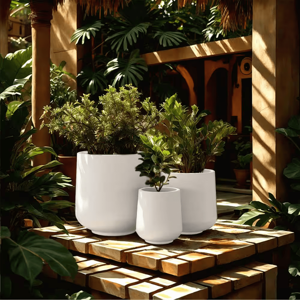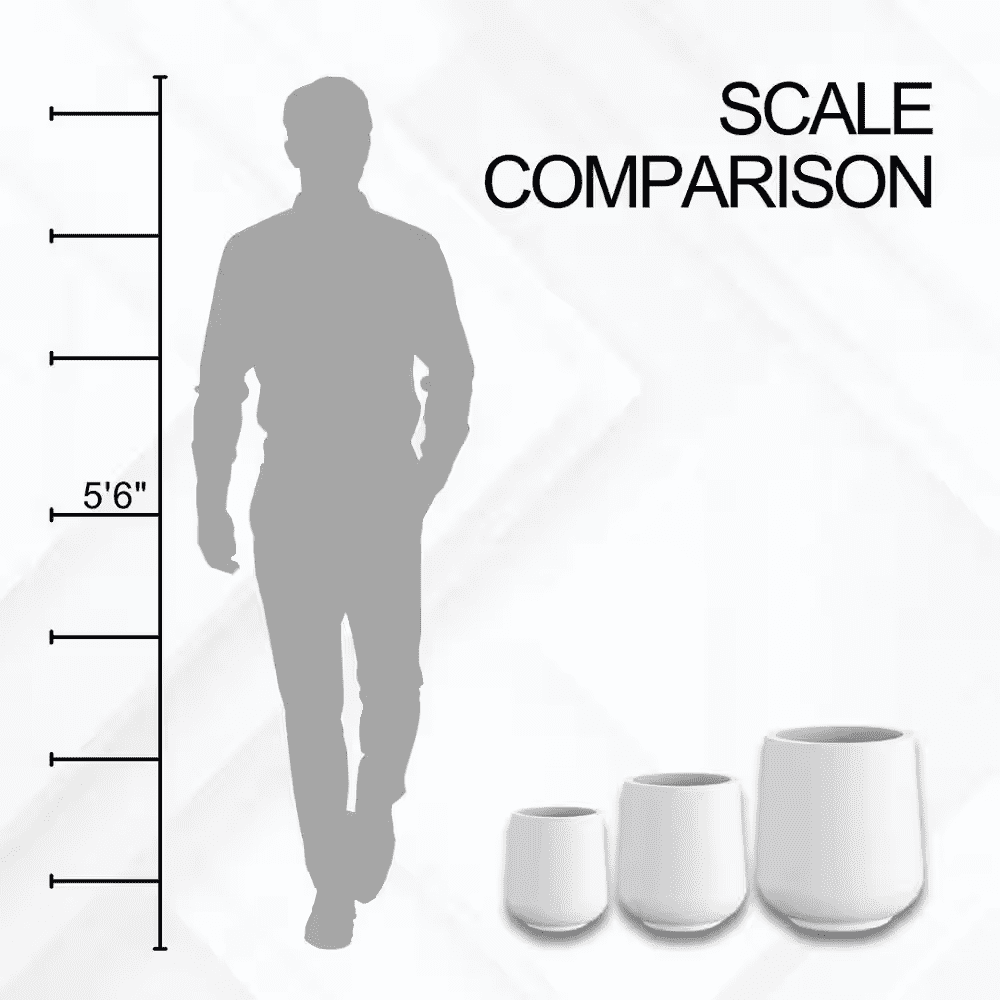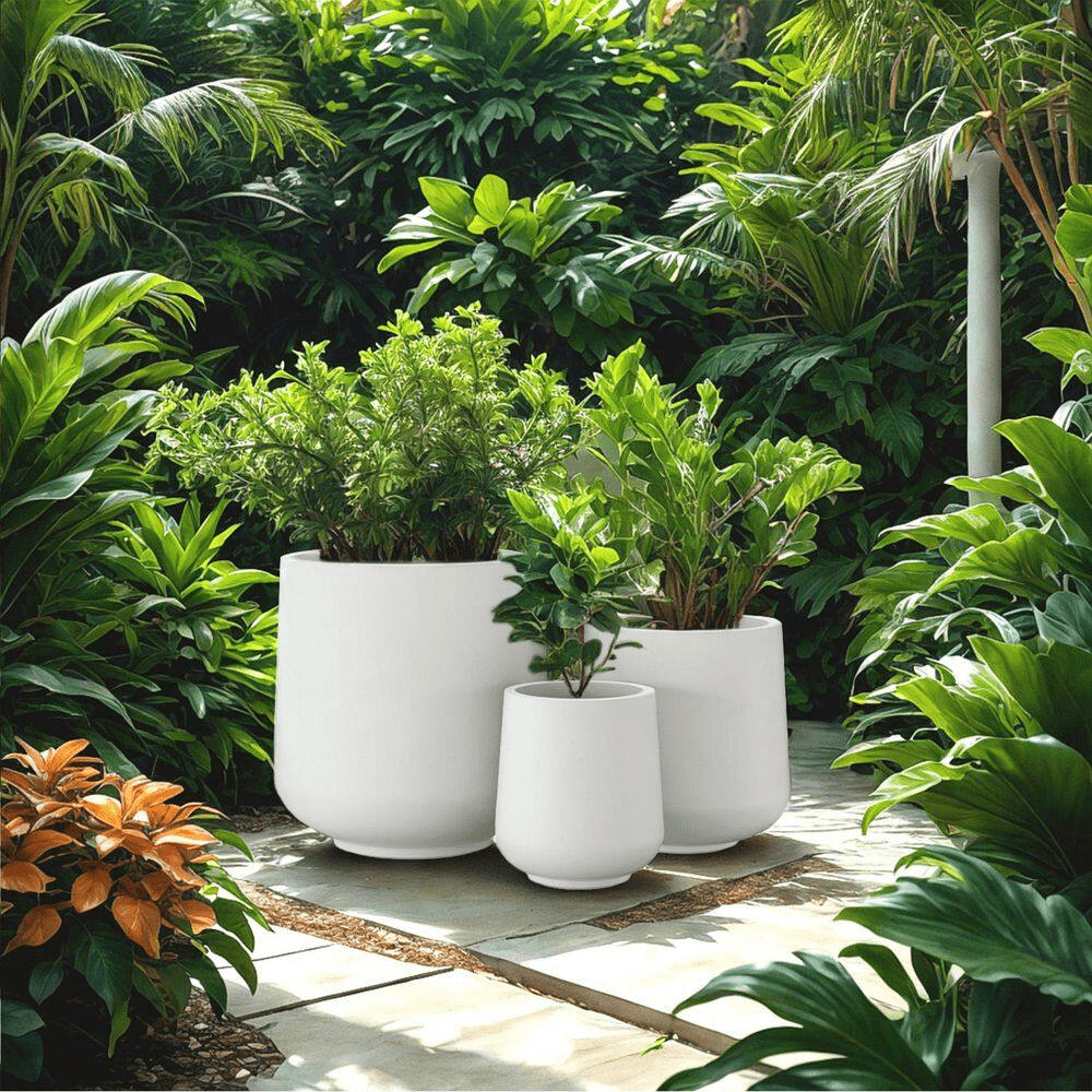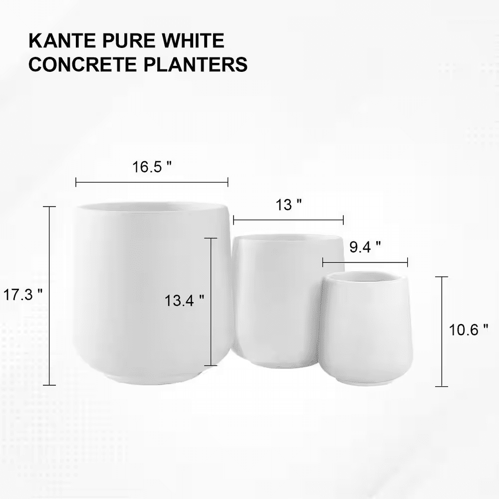 The Kante round concrete planters set (15.3 in. +11.6 in. +8.2 in. ) delivers crisp modernity in a pure white modern trio for bright outdoor garden decor. This minimalist collection features graduated pots with seamless finish and lightweight construction, each with drainage holes. Perfect for creating luminous versatile indoor outdoor use displays.