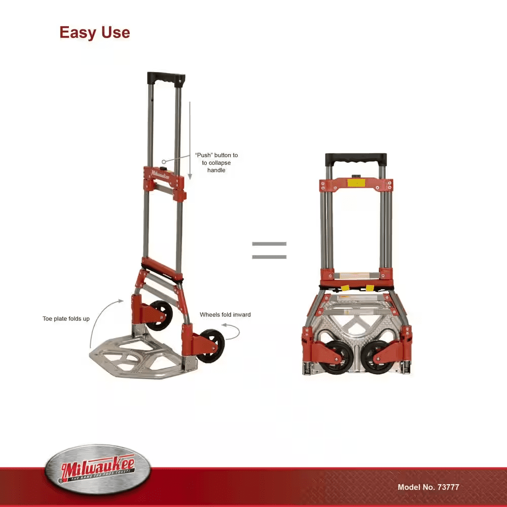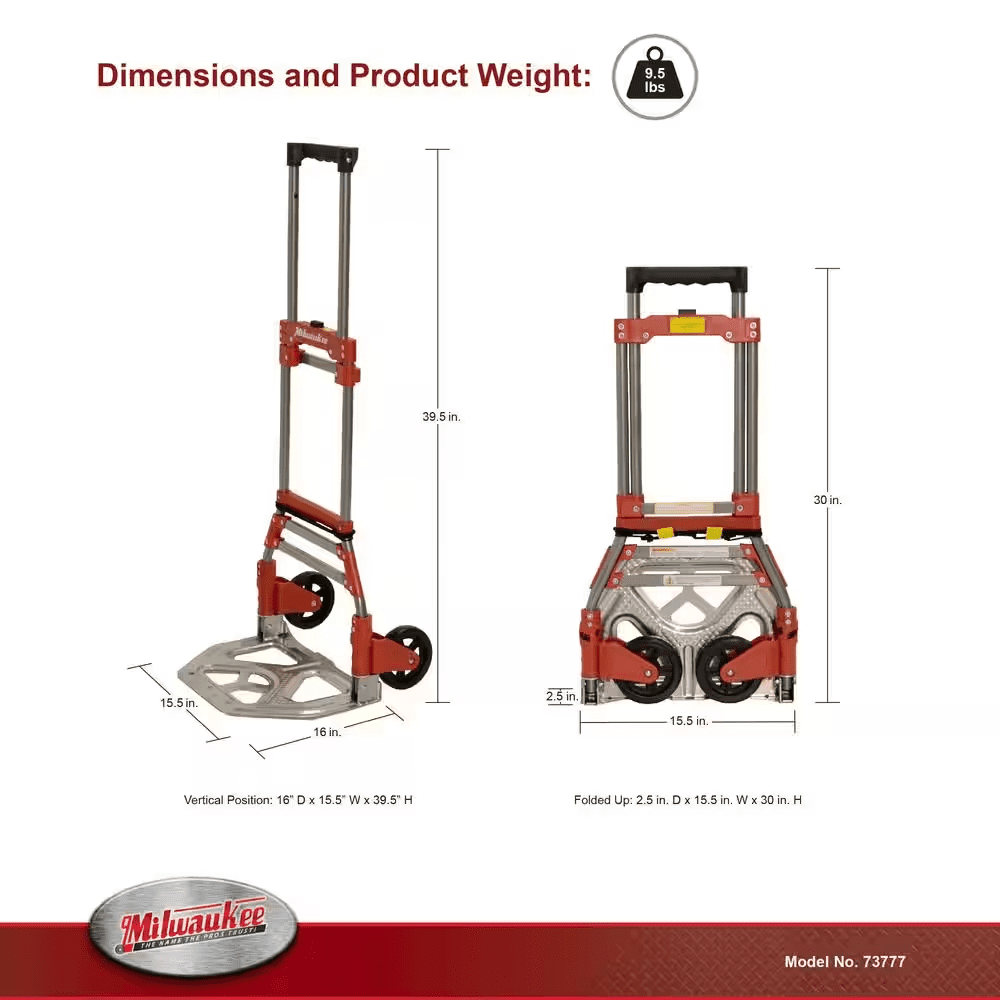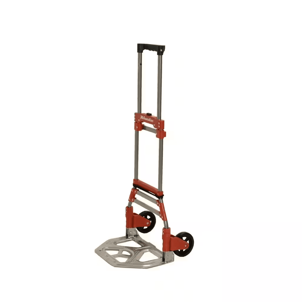 This Milwaukee 150 lb. Capacity Fold-Up Hand Truck is lightweight and easy to use. The handle extends to 39 in. and the collapsible frame is designed with a 15-1/4″ x 11″ toe plate. The 5 in. casters give this compact truck a load capacity of 150 lbs. A bungee cord is included to help secure the load. This lightweight hand truck is ideal for storage in a car or closet.