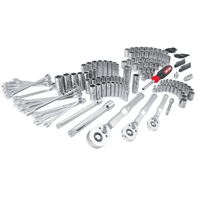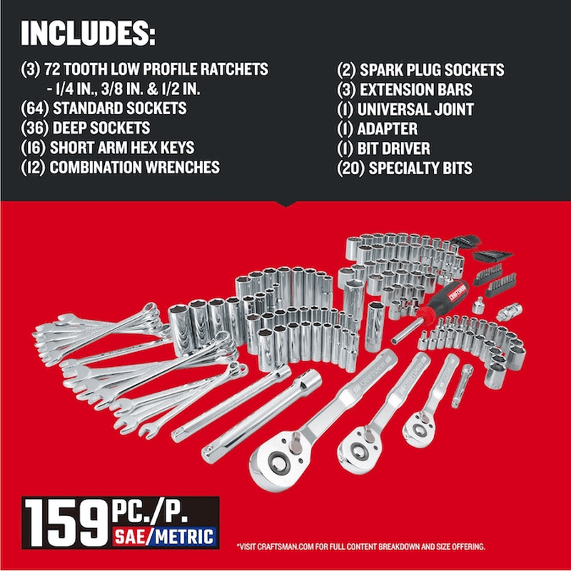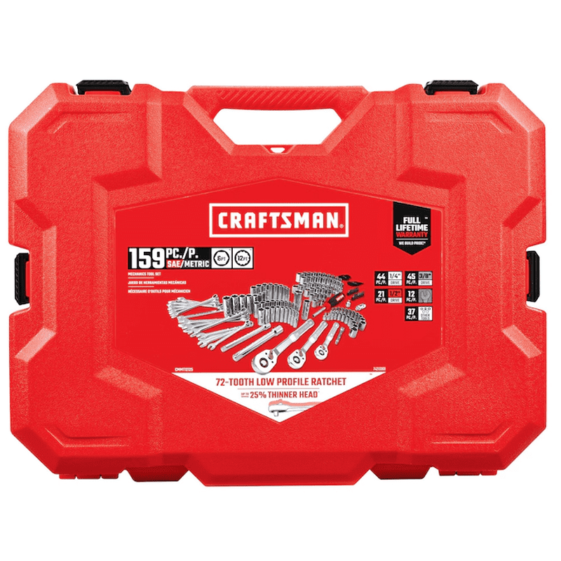 The 159 pc. 1/4-in., 3/8-in., and 1/2-in. Drive Mechanics Tool Set is equipped with low profile 72-tooth ratchets with 5° arc swing and up to a 25% thinner head, 1/4-in DR and 3/8-in DR only as compared to CMMT81747, CMMT81748, & CMMT81749, that helps deliver greater access in confined spaces. Packed with a broad assortment of 6-point and 12-point sockets, combination wrenches, and drive tools in a durable blow mold case. The case is constructed with metal hinges and designed to fit into CRAFTSMAN® metal storage boxes for easy organization. Perfect as an addition to your current tool collection or as a starter set. Proudly backed by a Full Lifetime Warranty.