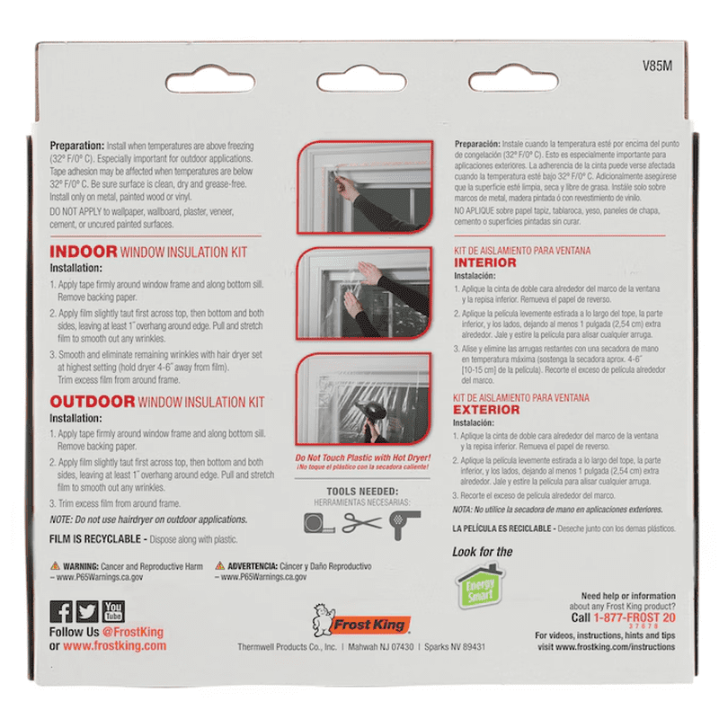 Frost King heavy duty, indoor/outdoor window insulation kit (5 -pack) boasts crystal clear shrink film to insulate 5 standard sized windows. The 1.5 mil film is ideal for high traffic areas. It includes extra wide 5/8 in installation tape for a more secure fit. It helps increase window R-values up to 90% for energy-saving efficiency. This low cost insulation and draft seal solution can save up to 35% heat loss.