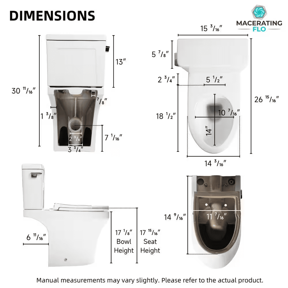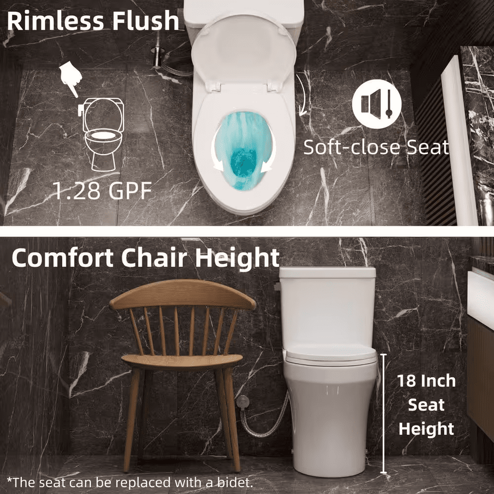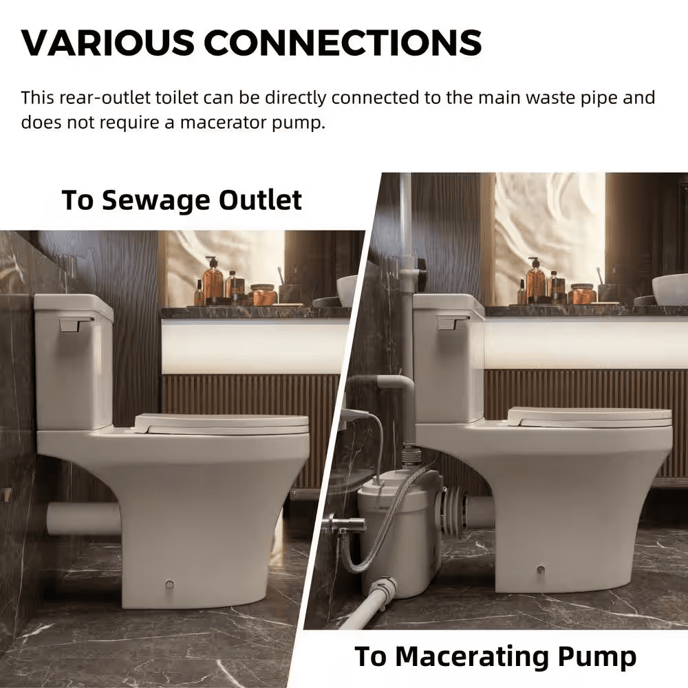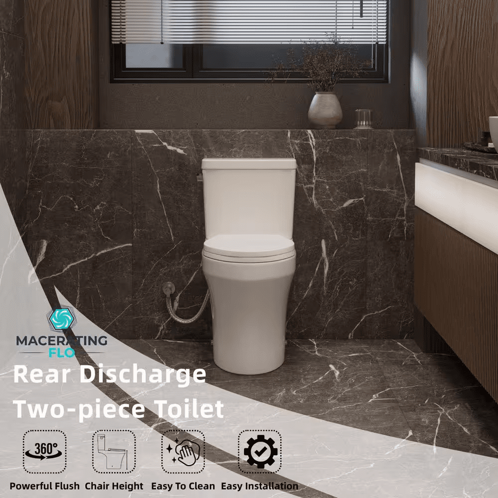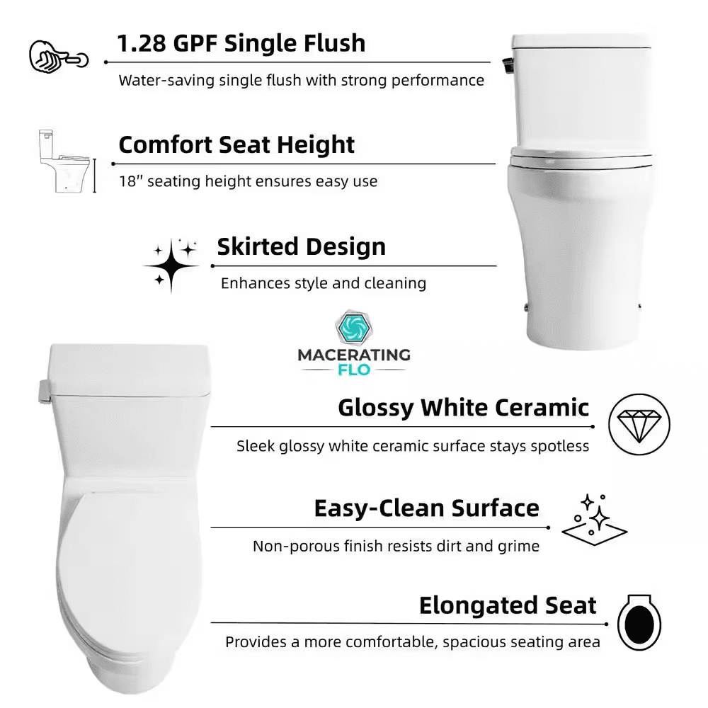 MaceratingFlo rear outlet toilet offers a practical solution for spaces without floor drains, featuring a 7-inch rough-in, extension pipes, and easy wall-mounted installation. Its 18-inch comfort height and elongated bowl provide added accessibility and seating space, while the 1.28 GPF rimless flush system delivers efficient, water-saving performance. Built with durable high-gloss ceramic in a sleek skirted design, this toilet is backed by a 2-year limited warranty and reliable customer support.