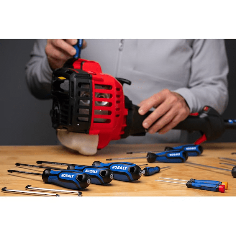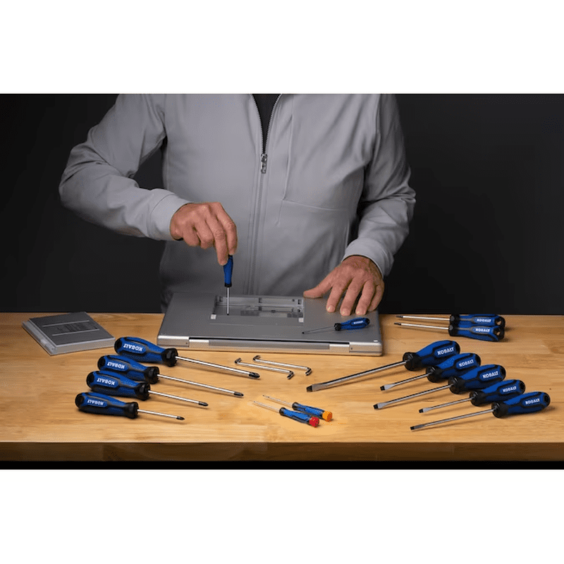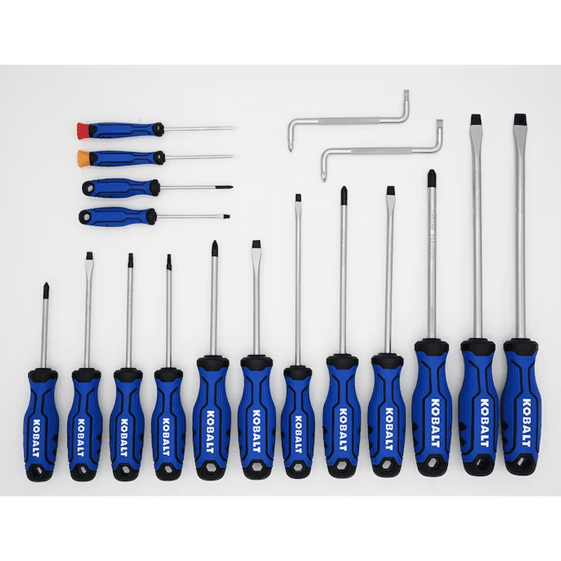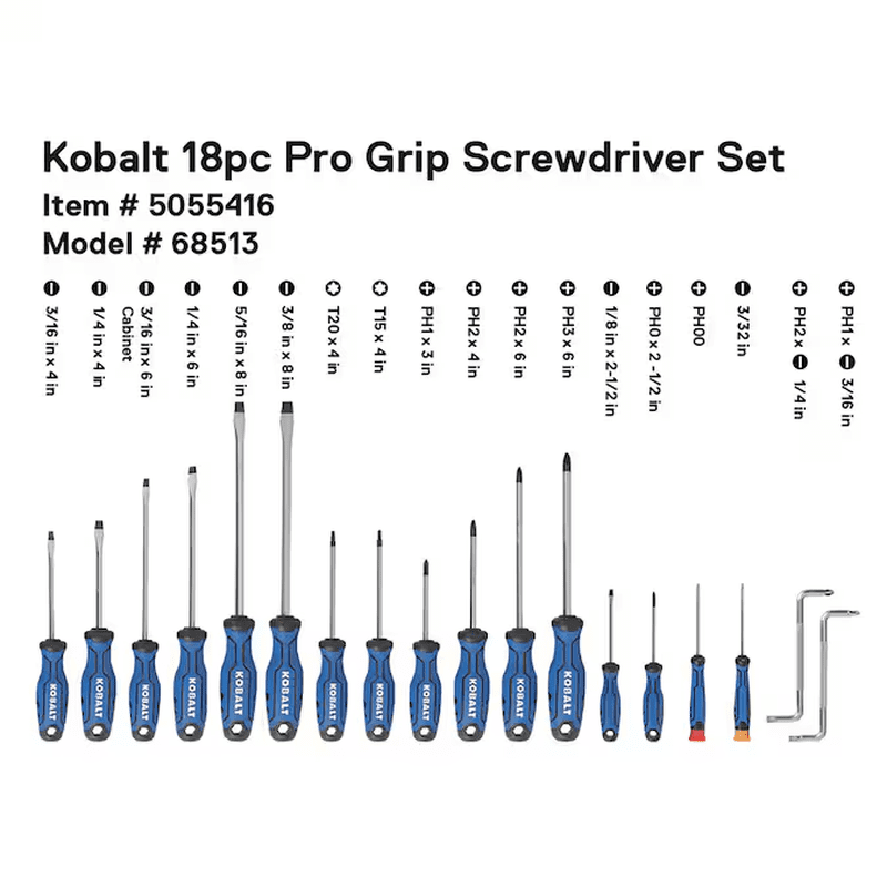 The Kobalt 18-piece Screwdriver Set includes 14 black oxide and heat-treated magnetic tip screwdrivers. The tip size markings are printed on the on the end of the handle for easy identification, while the heat-treated, alloy steel blade offers maximum strength and the precision formed tip ensures an accurate fit. The ergonomic handle provides comfort and power.