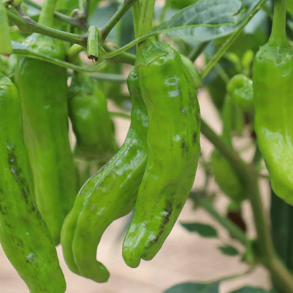 Prized by restaurants and a favorite among chefs. The Japanese sweet pepper produces handfuls of finger-long fruits typically used when green (though also fine to eat when red). Thin-walled fruits are ideal for tempura and stir-fries. Very popular as an appetizer tossed with oil, then char-grilled or pan-seared to a blackened, blistered state and salted. Perfect for containers. Maturity: 60-days to 80-days after planting.