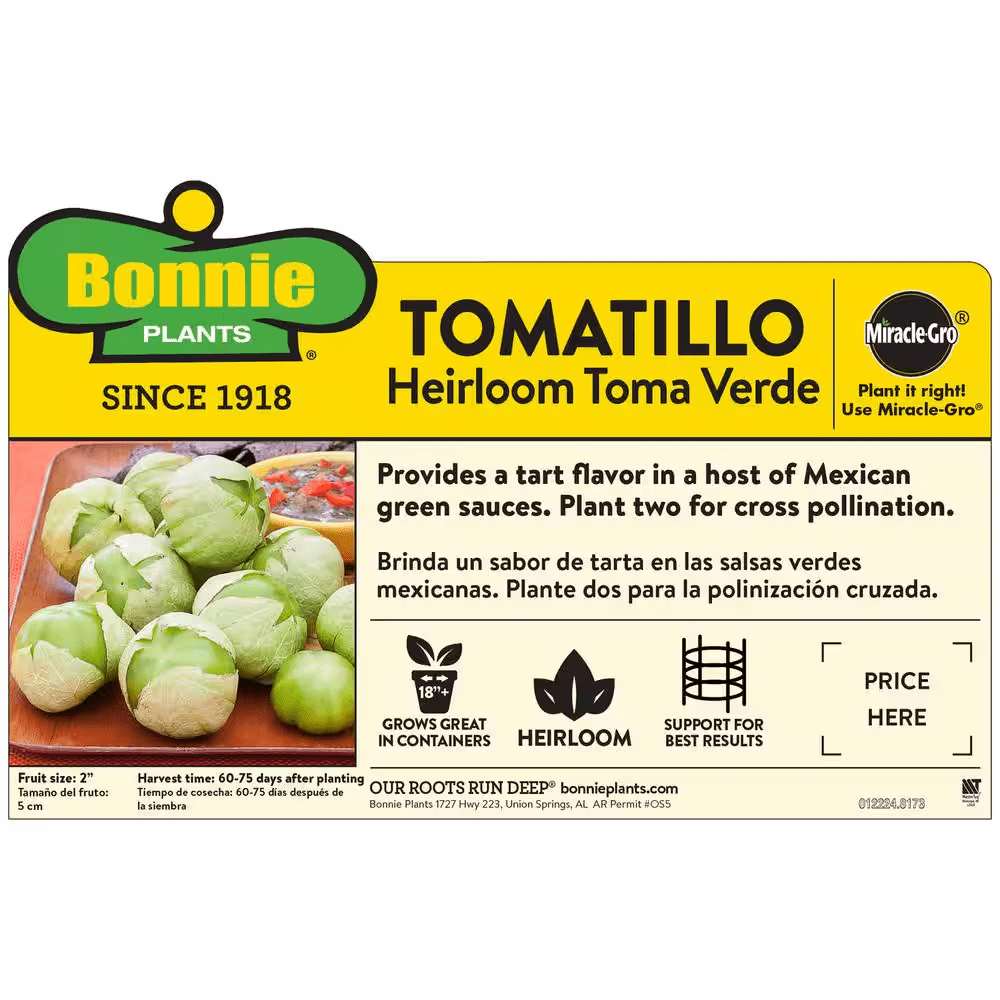 Heirloom variety that’s a relative to tomatoes but produces 2 in., green fruit with a very tart, unique flavor. Key ingredient in salsa Verde. Round, green fruit produced inside papery husk Is popular in Mexican and southwestern dishes, sauces, and salads. Remove the husk before eating and use the fruit when green. Plant in full sun and 2 or more plants are needed for pollination/fruit production. Maturity: 60-days to 75-days after planting.