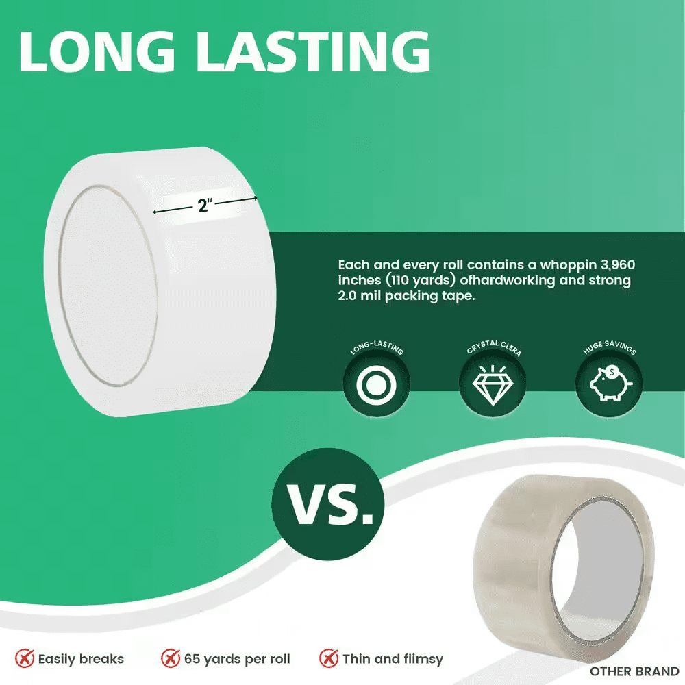 Securely seal boxes for shipping, moving, or storage with WRIGHTMASTER professional-grade packaging tape. Designed for durability, this 2.0 mil thick tape resists splitting and tearing, even under rough handling. The strong adhesive ensures a long-lasting bond, keeping packages tightly sealed during transit. With high clarity, labels and barcodes remain visible for easy identification. Each roll contains 110 yds. (3,960 in.) of heavy-duty tape, fitting standard 3 in. core dispensers for effortless application. Perfect for home, office, warehouse, and logistics use.