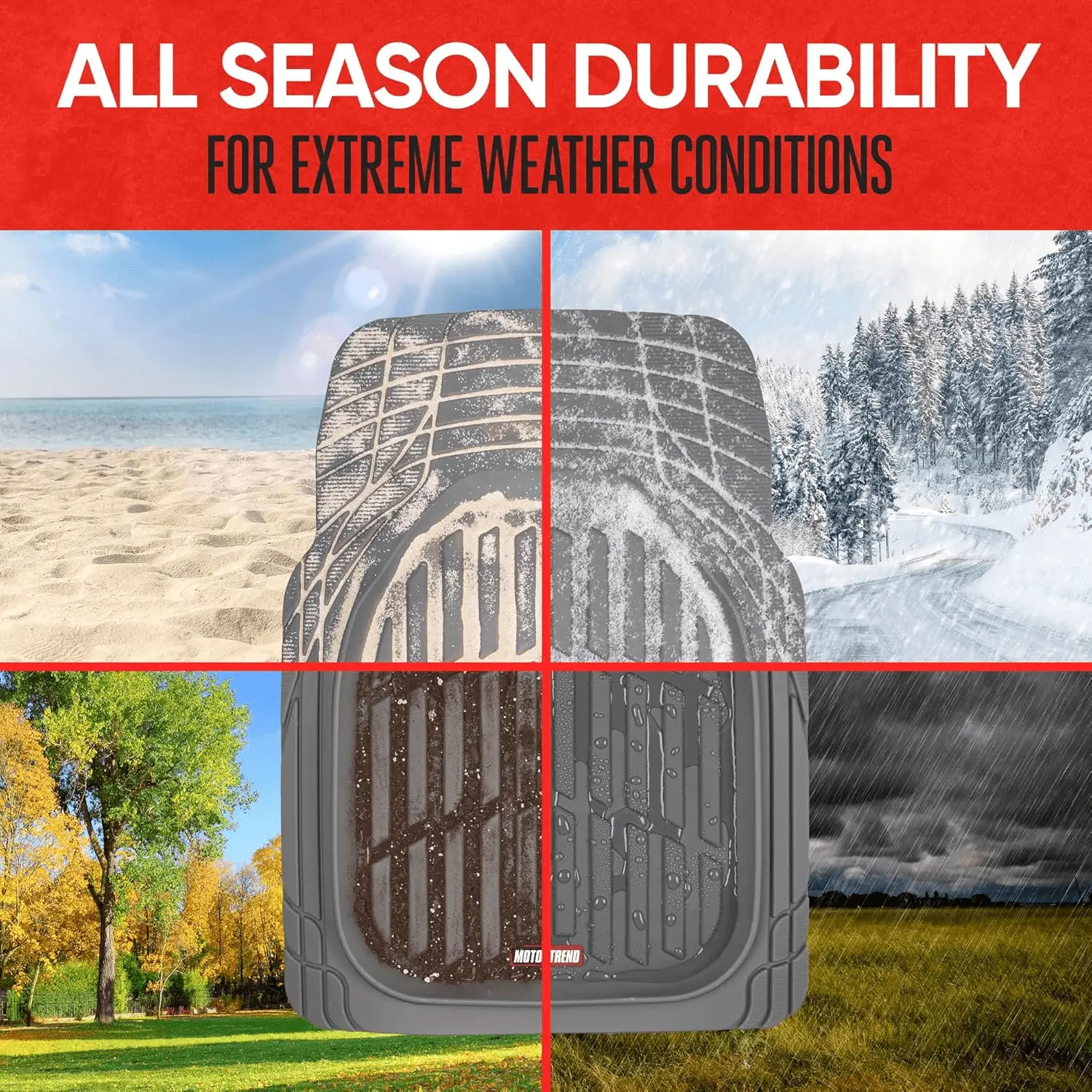 Flexible and Tough – FlexTough Tortoise Series mats feature a deep inverted shell are designed to provide maximum protection. The uniquely constructed linear and diagonal ridges are placed strategically to maximize the dirt trapping capabilities of the mat. Made from the highest quality polymers, Motor Trend mats are odorless and trimmable for extra customization.