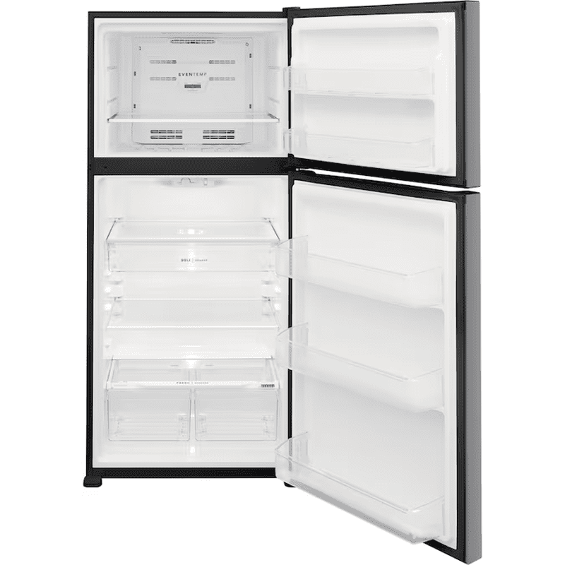 This Frigidaire 20 cubic foot top freezer refrigerator fits in the same sized cutout as a traditional 18 cu. Ft. Model (30-in width x 66-in height cutout. This refrigerator features the EvenTempâ„¢ cooling system, precise temperature control which keeps food at one ideal temperature. Spacious interior storage options include a full-width deli drawer, generous door bins, and a full-width glass freezer shelf. This Lowe’s Exclusive is similar to FFTR2045VS but features EasyCareâ„¢ Stainless Steel with an easy-to-clean fingerprint-resistant finish.