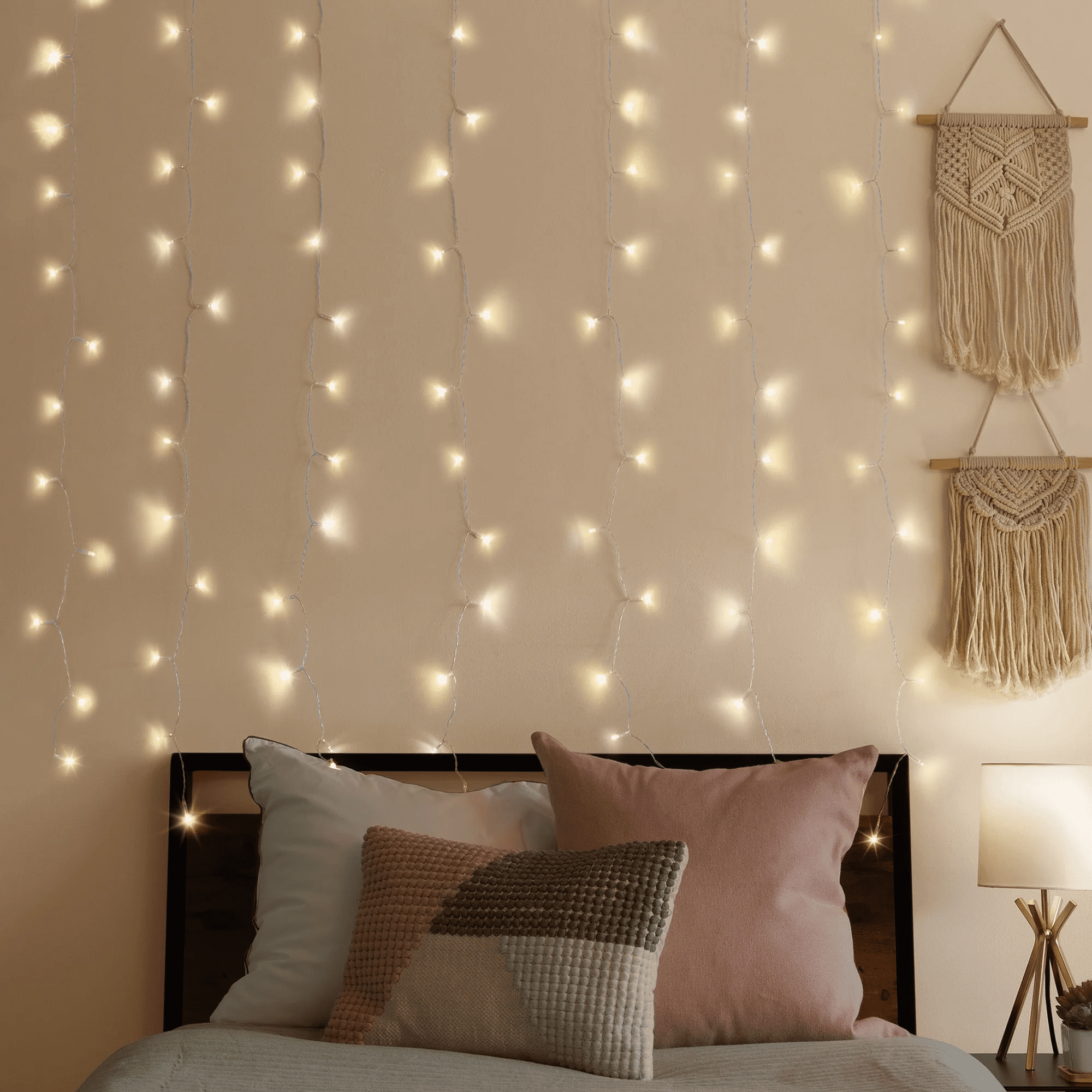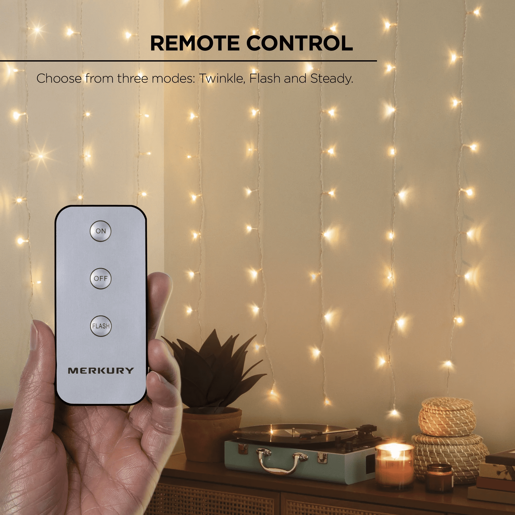 Create a cozy and inviting atmosphere with the Merkury Innovations 200-Count Warm White LED Curtain String Lights. Featuring 8 cascading strands of soft warm white LEDs, this USB-powered curtain spans 7 feet wide by 6.2 feet long—ideal for bedrooms, living rooms, or holiday décor. Includes a remote to power lights on/off and activate three flashing modes. Compatible with USB-A wall adapters, laptops, or portable power banks. Indoor use only.