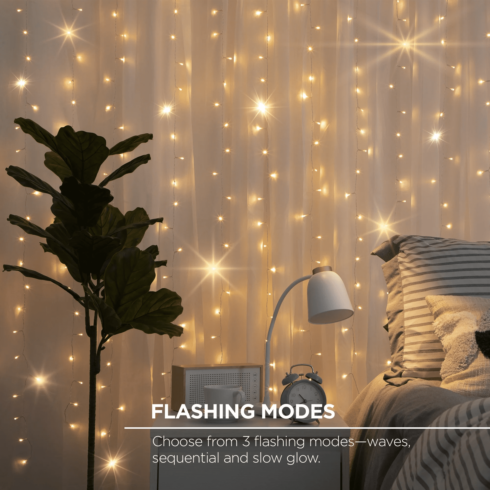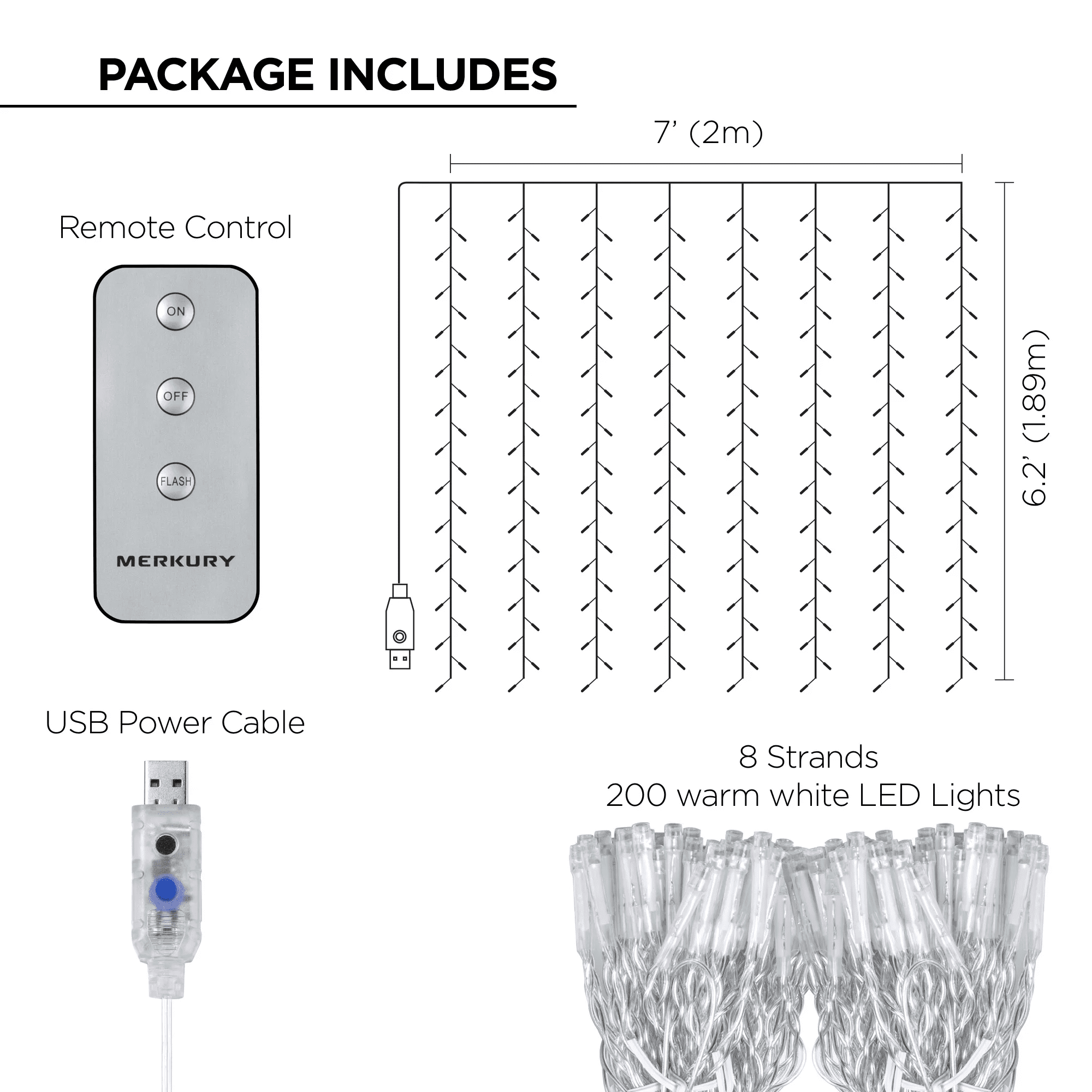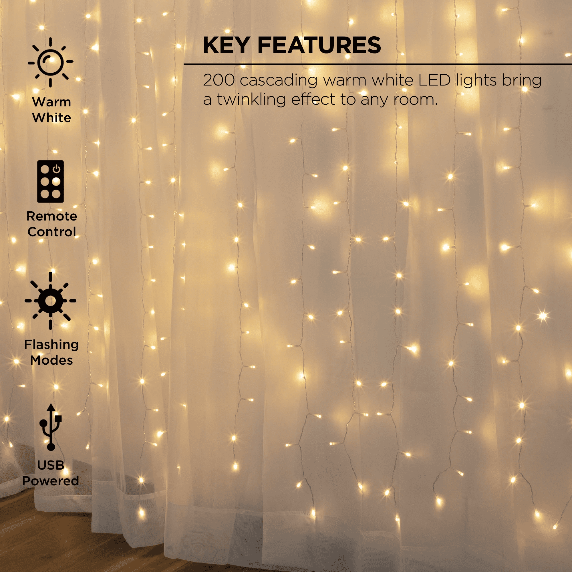 200-Count Warm White LED Curtain String Lights, Usb-Powered with Remote, 7 Ft X 6.2 Ft, Indoor Use