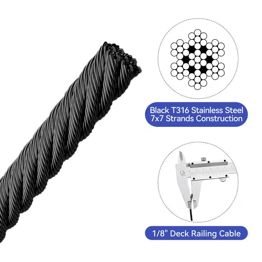 Upgrade your deck with our 1/8 in. Black Cable Railing, featuring a unique blackening technology for a sleek, smooth finish that protects your hands. Made from high-strength stainless steel, this railing offers exceptional resistance to rust and corrosion, ensuring lasting durability. With a 200-ft. roll and included cutter, you can customize the length to perfectly fit your needs, making it an ideal choice for any deck railing system.