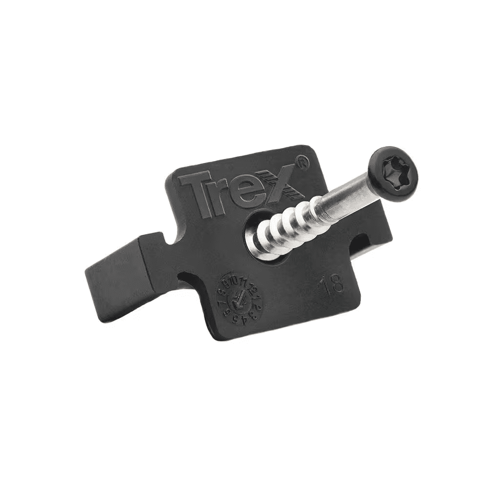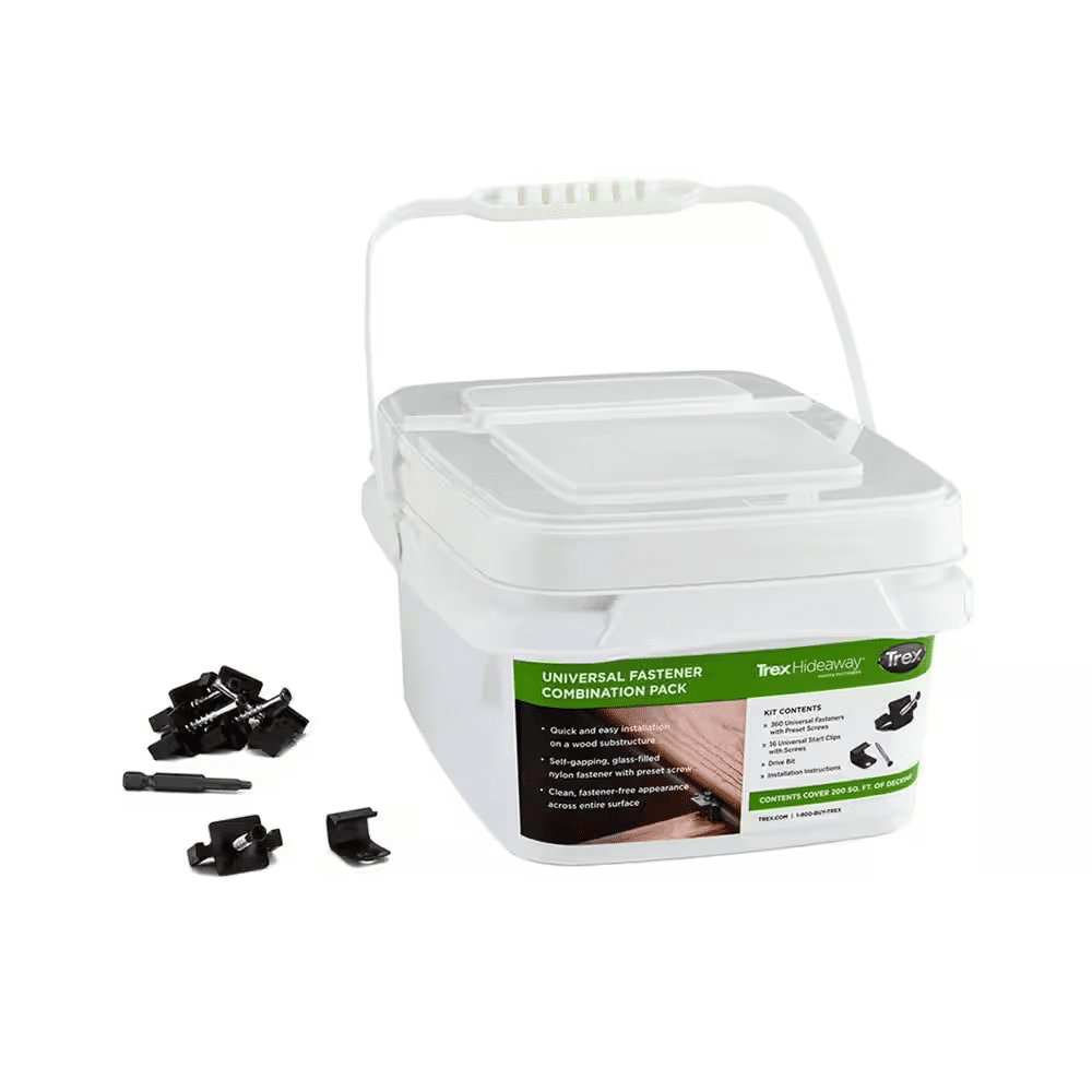Create a smooth, screw-free finish and perfectly space Trex deck boards with this hidden fasteners combo kit. Use between each grooved-edge board for perfectly consistent spacing and no visible surface screws on up to 200 sq. ft. of decking. Kit includes 360 self-gapping, glass-filled nylon, universal deck fasteners with preset stainless steel screws, 16 universal start clips with screws, drive bit and installation instructions.