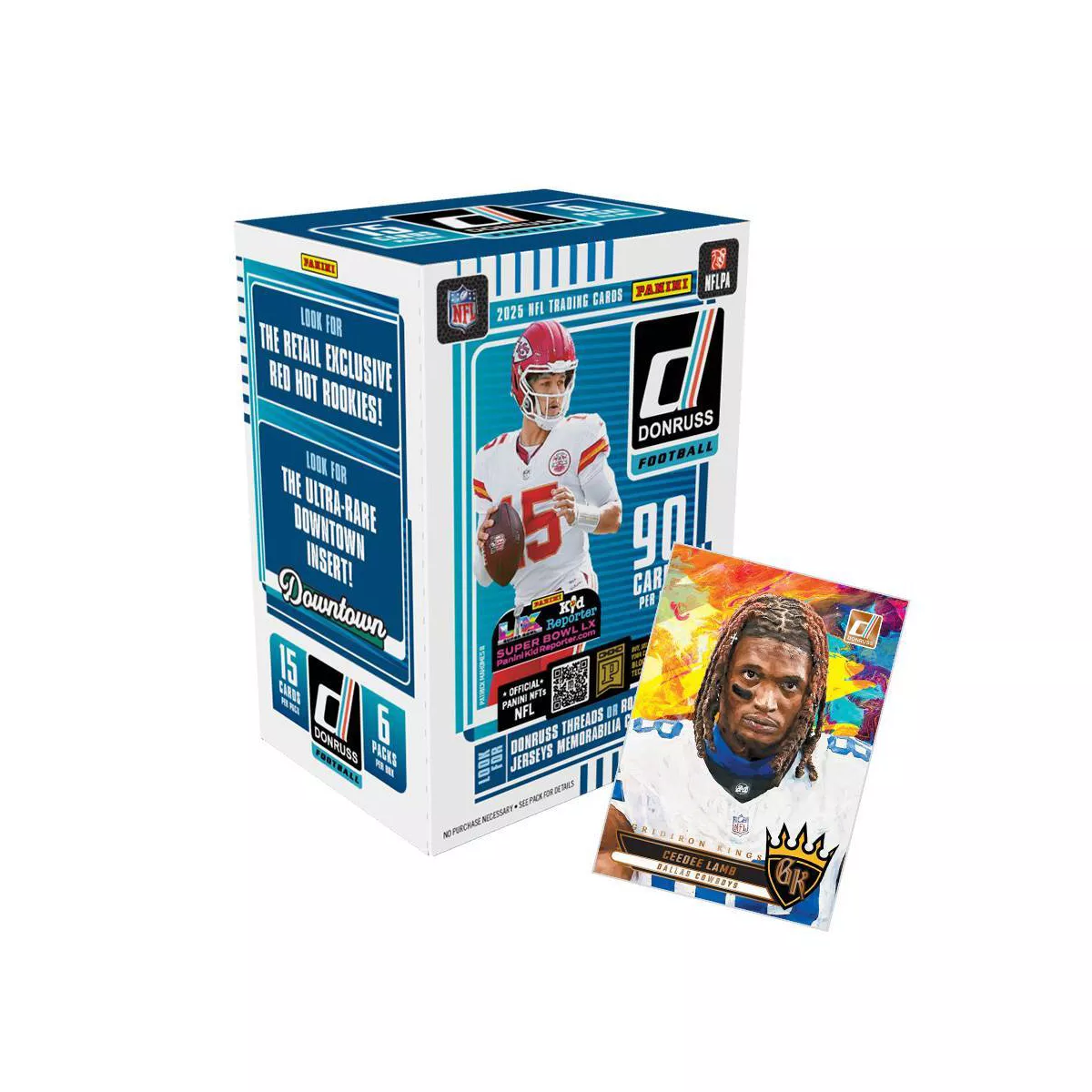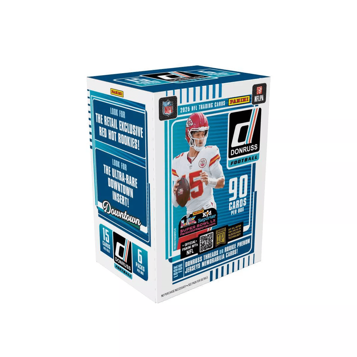 Panini presents the 2025 Donruss Football Trading Card Blaster Box. Each box contains 6 packs with 15 cards per pack. Look for Retail Exclusive Red Hot Rookies! Look for the Ultra-Rare Downtown Inserts! Look for Donruss Threads or Rookie Phenom Jerseys Memorabilia Cards!