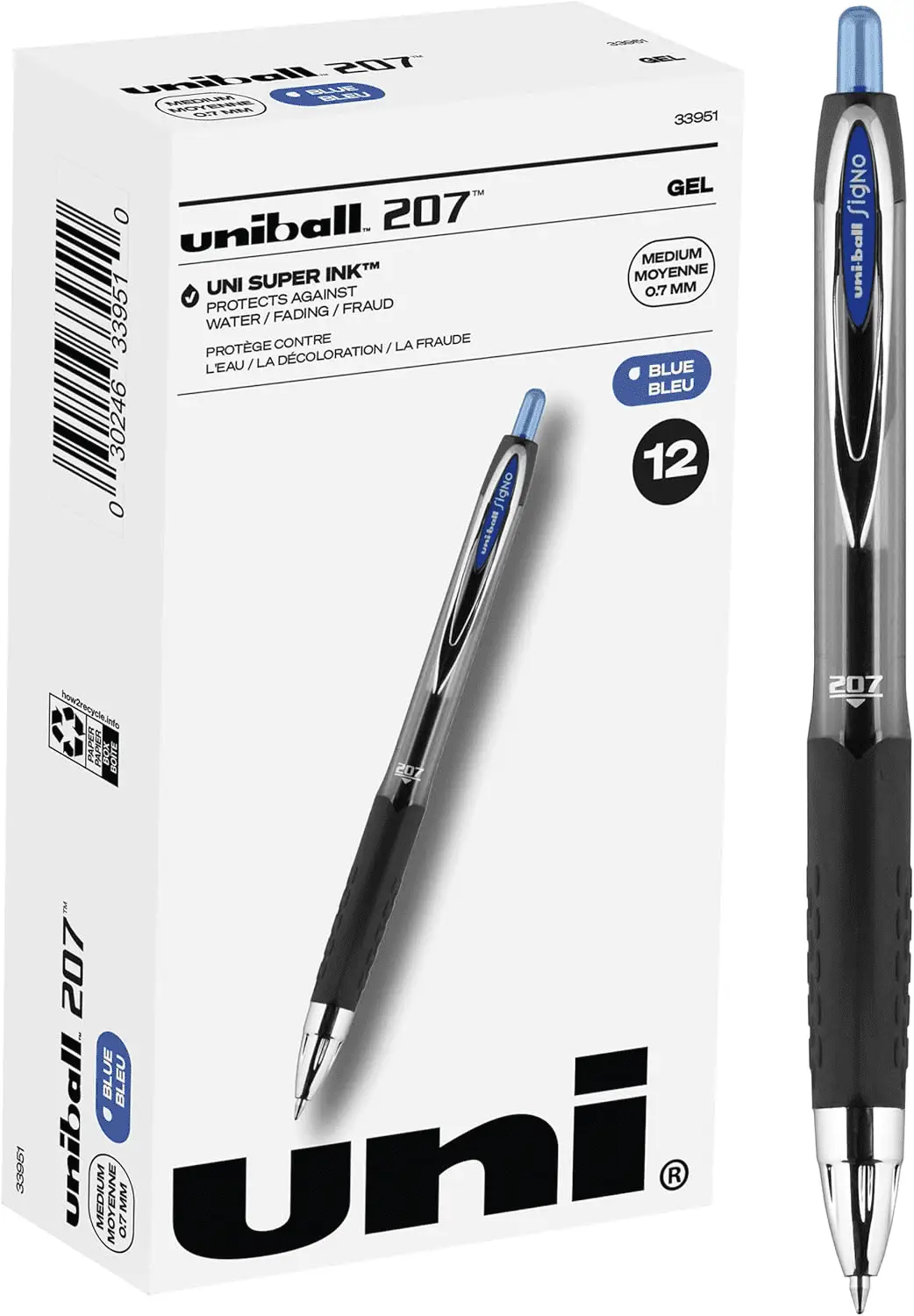 Stock your office, home or classroom with 207 Retractable Gel Pens from uni-ball available in various point sizes with a stainless steel tip that resists bending and breaking. Even-flowing, pigment-based gel ink delivers a smooth writing experience for intense, vibrant lines, ensuring that every mark is brilliantly communicated. Use these retractable gel pens for everyday writing tasks, check signing and all of your important signatures, trusting its quick-drying uni Super Ink. Innovative uni Super Ink technology effectively entraps the gel ink into the paper, producing fraud, fade and water-resistant documents that resist check washing or bleaching. A textured grip offers greater comfort and control as you continue writing, while a translucent ink window indicates the level of gel ink remaining, so you don’t run out unexpectedly. The sleek design of the 207 with modern metal accents gives the retractable gel pen a stylish touch.
