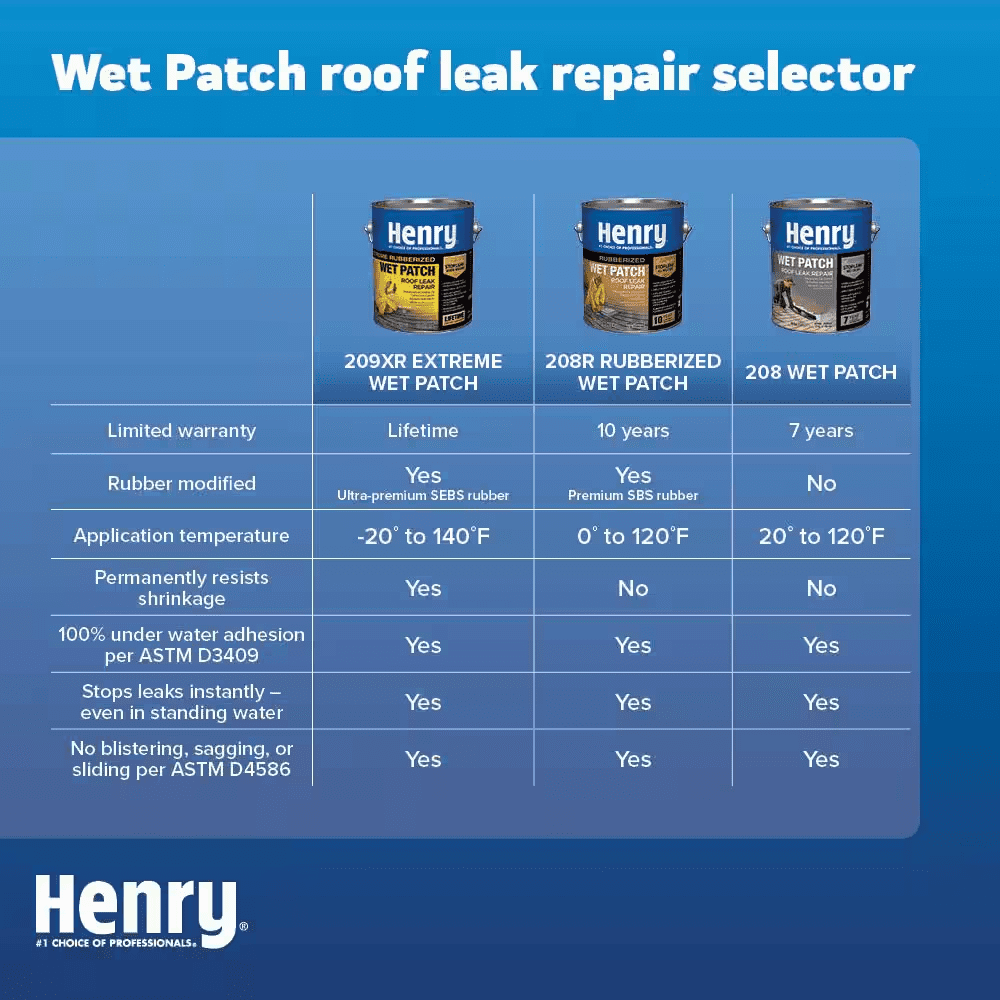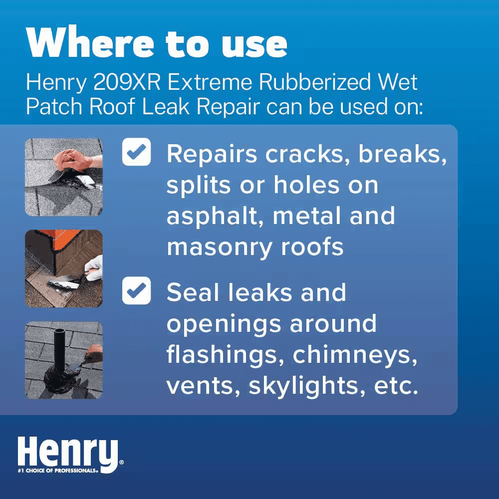 Henry 209XR Extreme Rubberized Wet Patch Roof Leak Repair Sealant is an ultra-premium, rubberized roof sealant with excellent adhesion, especially at moving joints where its flexibility and elasticity make it superior to standard roof cements. Instantly stops leaks in severe weather conditions. Especially easy to spread in cold temperatures.