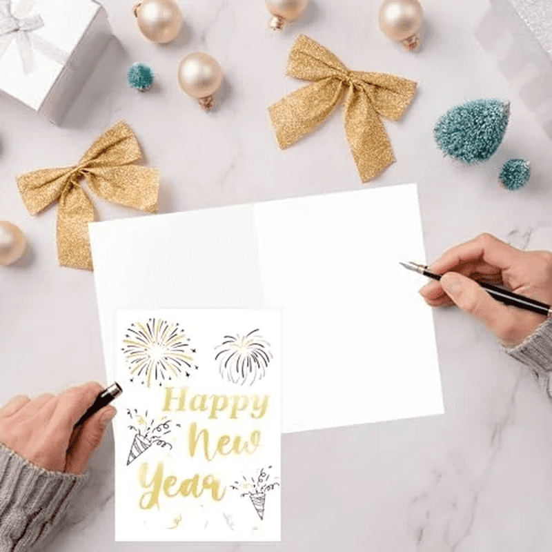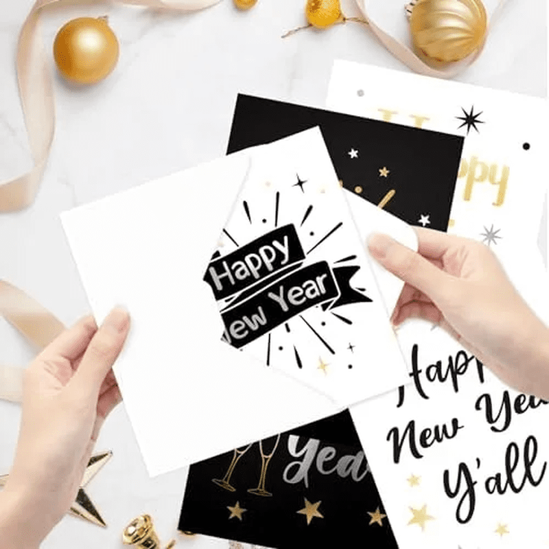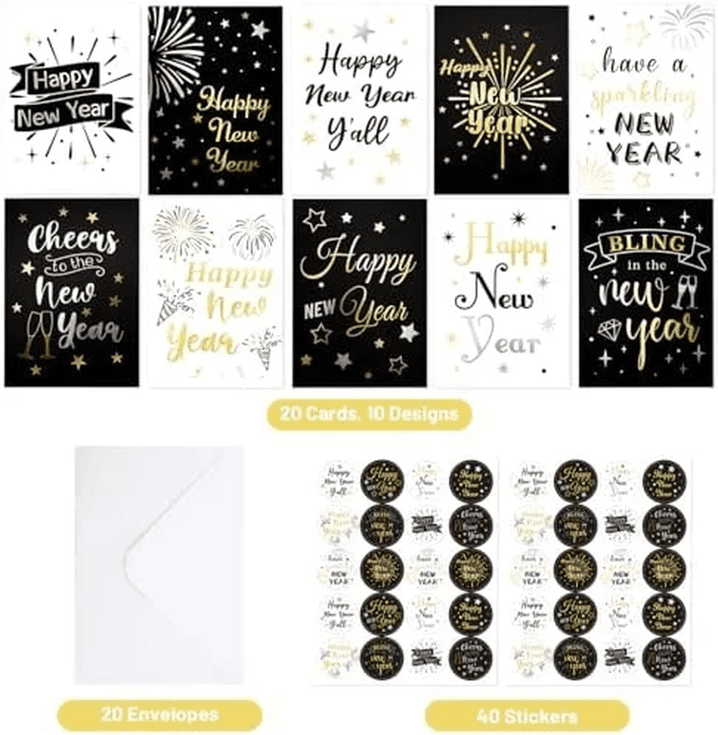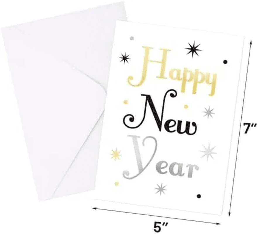 What You Get : 20 Happy New Year greeting cards, 20 envelopes, 2 sheets stickers. The size is 5” x 7” Blank on the Inside : Each pattern is carefully designed, colorful pattern, gold foiled words. These cards are blank on the back, leaving plenty of space to write your message and wishes Unique Design : 10 beautiful designs. Add more festive atmosphere for your new year. Send your blessings to your friends’ with the card and to celebrate new year Great Happy New Year Cards : You can send them to kids, family, friends, and these are fit for business. Your friends will feel very excited when they receive these greeting cards with your sincere wishes Our Advantages : Perfect Size. Wonderfully printed and precision cut. Well packaged, the edges will not be bent or damaged at all. Made of paper cardboard