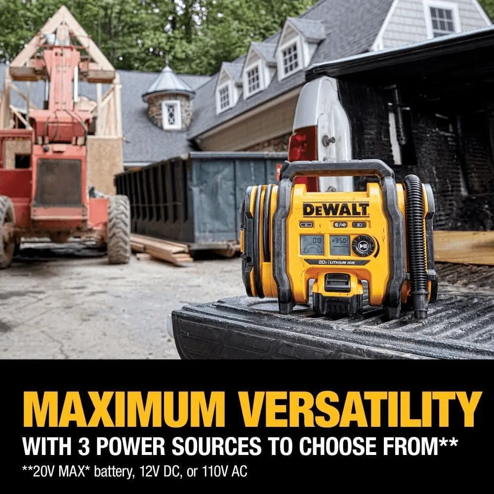 - Three power sources for inflation on a jobsite and on the go (20V MAX battery, 12V DC, or 110V AC)