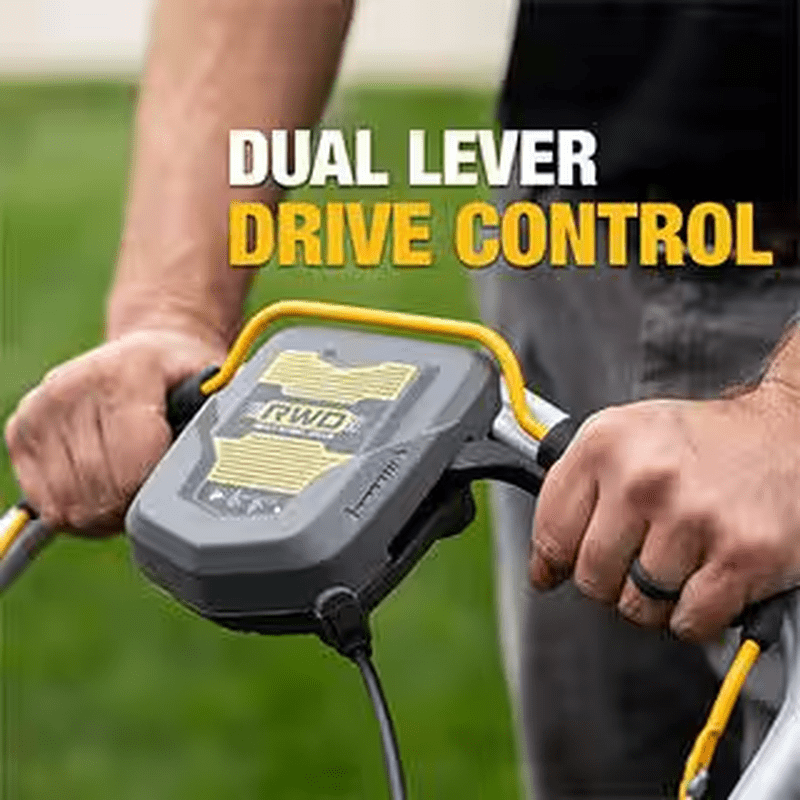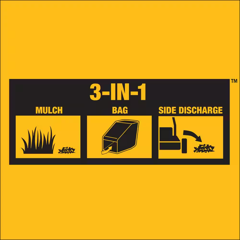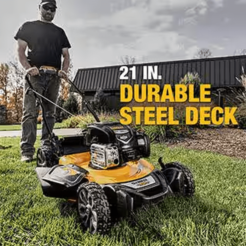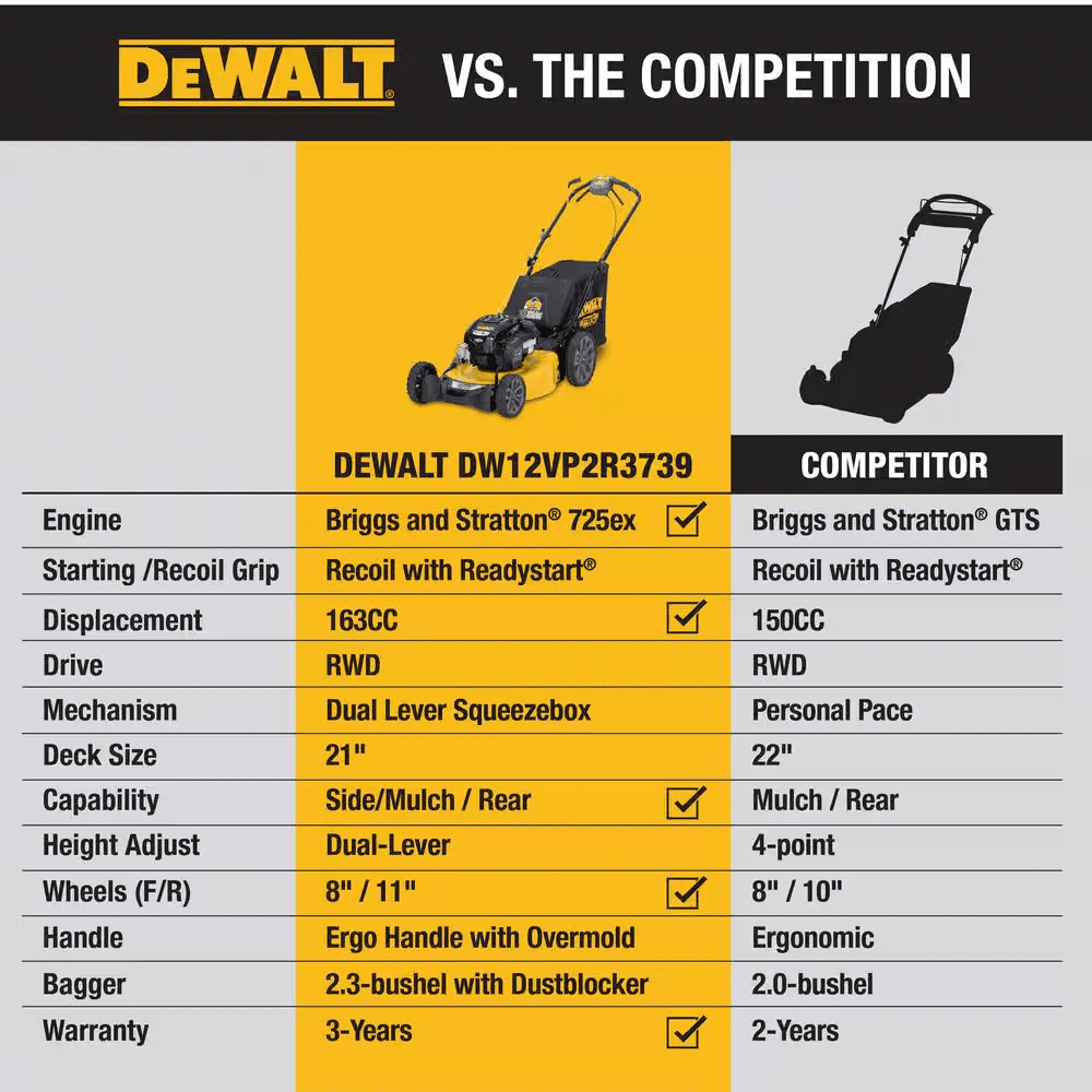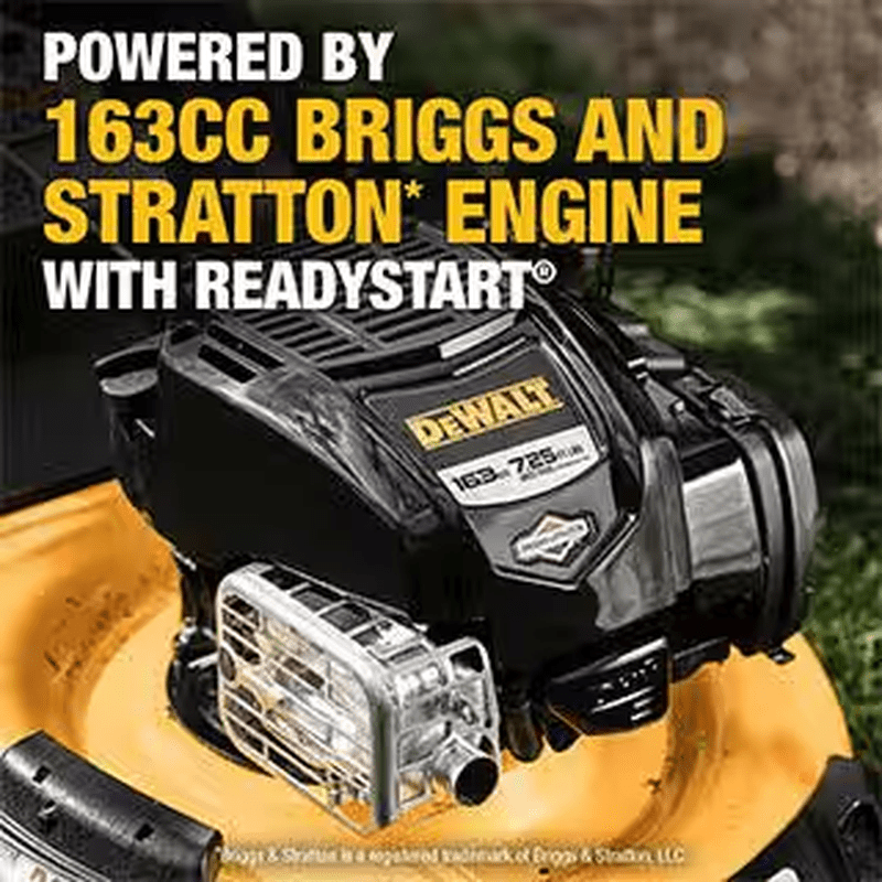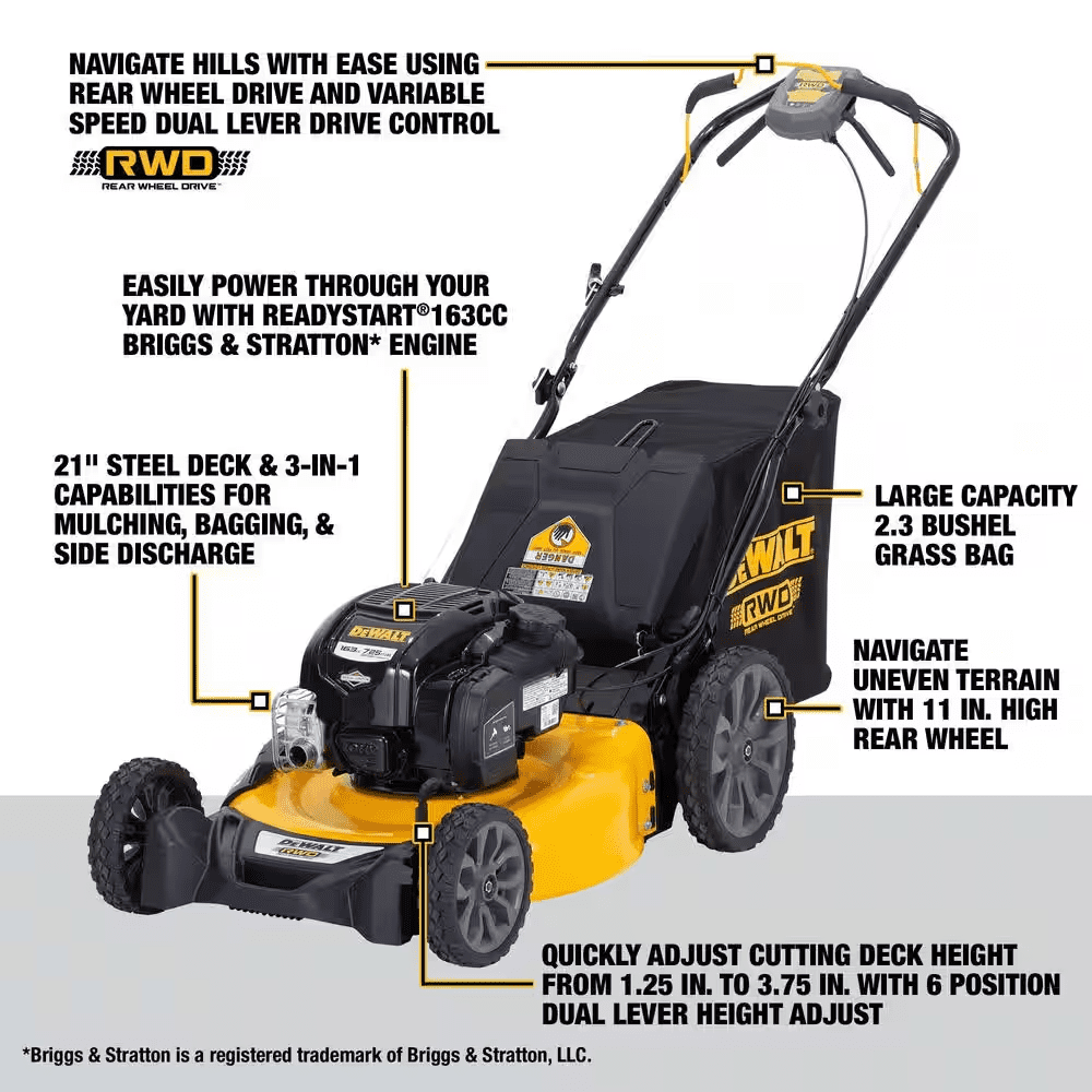 Manage your lawn with the DEWALT 21 in. rear wheel drive, gas mower. Delivering strength and power to your yard with a 163cc Briggs and Stratton engine. This durable steel deck mower provides 3-in-1 mulch, bag and side discharge capabilities utilizing a 2.3 bushel bagger. Easily adjust the grass height settings to your preference with just two levers and cut heights ranging from of 1.25 in., 3.75 in. Navigate hilly and uneven terrain with ease using the 11 in. high rear wheels and dual lever, rear wheel drive.