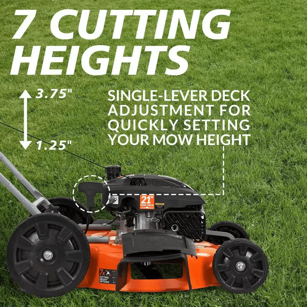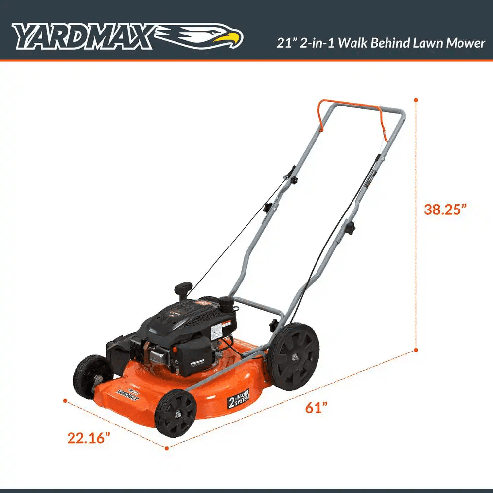 The YARDMAX 21″ 2-in-1 walk-behind manual push mower features a light, compact design that makes it easy to mow smaller lawns and to maneuver the mower in tighter spaces, but still gives you plenty of features and lots of power for an entry-level mower. Equipped with a 170cc OHV Yardmax engine that delivers maximum performance in this class of push mower, this mower features a seven cutting positions, which can be adjusted using a single convenient lever. For smooth mobility and reduced vibration, this mower features 7-in. front and 11-in. rear ball-bearing wheels, and a single-piece, seamless stamped steel deck made of durable 16-guage steel. The entire mower can be compactly folded for stowing in tight garage spaces. Only limited assembly required.