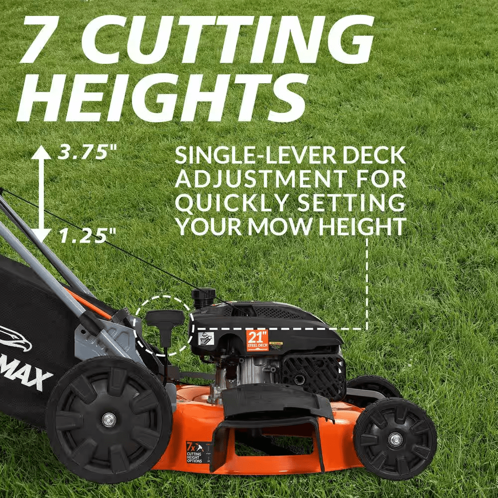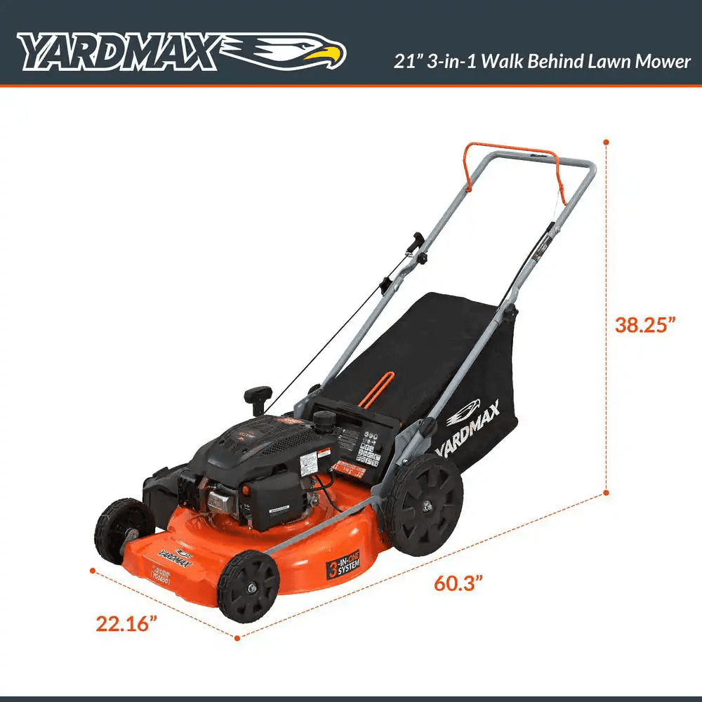 The YARDMAX 21″ 3-in-1 push mower is perfect for the homeowner that wants a mower with all the features and is easy to use, but doesn’t mind pushing. The 170cc OHV Yardmax engine delivers maximum performance in this class of mower. The YG1650 features a high-rear-wheel design, and all wheels are equipped with durable 1.5″ wide treads and with double ball bearings, all of which makes for easier pushing and for even cuts. Cut your lawn to your specifications by using a single convenient lever to select one of seven cutting heights, from 1.25″ to 3.75″. The MaxFlow volute deck is designed to keep grass clippings airborne longer for superior mulching, or for flowing into the rear bag when needed. The entire mower can be compactly folded for stowing in tight garage spaces. Only limited assembly required.