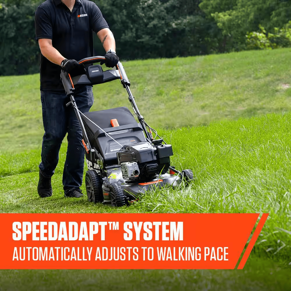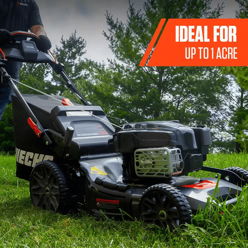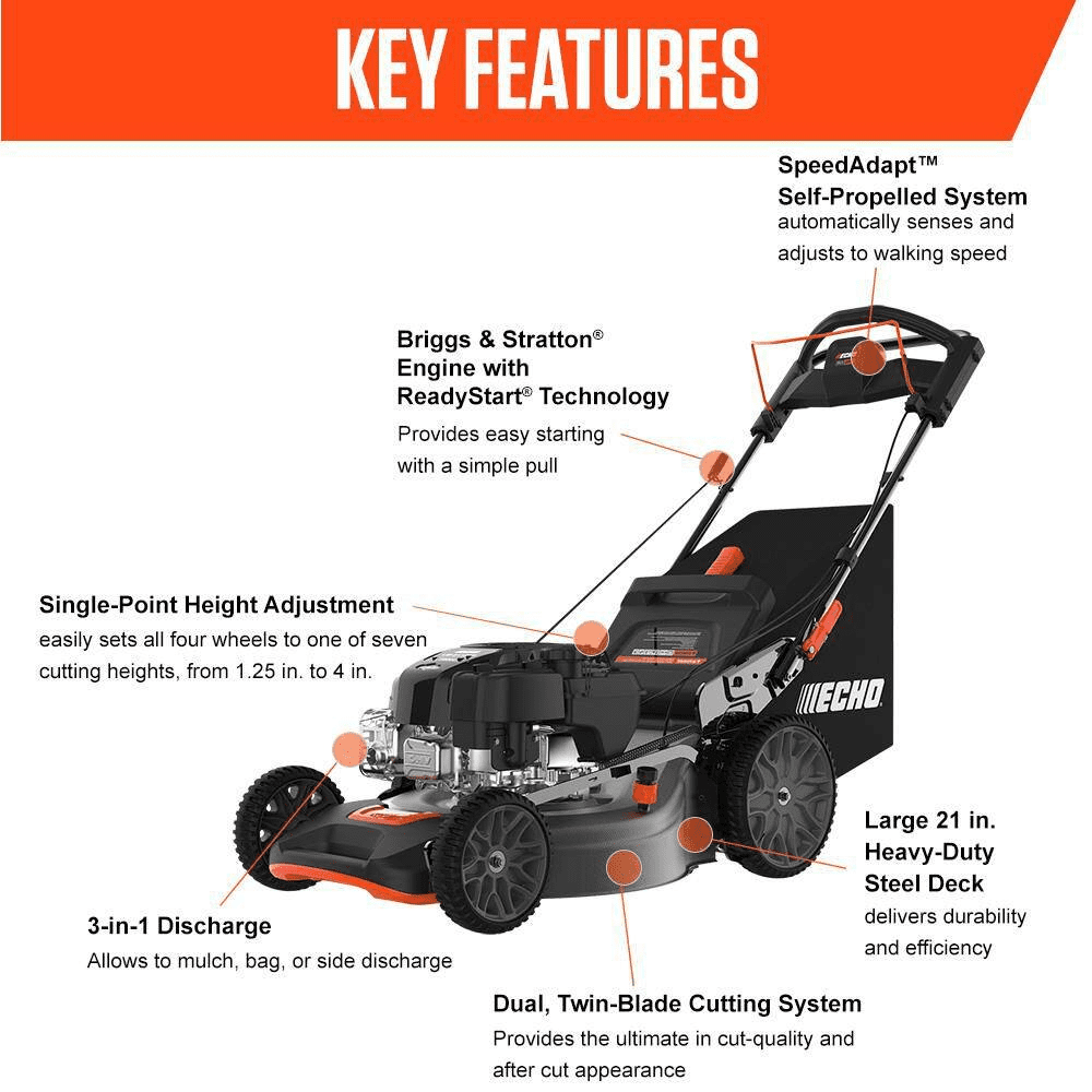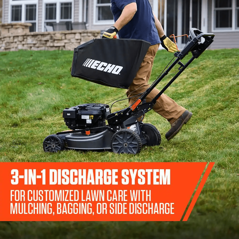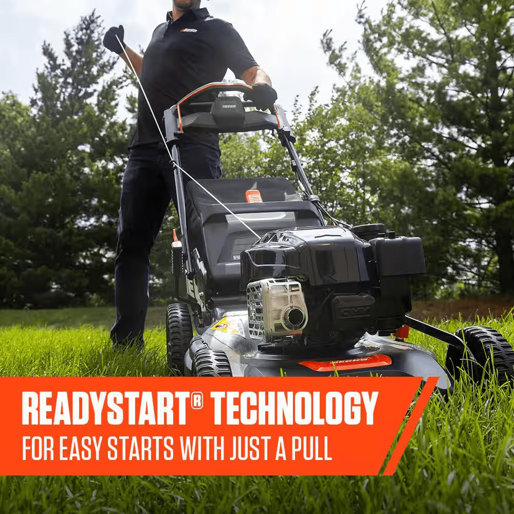 The ECHO LM-2119SP Self-Propelled Lawn Mower is built for efficiency and power, ideal for lawns up to an acre. Powered by a robust 190 cc Briggs & Stratton engine, it features a variable speed self-propelled system and Mow N’ Stow for convenient storage. It’s large 21 in. heavy-duty steel deck covers more area quickly, while the 3-in-1 cutting system provides options for mulching, bagging or side discharge. With dual blades and adjustable mowing height, the LM-2119SP mower ensures excellent performance on various terrains with ReadyStart technology allowing easy start every time.