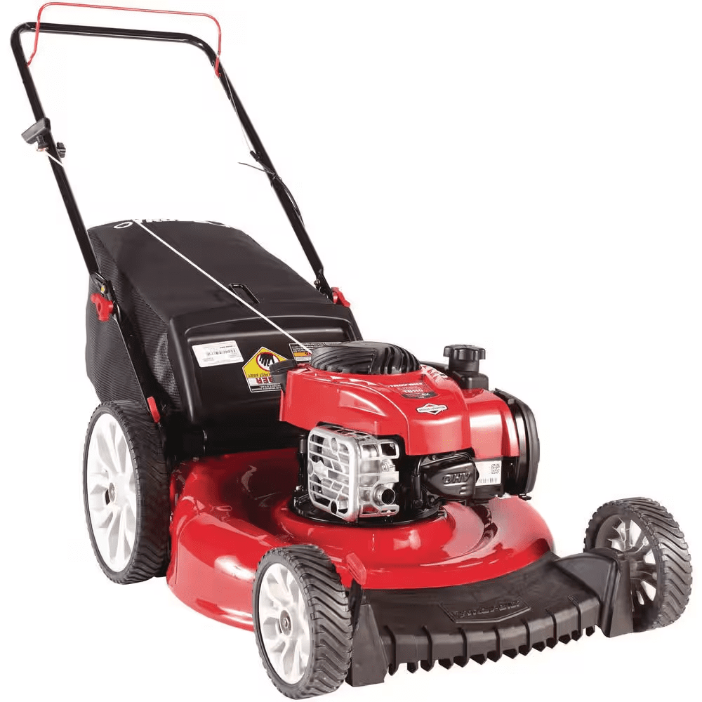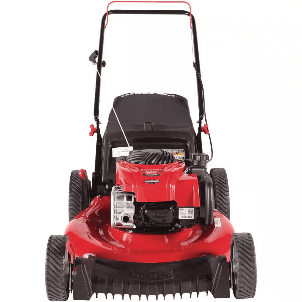 The Troy-Bilt TB110 walk-behind lawn mower features an easy starting, no choke, no prime, Briggs and Stratton engine with ReadyStart(TM). With rear bag and mulch kit included, you have a choice for disposing of grass clippings. The 11 in. high rear wheels provide improved traction and maneuverability on hills and over rough spots in the lawn. Dual-lever height adjusters are conveniently located to quickly adjust the cutting height and the TriAction cutting system uses a rake guard, symmetrical deck and specialized blade to deliver a clean, even cut every time. You can depend on Troy-Bilt to keep yardwork from feeling like a chore, and we won’t let you down.