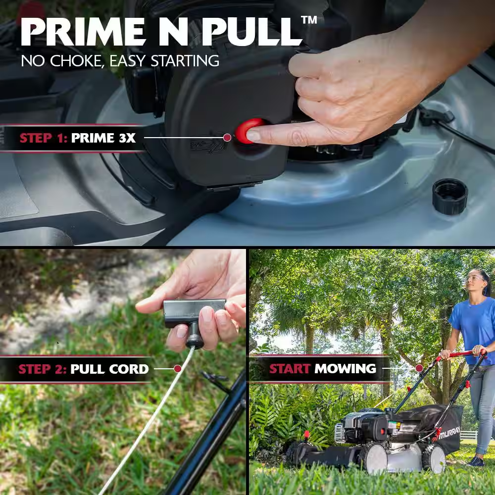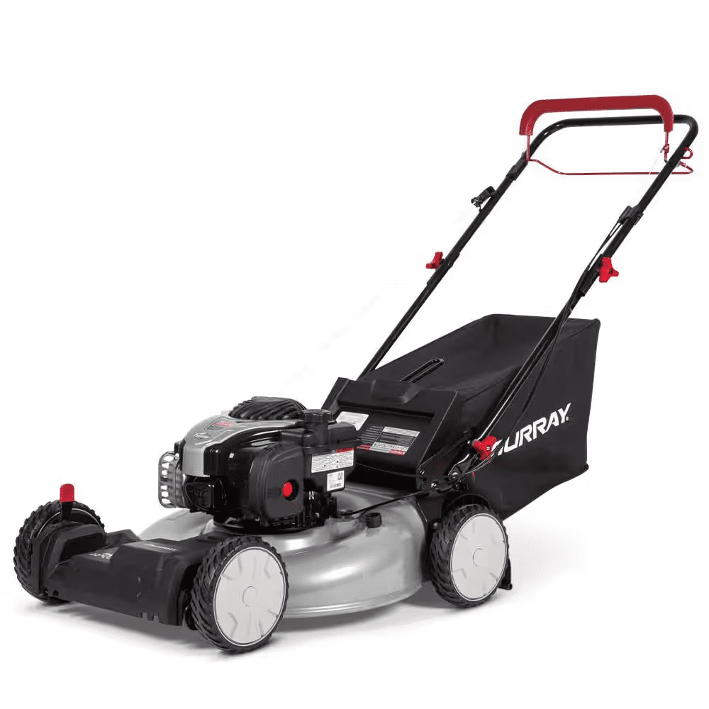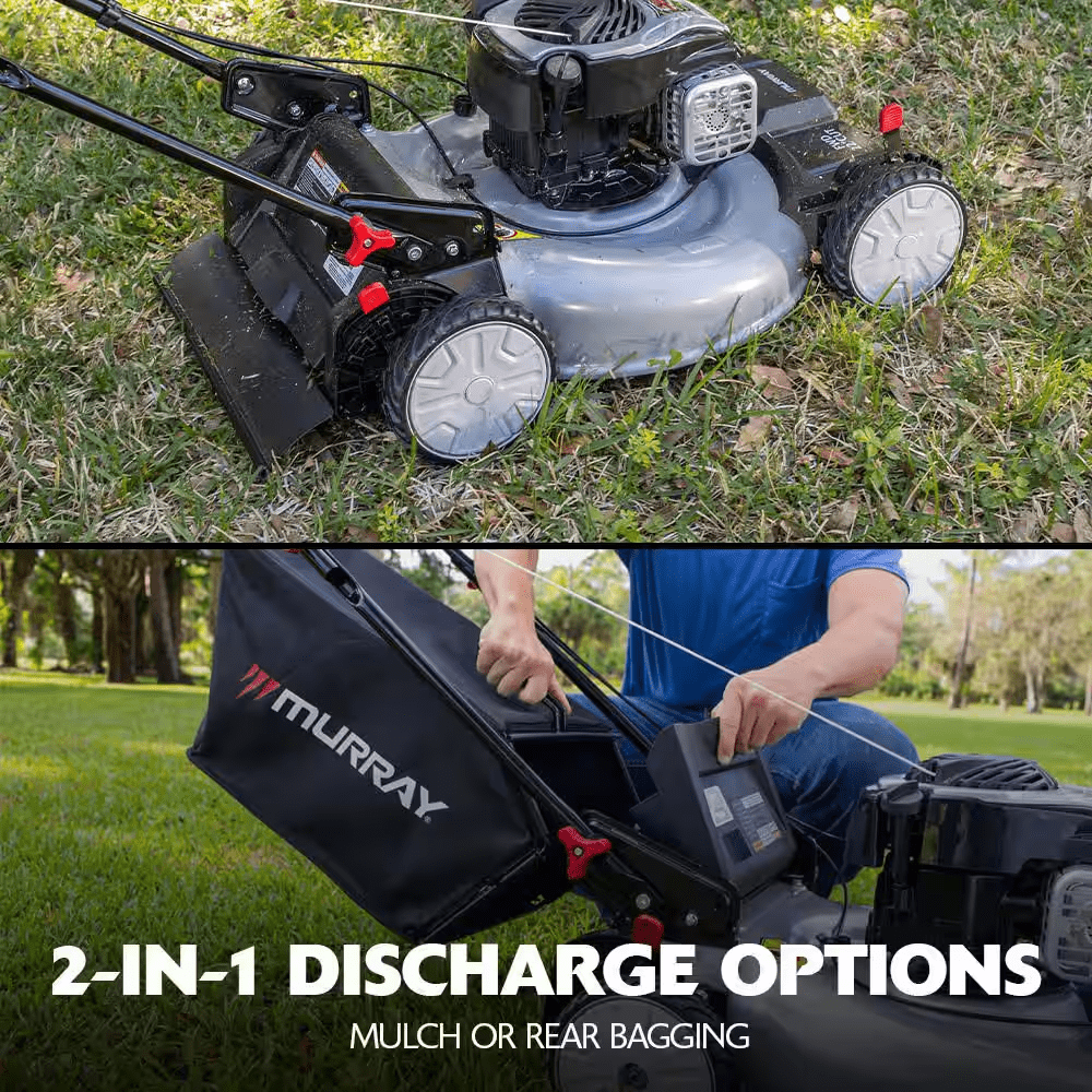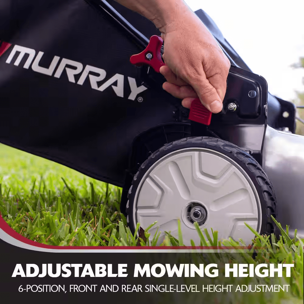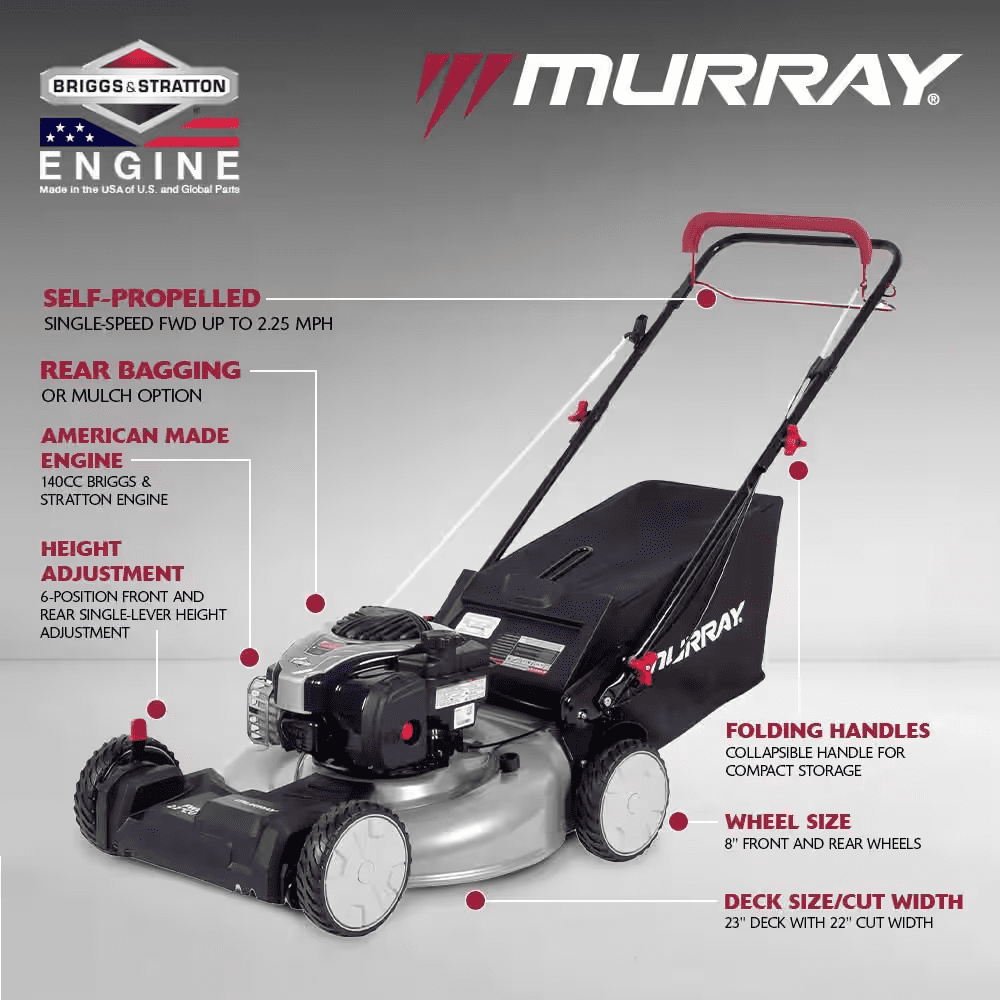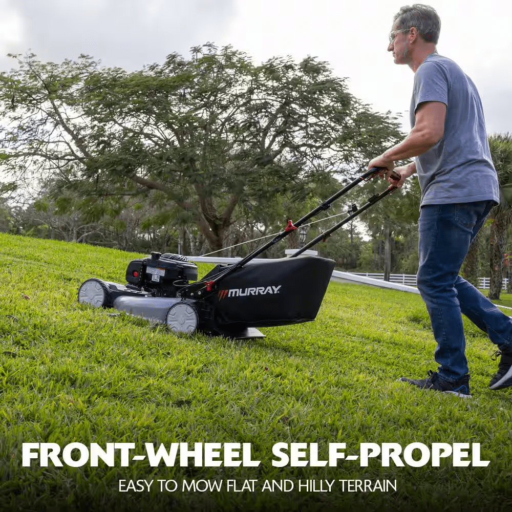 The Murray 22-in. self-propelled gas mower features user-friendly technology, making it easy to tackle any yard project. Powered by a robust 140cc Briggs & Stratton engine, this self-propelled, front-wheel-drive mower is ideal for both flat lawns and hilly landscapes. The versatile 2-in-1 discharge system lets you choose between mulching and rear-bagging grass clippings. Customize each mowing session with 6 cutting height positions ranging from 1.2in. – 3.75in. and single-lever front and rear wheel adjustments. Built for efficiency and durability, the Murray 22in. self-propelled gas-powered mower is the perfect choice for homeowners seeking a reliable and easy-to-use lawn mower. Murray: Get it done. Go have fun.