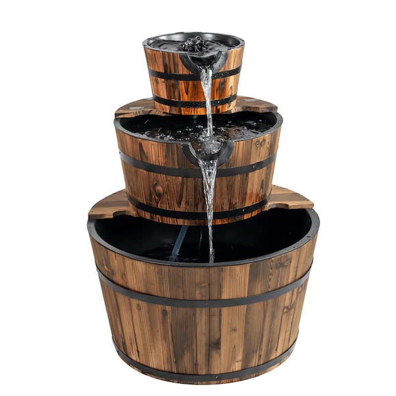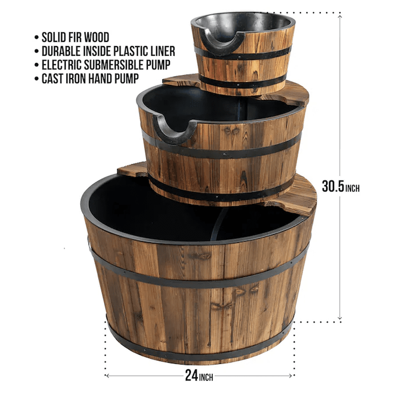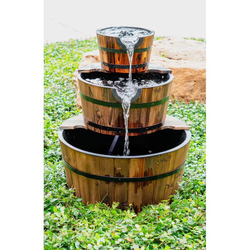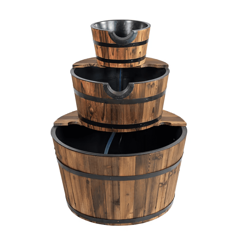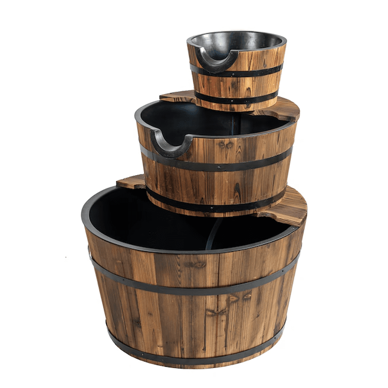 This gorgeous wood 2-tier water barrel fountain is made with real wooden barrels and the resin inserts allow it to handle the elements for a long life in your garden.