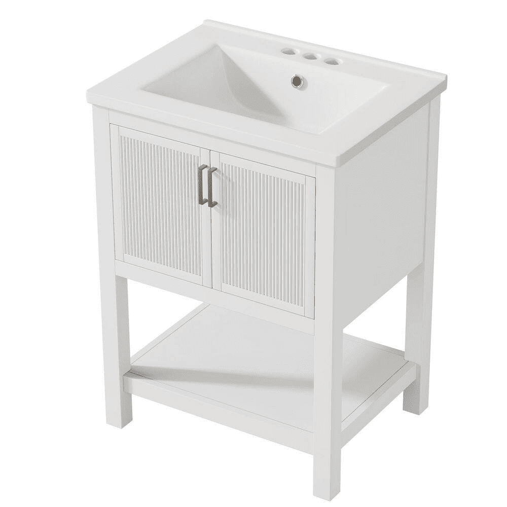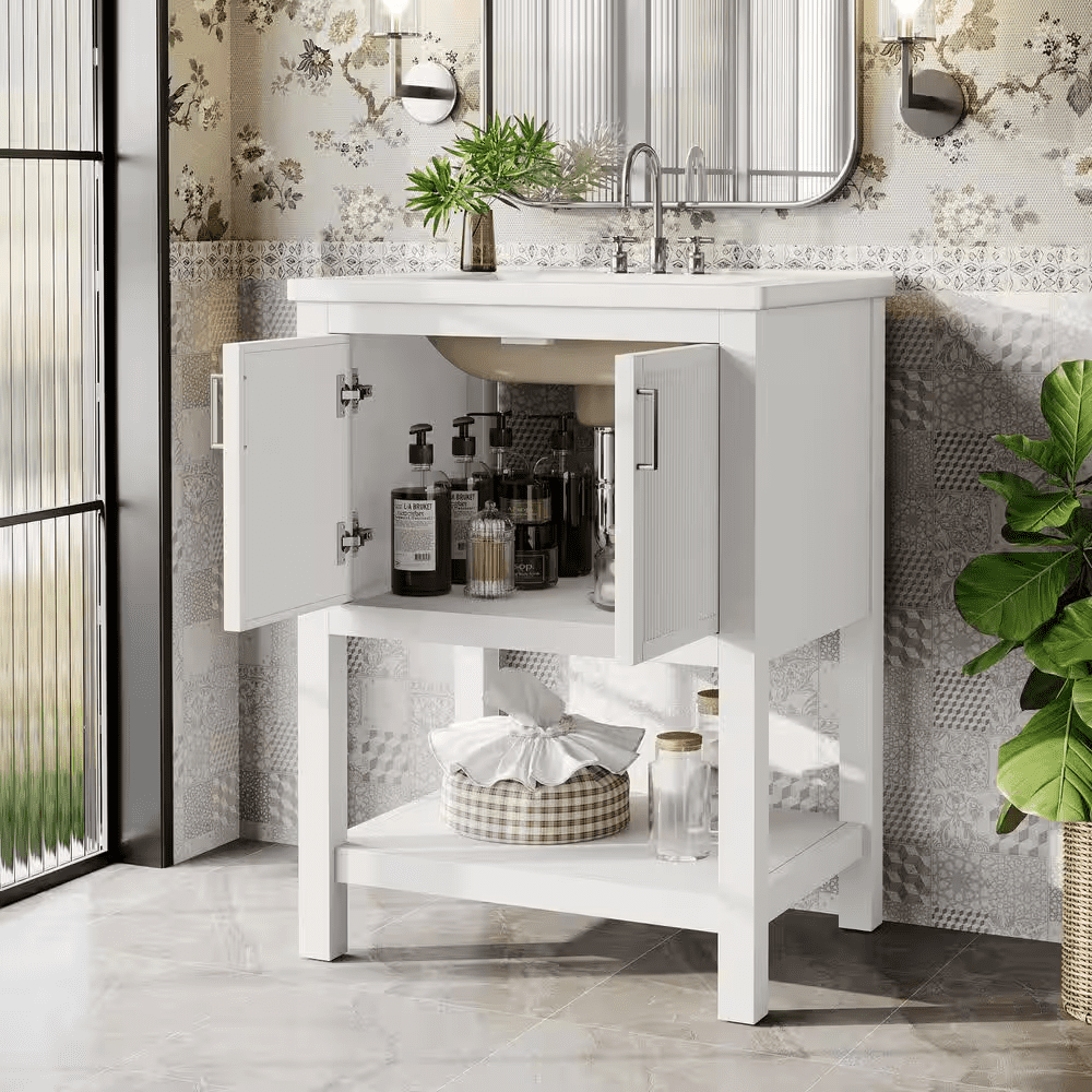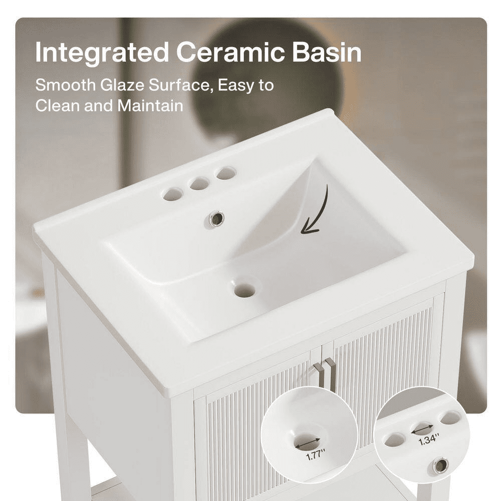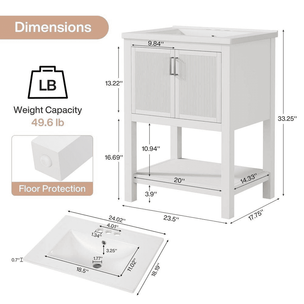 As a professional supplier in the furniture industry for 14 years, we have always pursued our mission: “Creating a better life for the public.” We not only focus on the product’s functionality but also integrate the design aesthetics into it.Here is the new modern bathroom cabinet from BYBLIGHT. Designed with functionality and style in mind, this bathroom cabinet features a spacious open shelf at the bottom and a double-door cabinet above, providing ample, organized storage space for toiletries, cleaning supplies, and more. The smooth ceramic sink is easy to clean and resists water stains effectively. Equipped with 3 pre-drilled faucet holes and an overflow outlet, it ensures seamless installation. Constructed from sturdy MDF and rubber wood, the cabinet offers strong support, with a weight capacity of 49.6 lbs. The painted surface is water-resistant, so you don’t have to worry about splashing water causing damage while showering or washing your face. Its pure white finish, paired with elegant metal handles, adds a modern and sophisticated touch to your bathroom. We provide an 18-month warranty. If you have any product problems, please feel free to contact us.