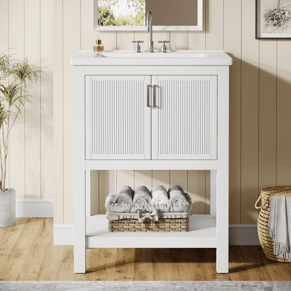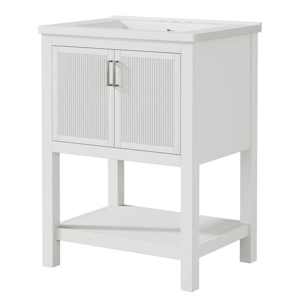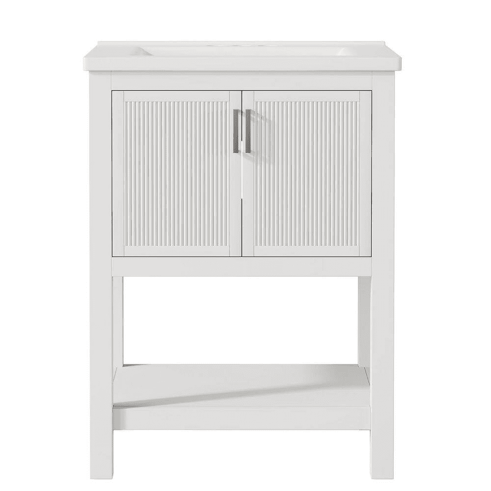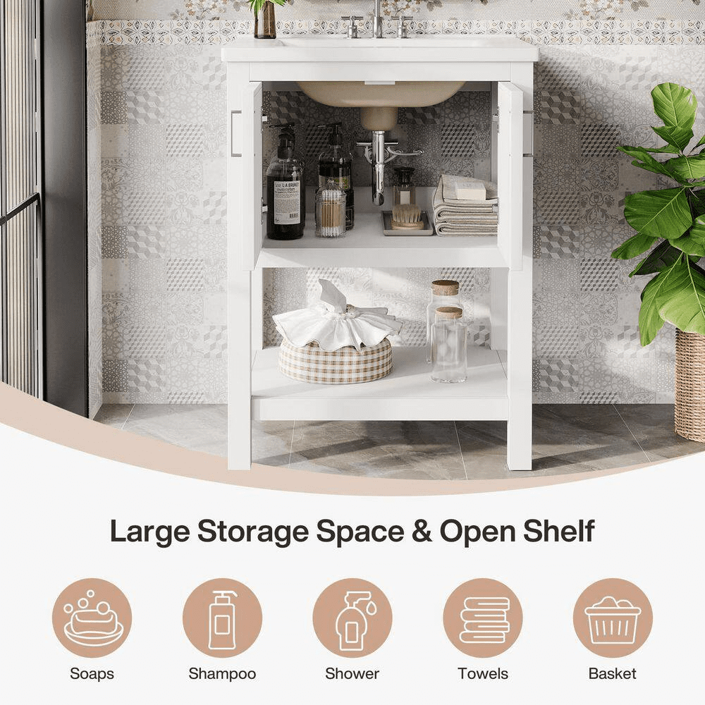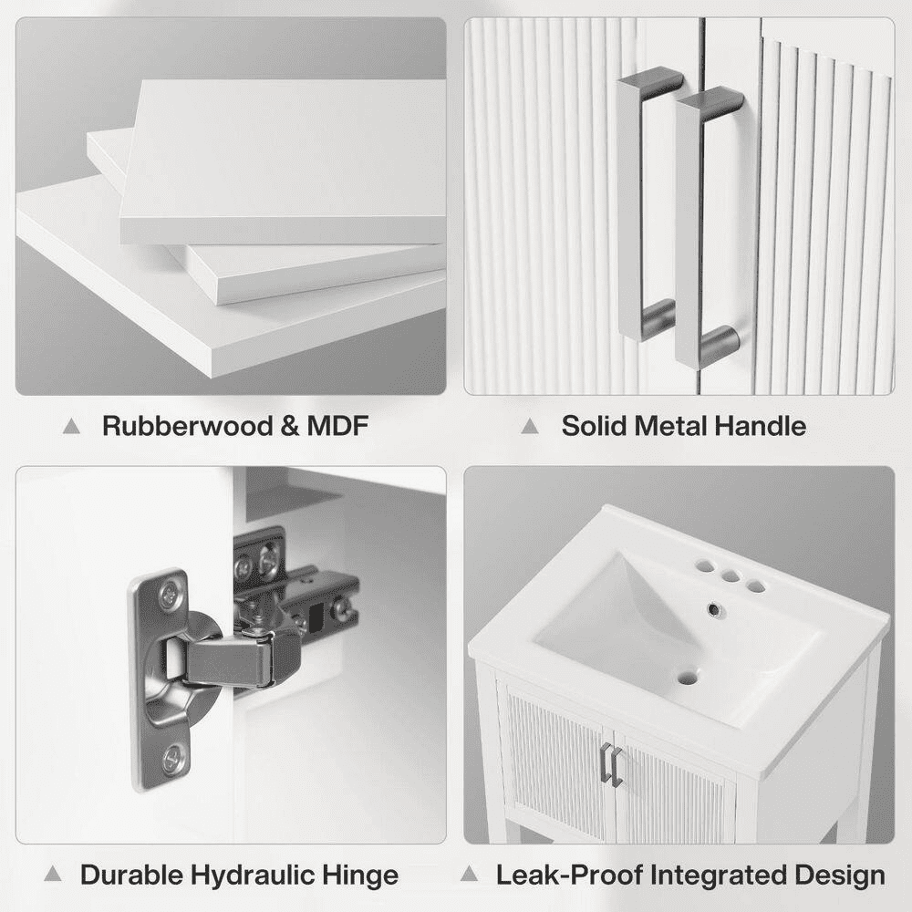 As a professional supplier in the furniture industry for 14 years, we have always pursued our mission: “Creating a better life for the public.” We not only focus on the product’s functionality but also integrate the design aesthetics into it.Here is the new modern bathroom cabinet from BYBLIGHT. Designed with functionality and style in mind, this bathroom cabinet features a spacious open shelf at the bottom and a double-door cabinet above, providing ample, organized storage space for toiletries, cleaning supplies, and more. The smooth ceramic sink is easy to clean and resists water stains effectively. Equipped with 3 pre-drilled faucet holes and an overflow outlet, it ensures seamless installation. Constructed from sturdy MDF and rubber wood, the cabinet offers strong support, with a weight capacity of 49.6 lbs. The painted surface is water-resistant, so you don’t have to worry about splashing water causing damage while showering or washing your face. Its pure white finish, paired with elegant metal handles, adds a modern and sophisticated touch to your bathroom. We provide an 18-month warranty. If you have any product problems, please feel free to contact us.