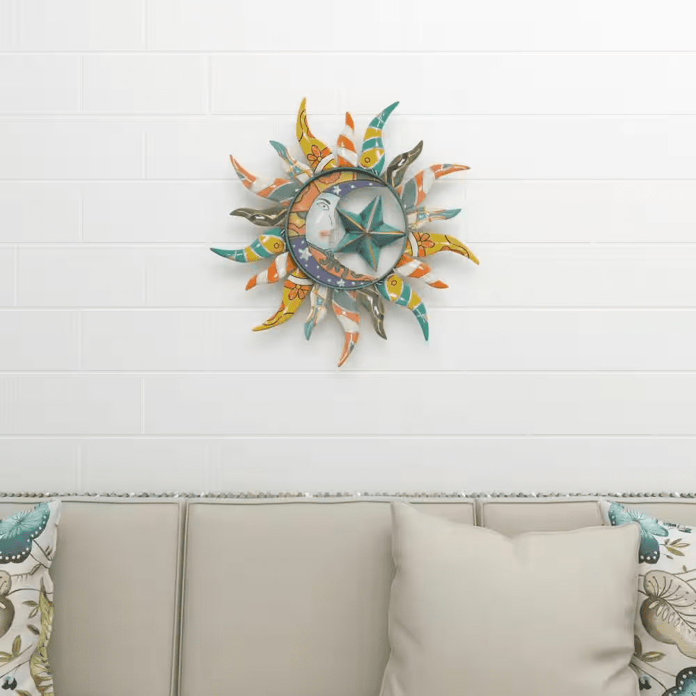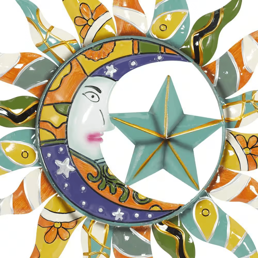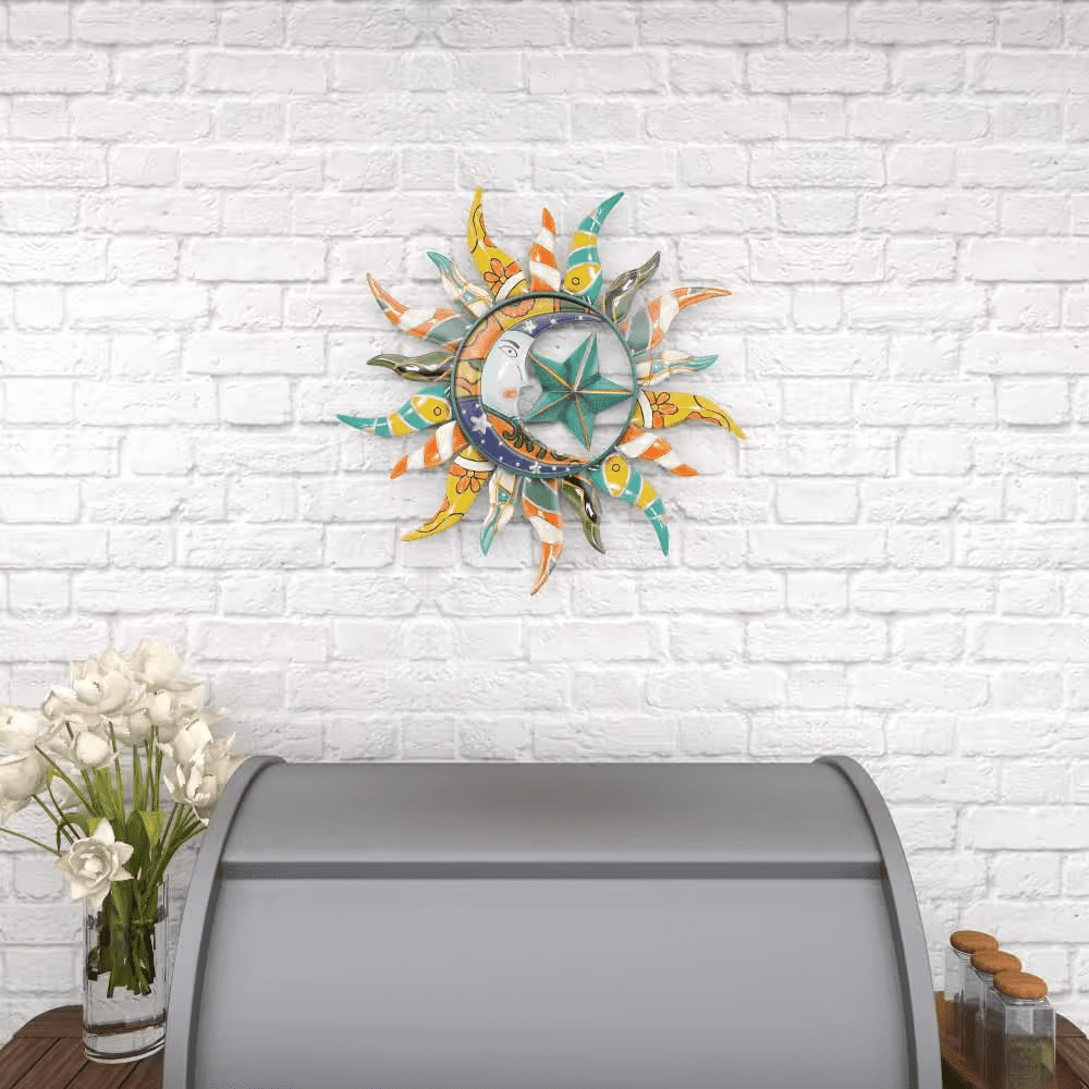 Create a balanced space in the most creative way with this expertly crafted wall decor for captivating focal point. Showcase your personality and turn your walls into an art gallery with this captivating wall decor. Create a boho inspired wall scenery with this colorful sun, moon, and star sculpture and transform your room into a playful nature art set. This item ships in 1-carton. Iron wall decor makes a great gift for any occasion. Can be hung vertically using the keyholes on the back; nails and screws not included. Suitable for indoor use only. This item ships fully assembled in 1-piece. This is a single multi colored wall sculptures. Eclectic style.