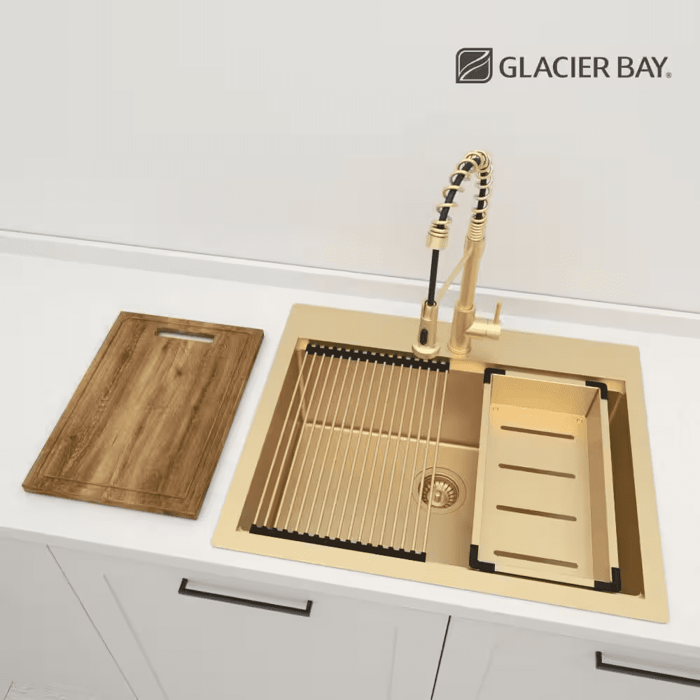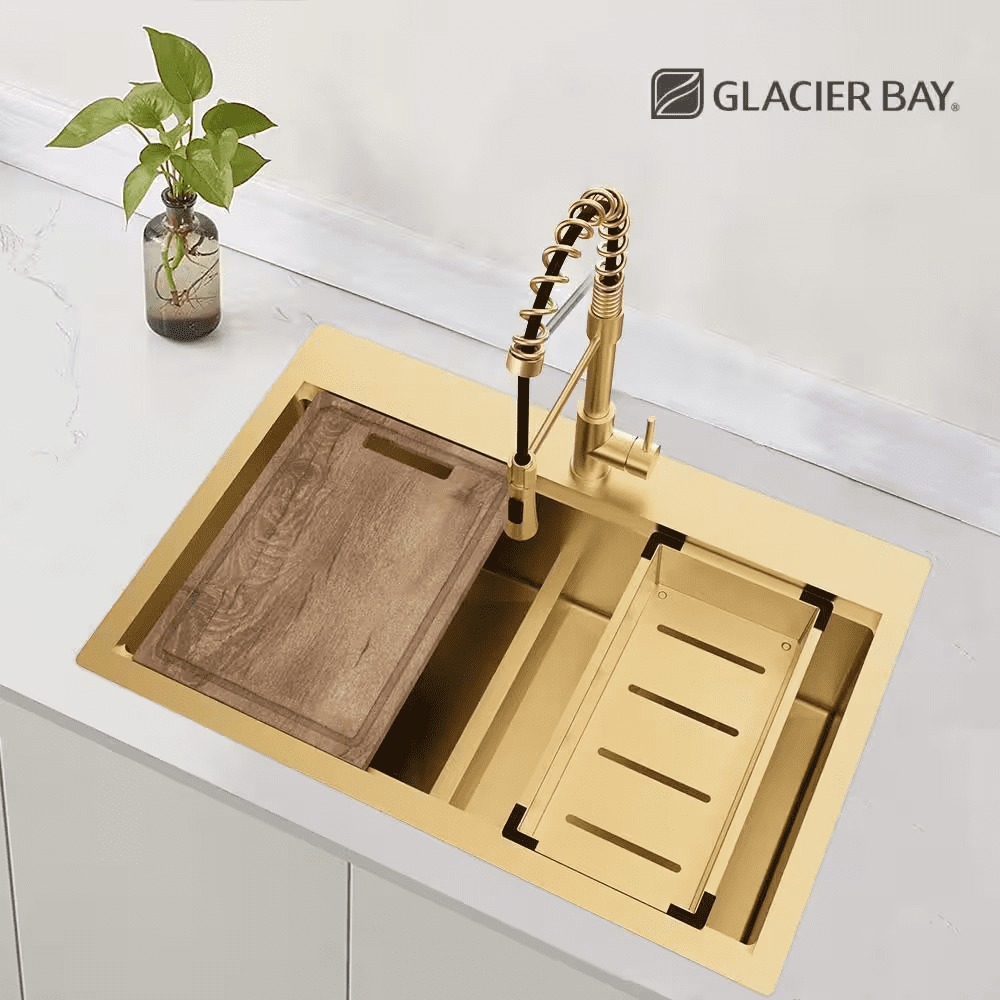 This workstation sink brings colored stainless steel to Glacier Bay’s popular workstation. This sink is manufactured with innovative PVD technology, creating a durable and lasting coating over lasting stainless steel material. The gold color and functionality of a workstation sink takes your kitchen space to a new level. Built-in accessories sit and slide on your sink for multi-tasking and additional counter-top space. If you enjoy cooking like a professional chef, then this is the sink for you.