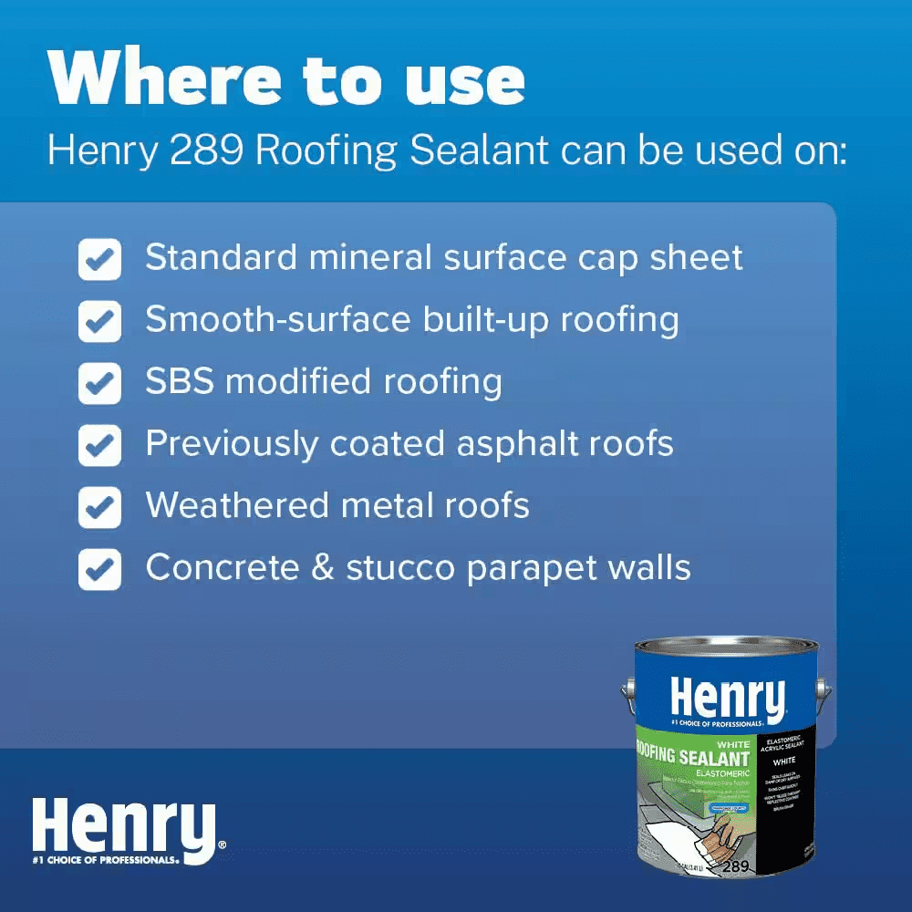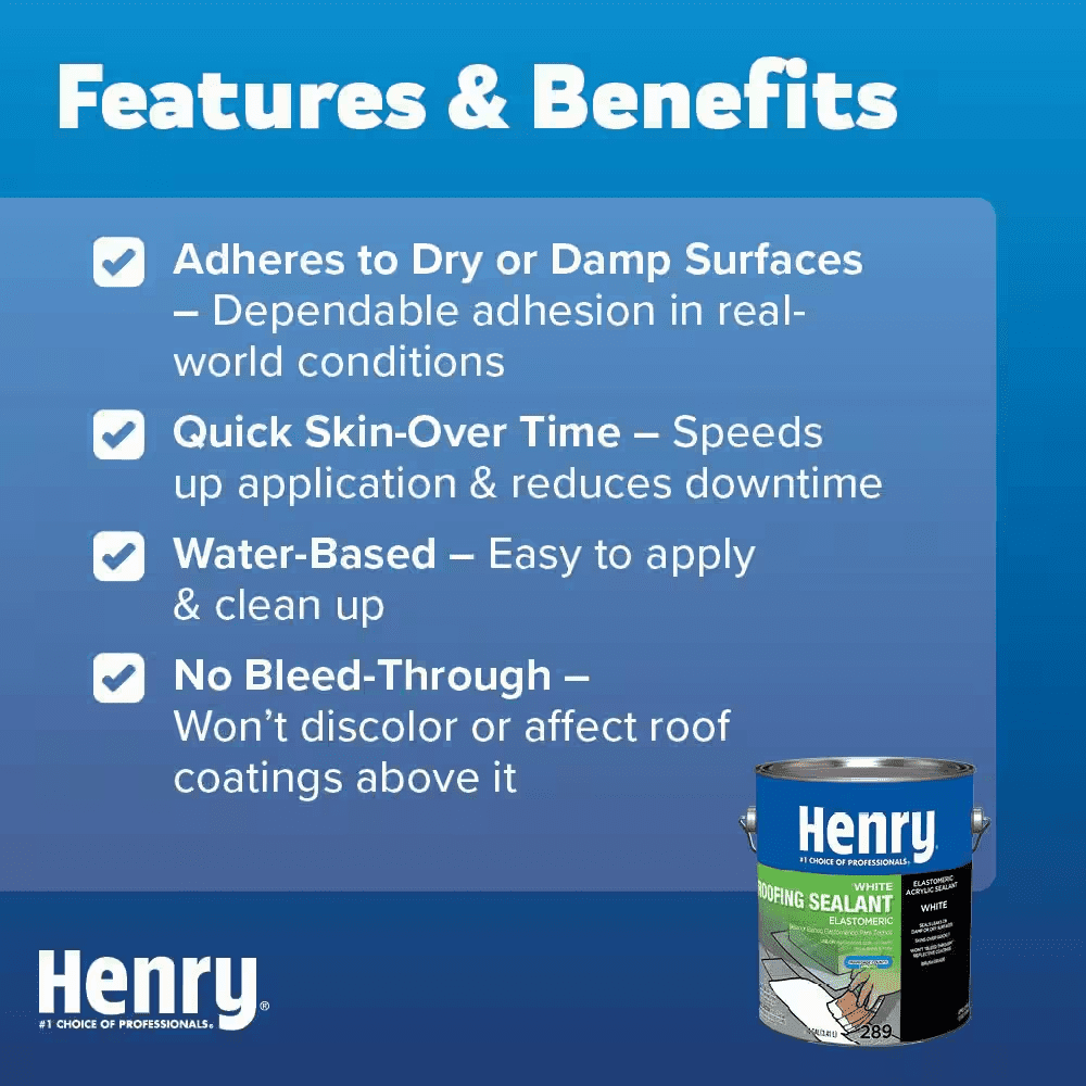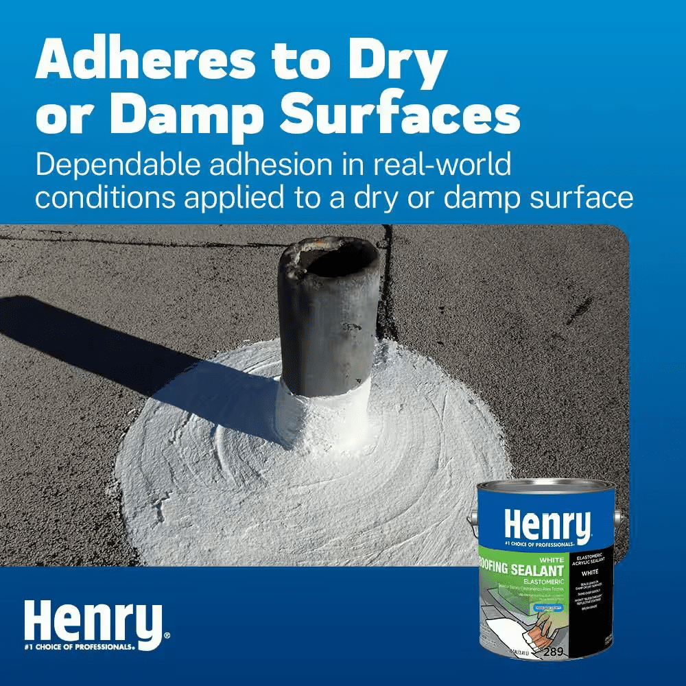 Henry 289 White Roofing Sealant is specially formulated to prevent and repair roof leaks when applied to a dry or damp surface. Its thick water-based formula provides excellent adhesion on a variety of surfaces. This product is also suitable for use with acrylic roof coatings.