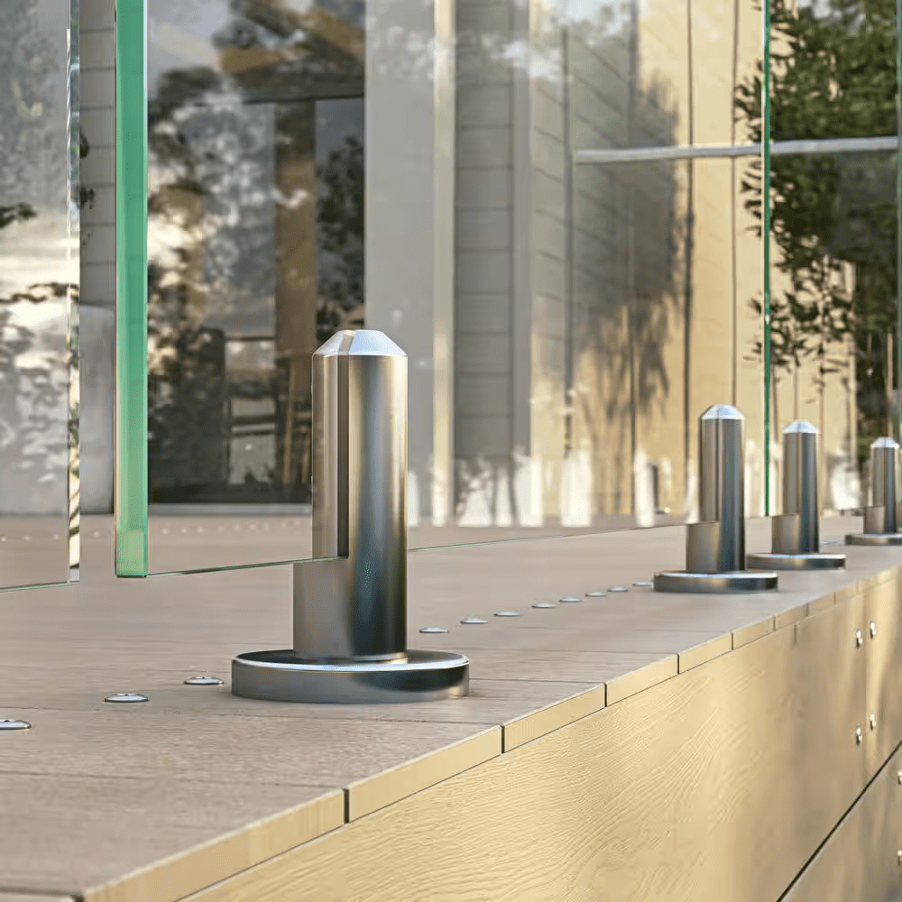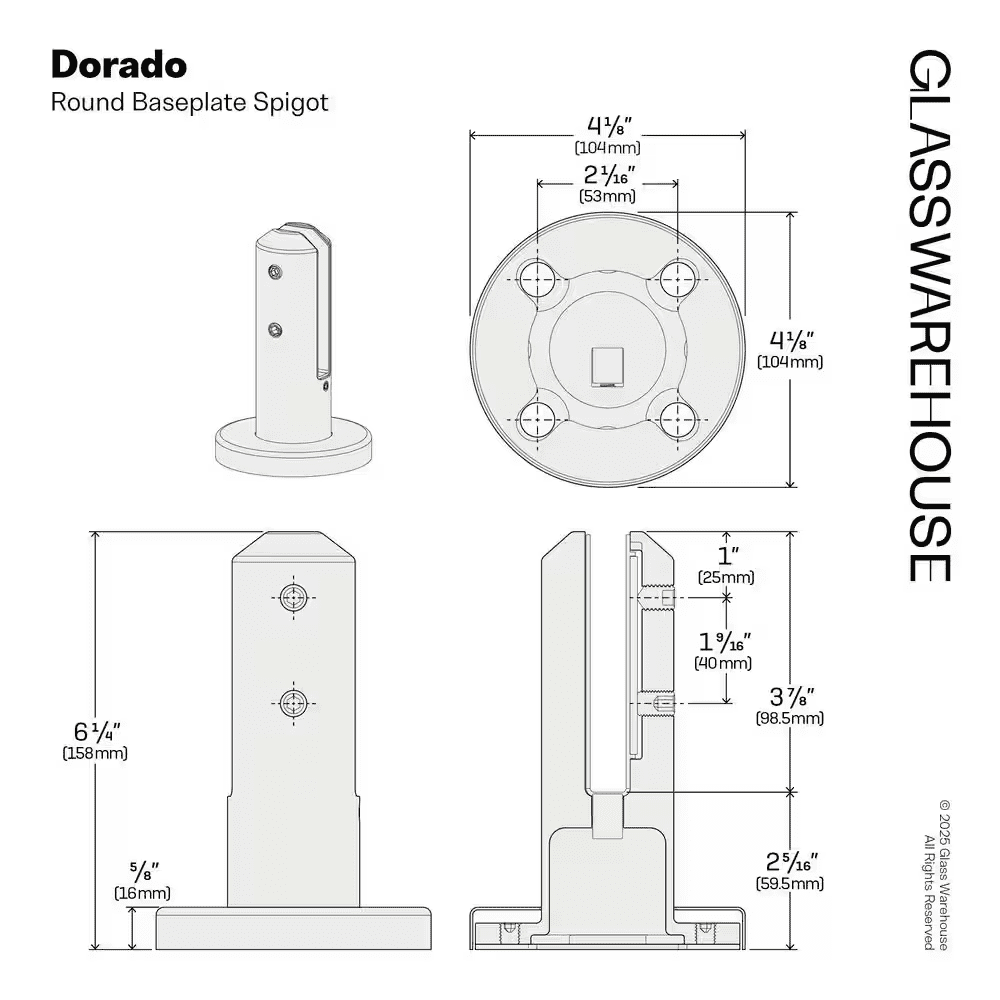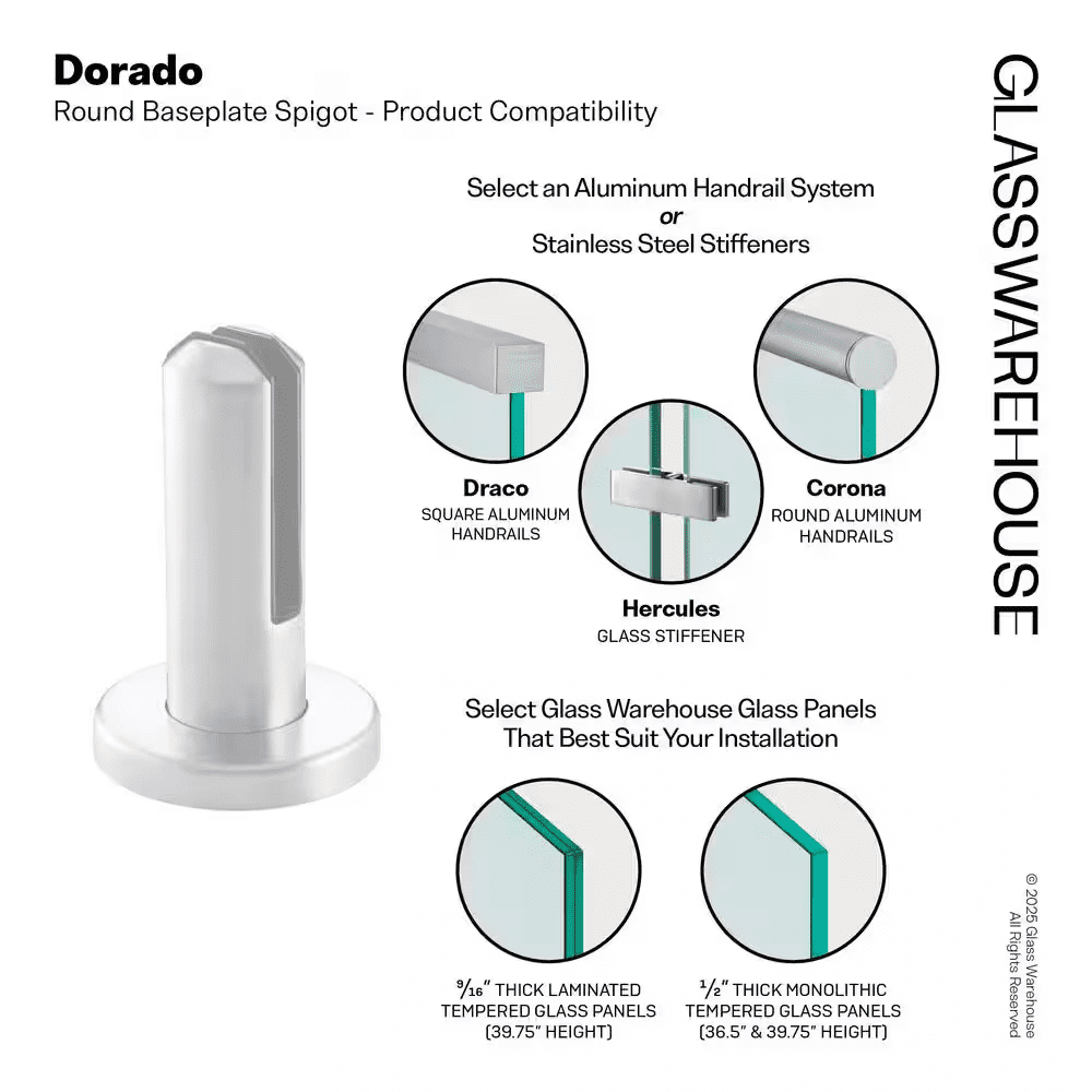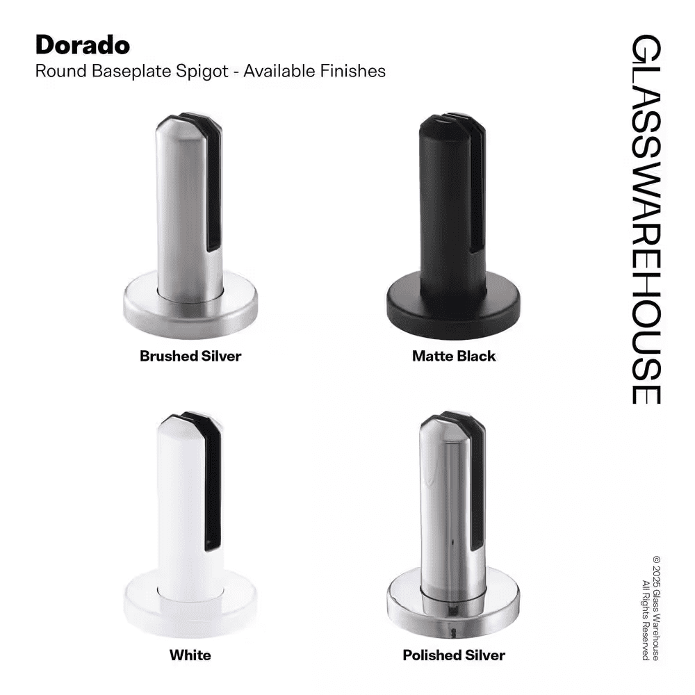 The Dorado is a round baseplate spigot designed with a circular, clean modern appearance. It is designed for surface mounted applications to achieve a fully frameless glass aesthetic, while being engineered to US glass railing standards. Made from the highest grade 2205 Duplex Stainless Steel, it provides the best protection for outdoor applications.