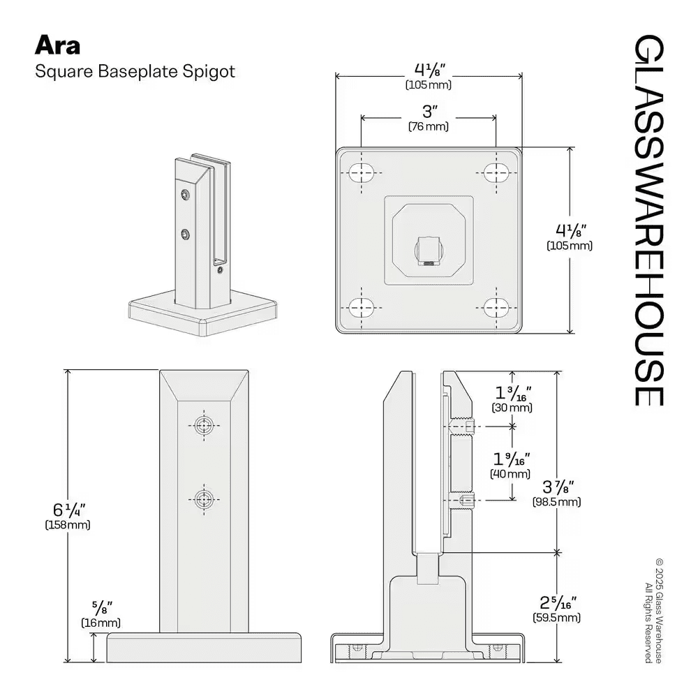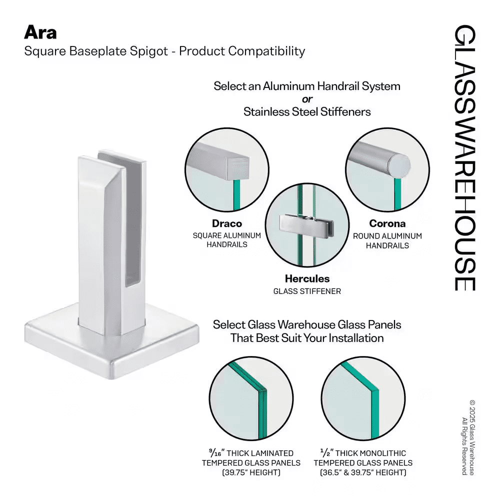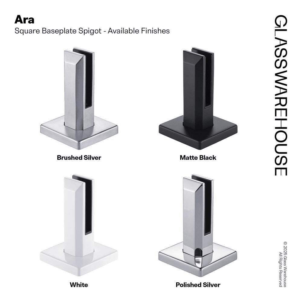 The Ara is a square baseplate spigot designed with rectangular, clean modern lines. It is designed for surface mounted applications to achieve a fully frameless glass aesthetic, while being engineered to US glass railing standards. Made from the highest grade Duplex 2205 Stainless Steel, it provides the best protection for outdoor applications.
