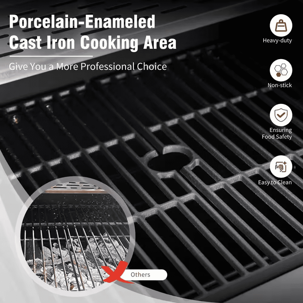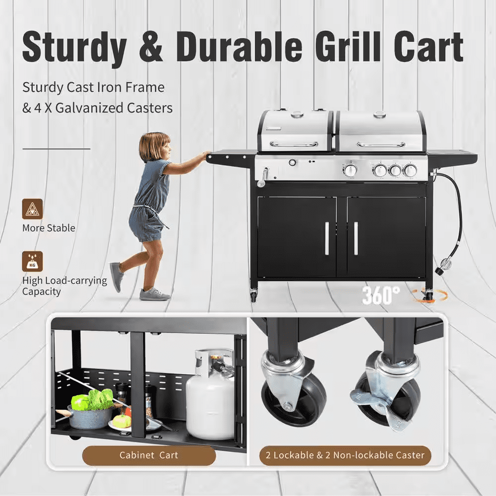 If you love to cook with convenience, this combo grill will be the best choice for your outdoor cooking needs. It can dominate the backyard barbecues game not only because they can be portable but also because they’re easy to operate. You can experience both charcoal grilling and gas grilling in 1 unit. 3 burners along with a side burner, you will be able to cook different kind of food you like. The double-layer lid can keep more heat. The gas and charcoal grill is equipped with cast iron cooking grates which are healthier, environmental friendly and very easy to clean. with the built-in side burner you can prepare side dishes or individual dishes at the same time. Inside the enclosed cabinet there is space for storing the gas tank and barbecue accessories. The regulator and hose are included.