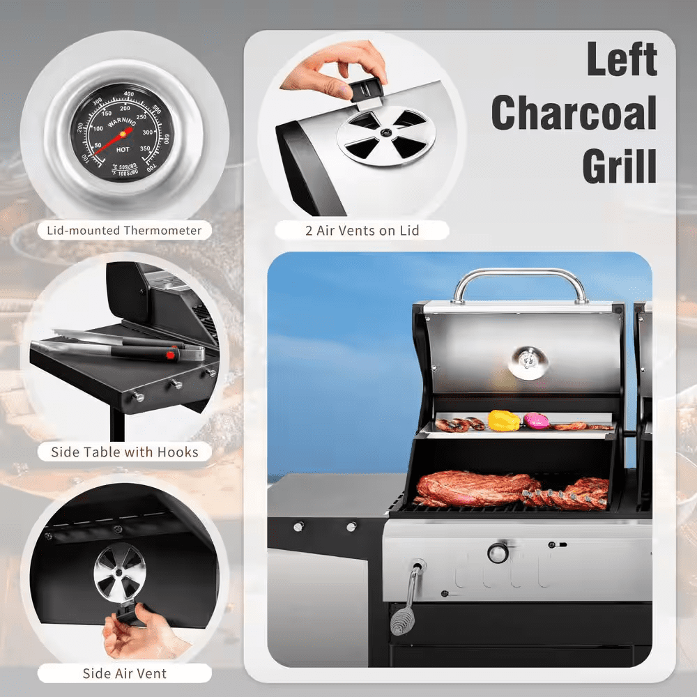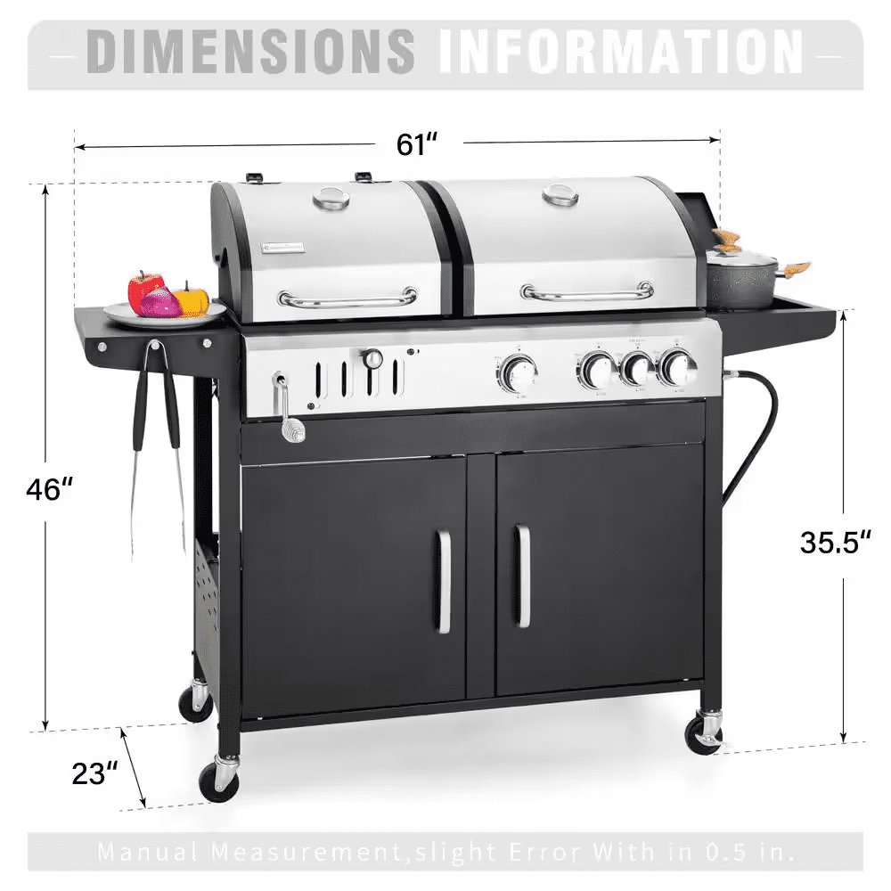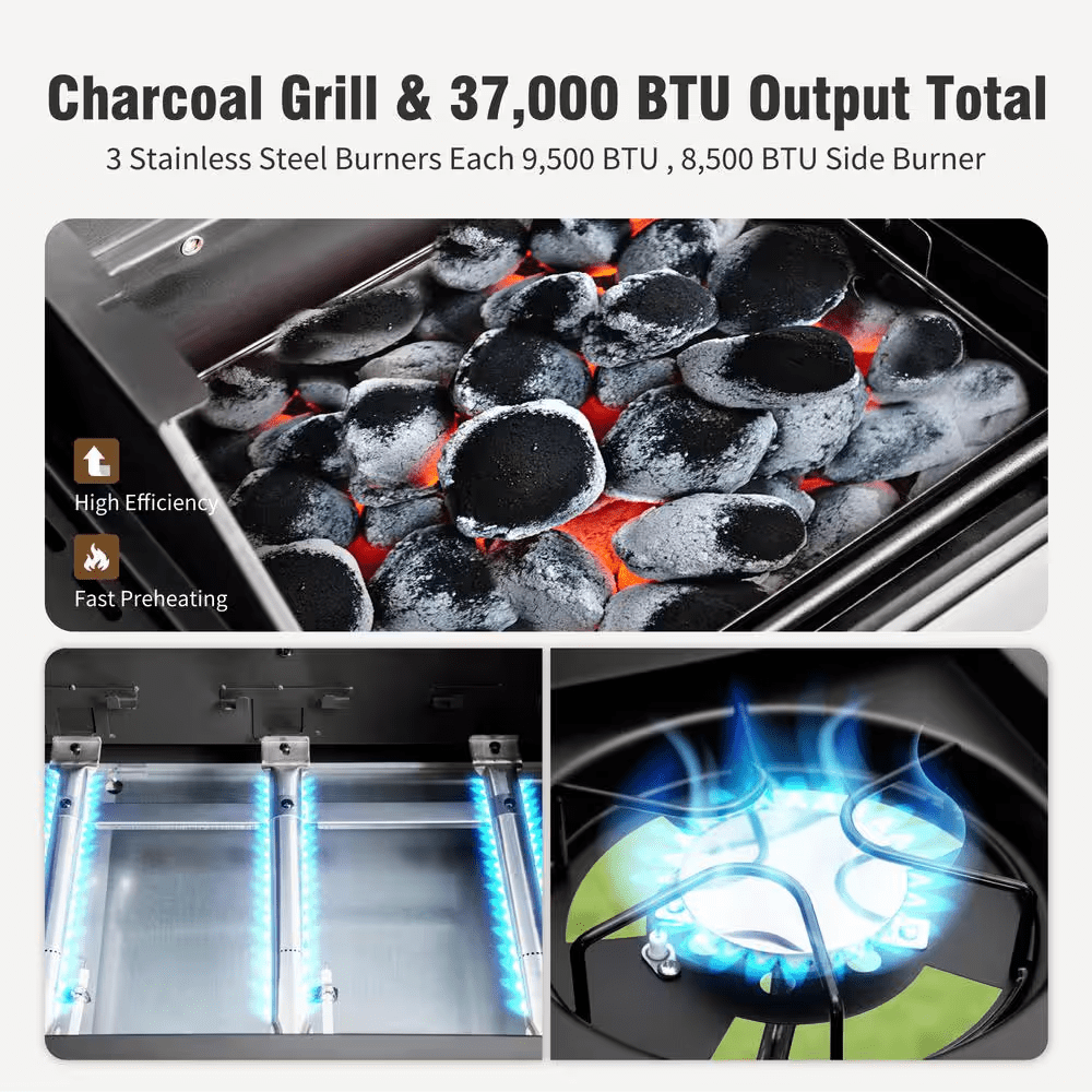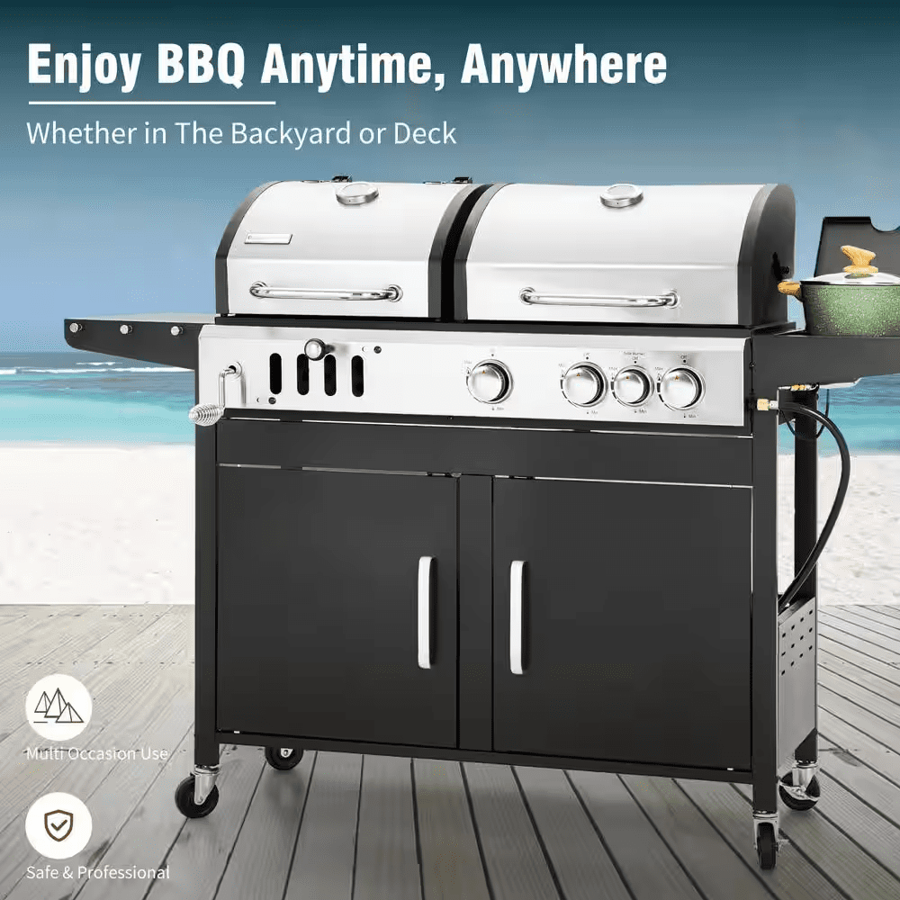 3-Burner Dual Fuel Grill Propane and Charcoal in Black with Side Burner Hose and Regulator
