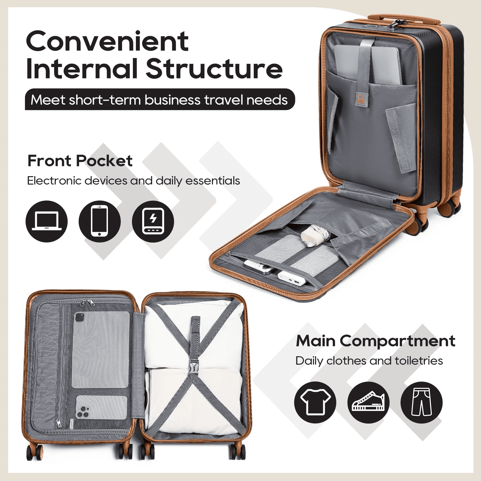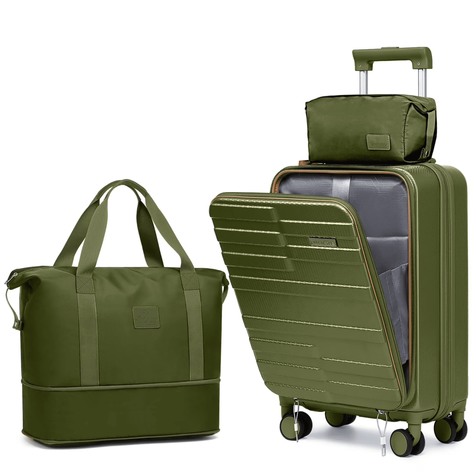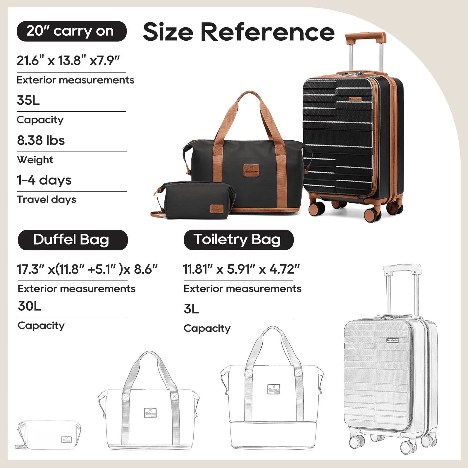 - Made of ABS material, this luggage set strikes a perfect balance between lightweight construction and durability. The hard shell surface protects against scratches, making it an ideal choice for both business and personal travel. The 20-inch front-opening carry-on suitcase (13.9″*8.66″*20.4″, 9 lbs) and matching handbag (17.3″ x 16.9″ x 8.6″, 1.3 lbs) and matching toiletry bag (11.8″ x 5.9″ x 4.7″, 0.3 lbs) provide a complete three-piece set to meet all your travel needs.