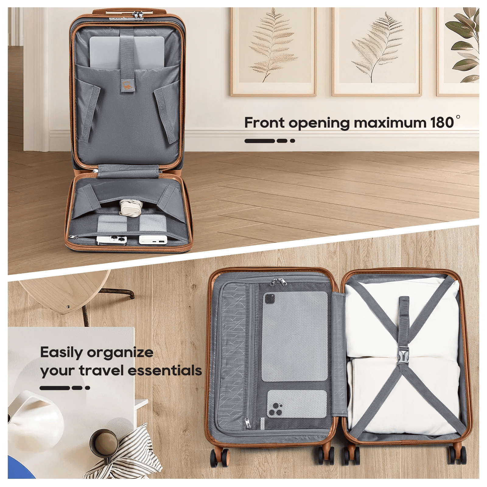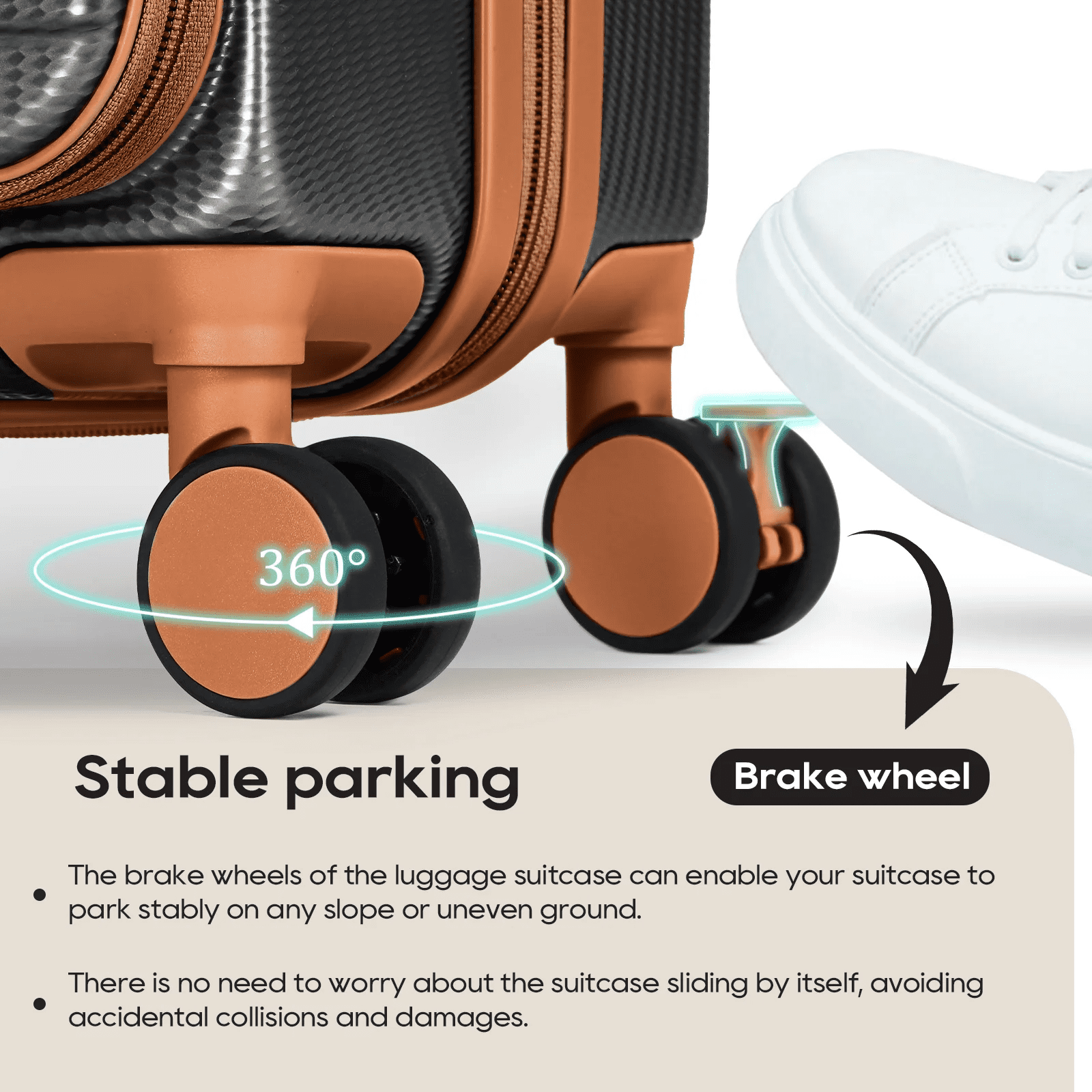 - The carry-on luggage includes 360° brake-rotatable spinner wheels, a full-aluminum three-section telescopic handle, a recessed TSA lock, smooth YKK zippers, soft silicone handles, and four-foot spike hooks, ensuring your journey will be easier and more enjoyable.