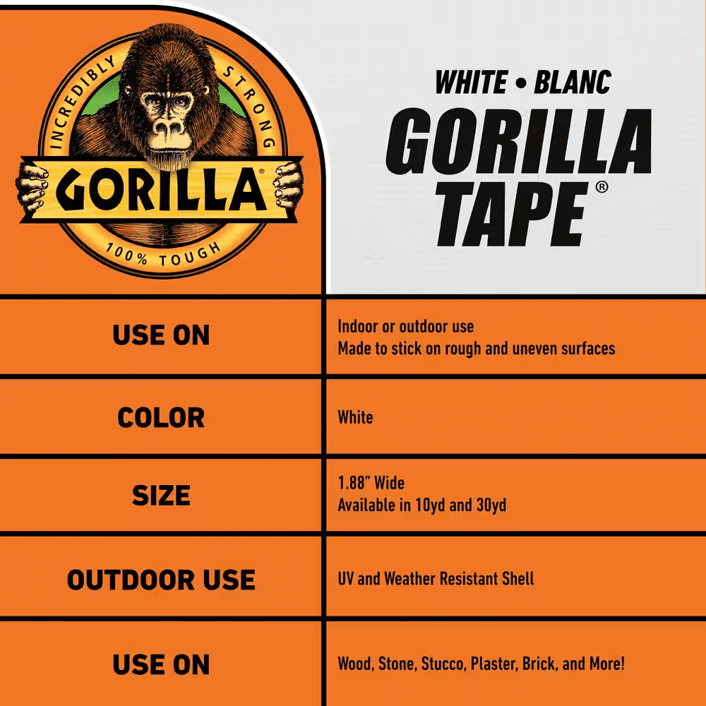 White Gorilla Tape offers over the top results with its triple layer strength and outstanding versatility. It is perfect for both indoor and outdoor use. It features superior UV resistance and ability to grip to rough, uneven, unforgiving surfaces like wood, stone, stucco, plaster, brick and more.