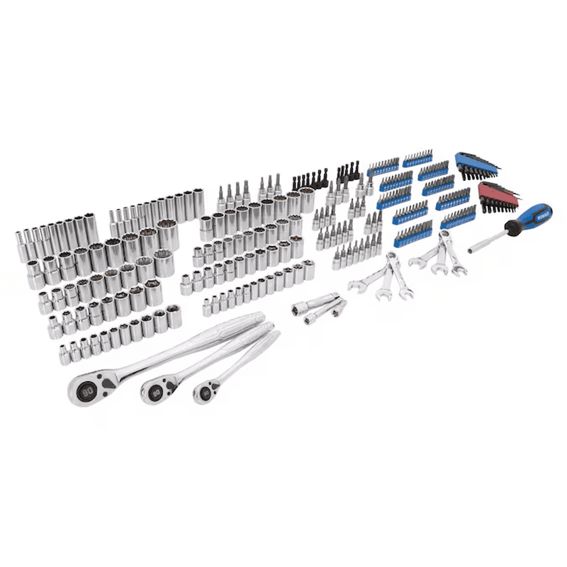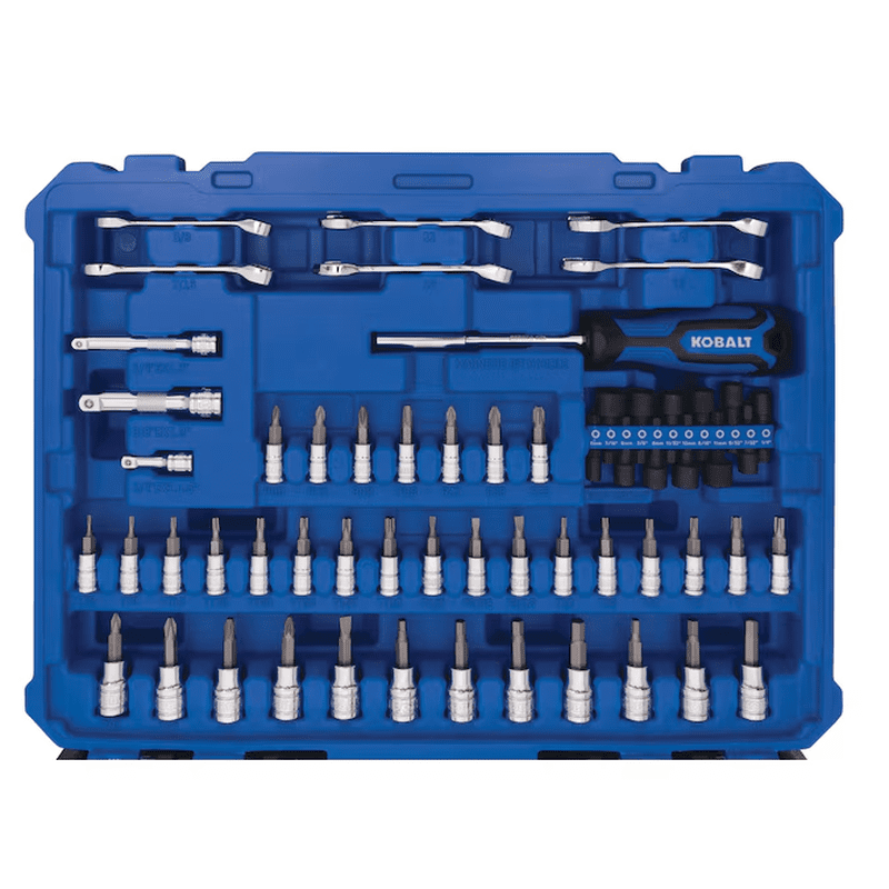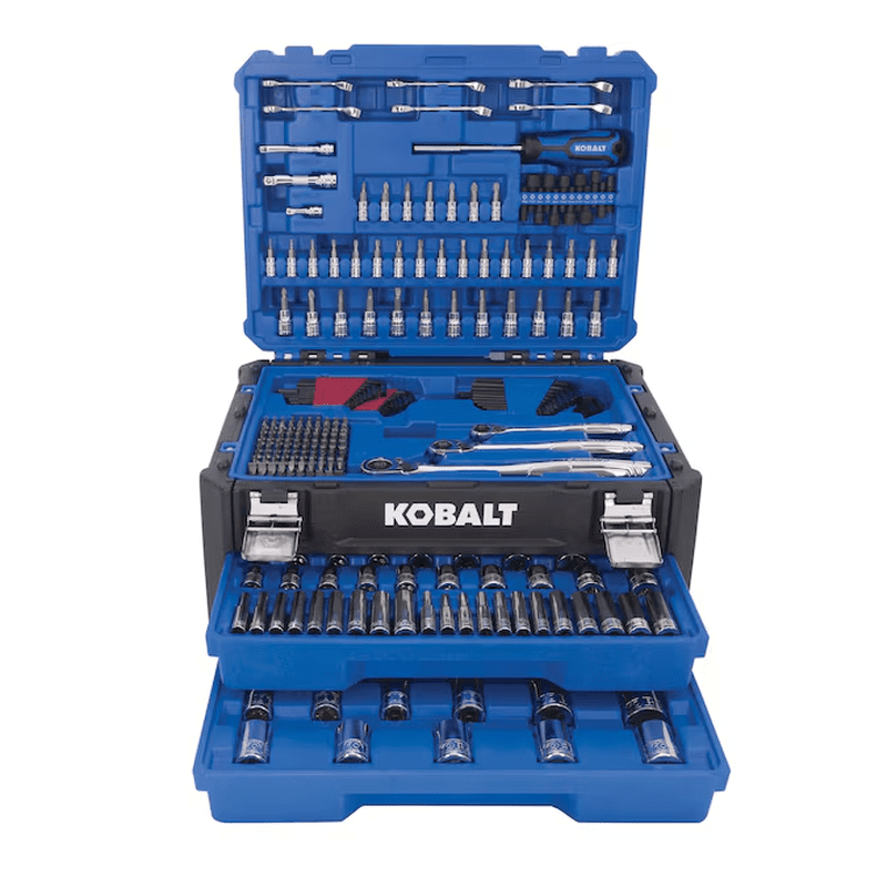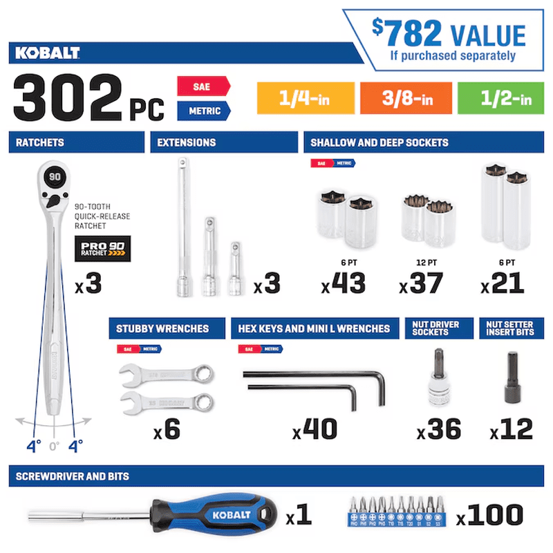- Kobalt’s 302-piece, 3-drive mechanic’s tool set features 1/4-in, 3/8-in and 1/2-in drive sockets, ratchets and other drive tool accessories